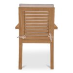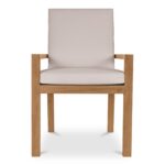The Mateo outdoor dining chair combines comfort and understated style in the outdoor dining area. This foundational piece features a solid teak frame with quick-dry foam cushions upholstered in white 100% Olefin fabric. The slatted back and simple frame create a timeless look, while cushion ties ensure everything stays in place, making it perfect for a sophisticated patio or garden dining set.