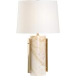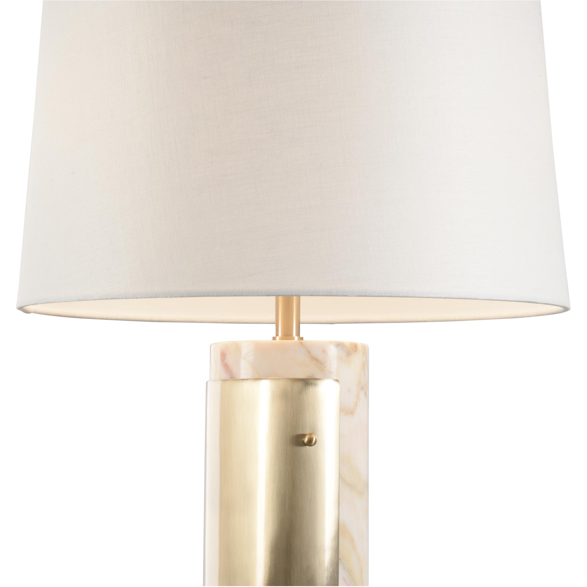 Nestled in a coat of warm coffee bronze metal, a column of natural calacatta gold marble shines, creating an accent lamp perfect for an elegant modern space. An off white linen shade completes the neutral design and allows ambiant light to highlight the existing decor.
