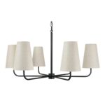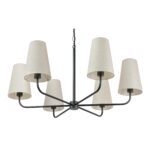 The Mathis chandelier’s sleek metal frame and delicate chain detailing create an illusion of weightlessness, while six tapered linen shades diffuse a warm, inviting glow. This chandelier marries simplicity with sophistication, complementing various interior styles, from contemporary to transitional.