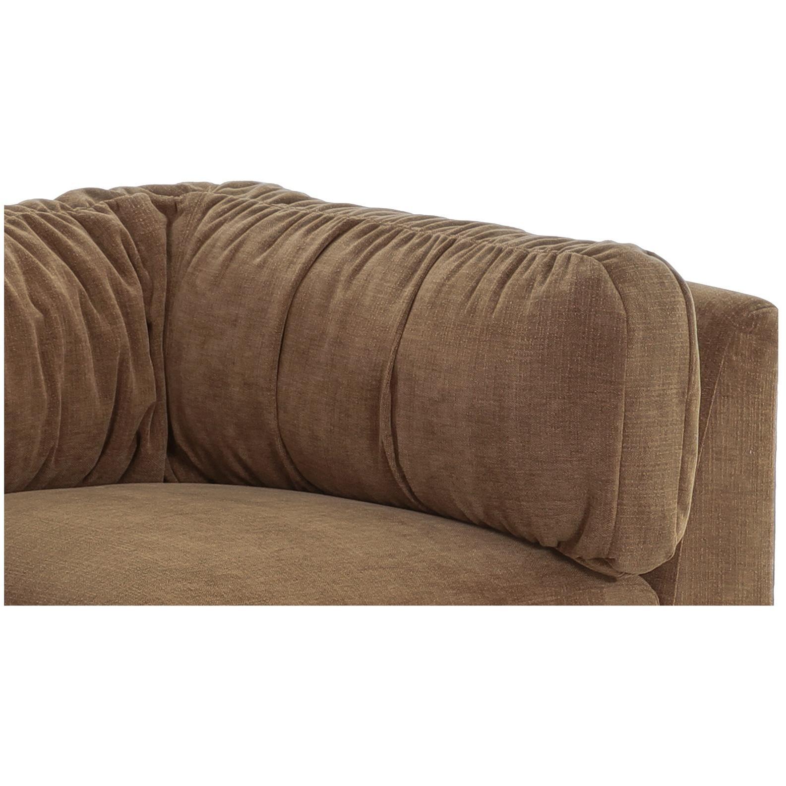 - Oversized Back Cushion: A large, wrap-around back cushion designed to provide a soft, vintage-inspired, and relaxed seating experience. Filled with faux feathers, the cushion purposefully gathers and wrinkles when you sink in, creating a warm and inviting ambiance.