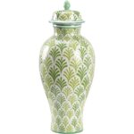 Hand painted green pattern on classic covered urn. Designed by Claire Bell.