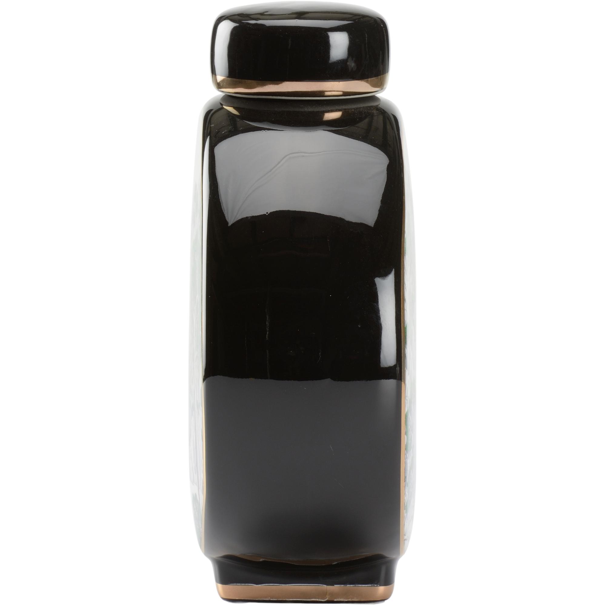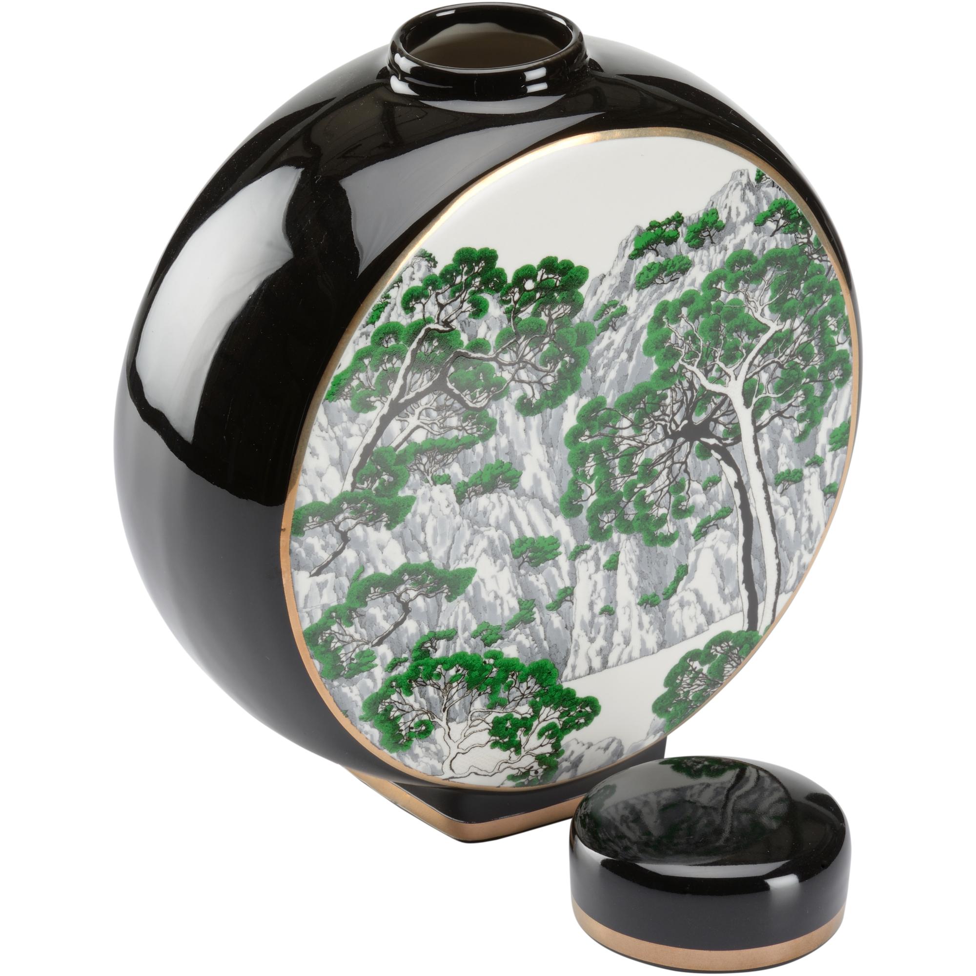Perfect for tabletops and book shelves in any home, matsu vase brings a chinoiserie style to your decor. Featuring an exquisite green and white landscape motif decal, this decorative vase is made of ceramic with a removable lid.