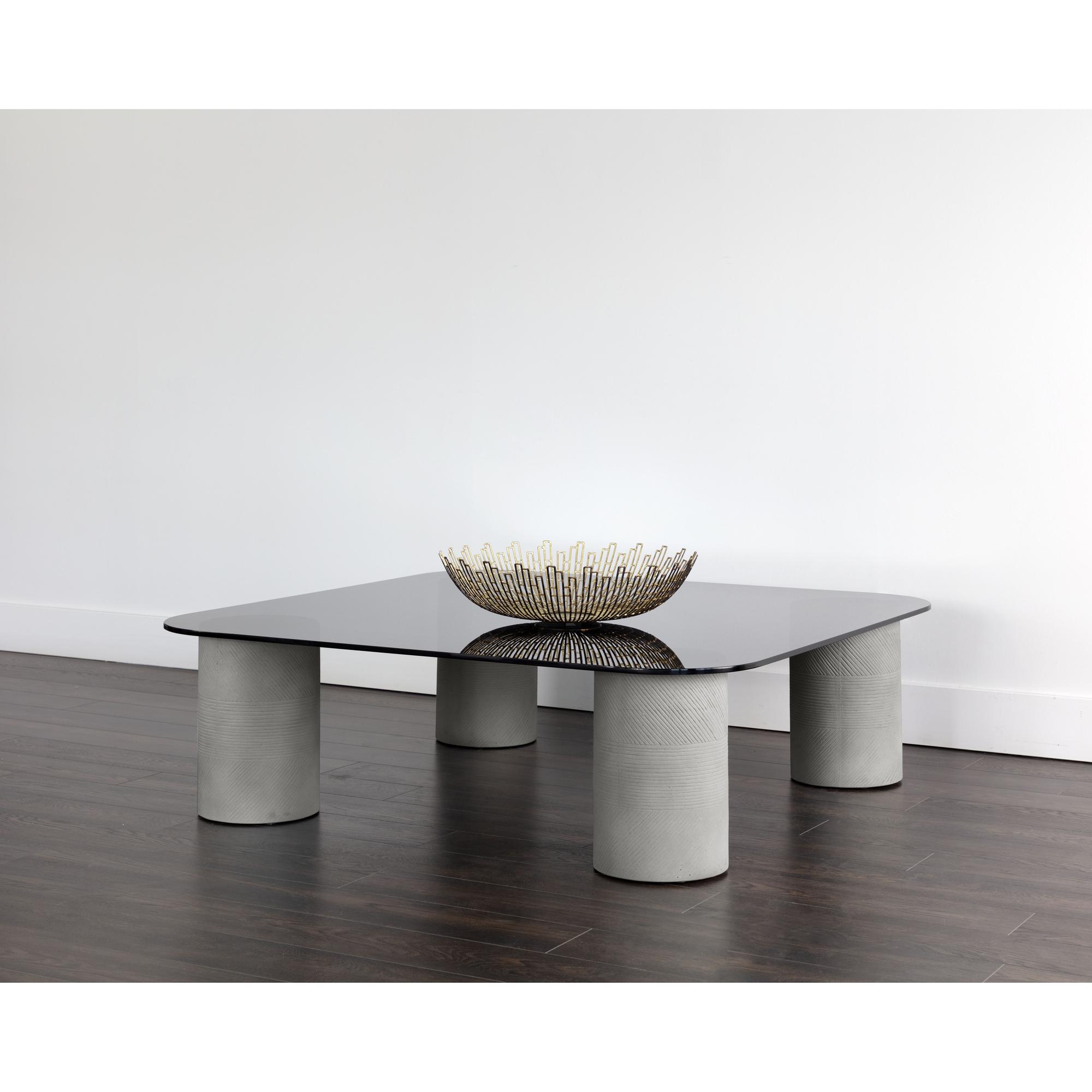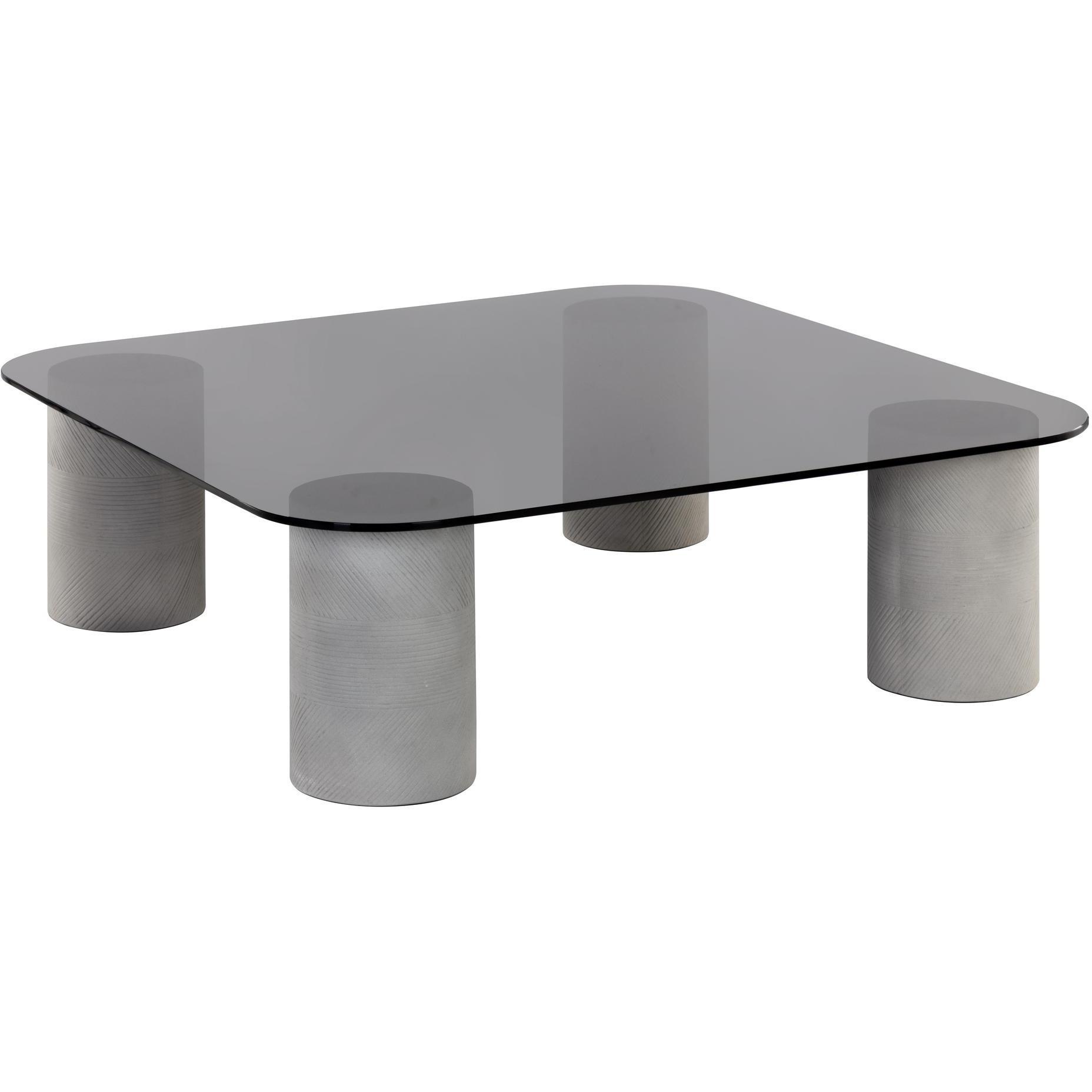 Fusing industrial edge with a contemporary touch, this striking coffee table is designed to stand out. Features etched cylindrical grey concrete bases with a square, smoked black glass tabletop with rounded edges.