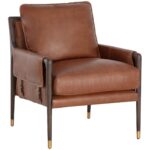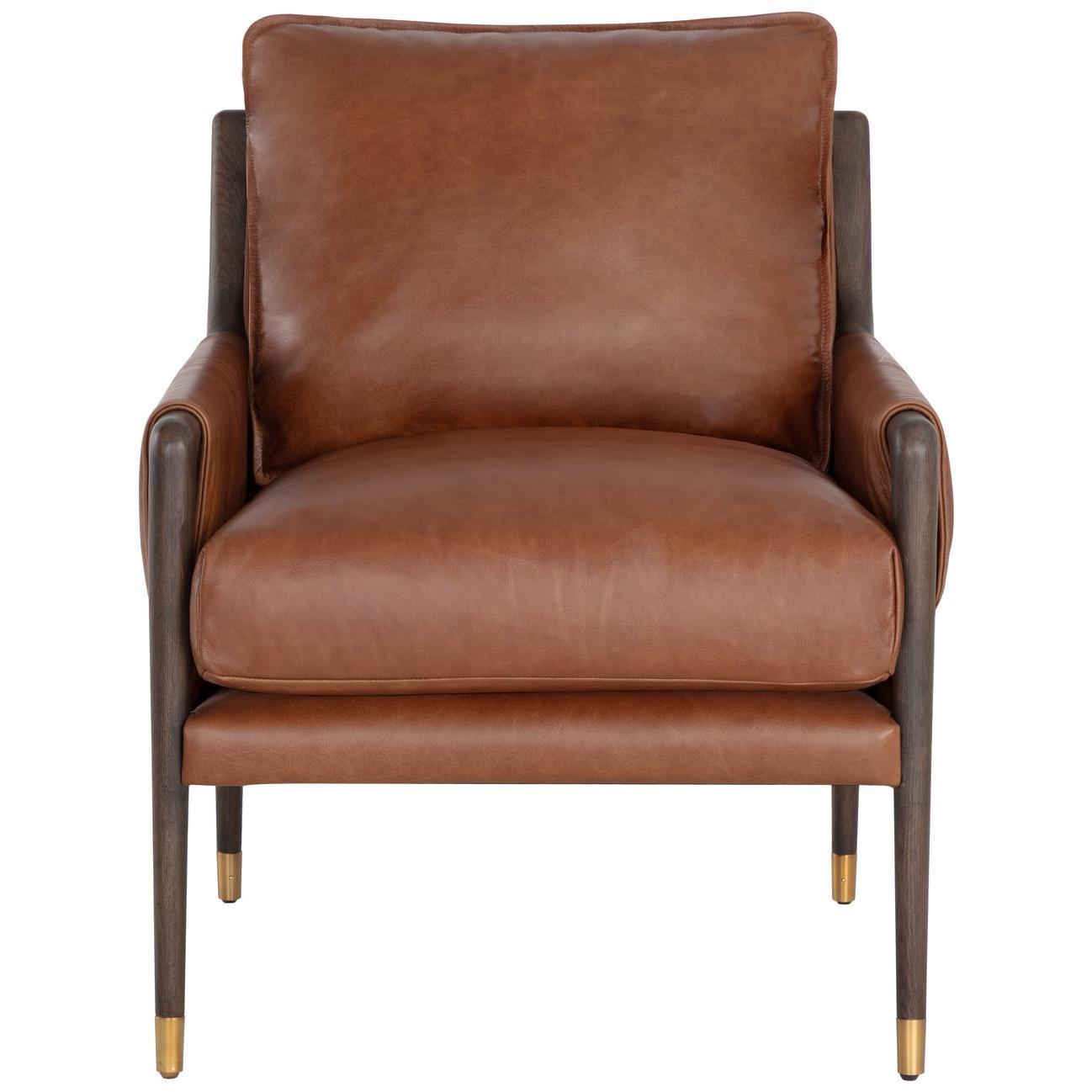 With influence from vintage design, this lounge chair evokes a charming and rustic mid-century appeal. Upholstered in shalimar tobacco leather with dual buckle flap detailing on the armrests. Completed with a brown solid oak wood frame with gold finished metal foot caps. Handle with Care: This design has been crafted with 100% top grain leather. Leather is a natural material; as such, colour variations, markings, wrinkles, grooves and light scratches are acceptable and appreciated characteristics. No two pieces are alike. Visit our Product Care page for more information on how to ensure the lasting beauty of this piece. As wood is an organic, porous material, these pieces will contain natural variation of texture and may also exhibit fine indentations and cracks. Wood pieces will also display a disparity of colour and grain, and visible knots and burls that add to the character of each piece.