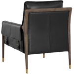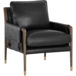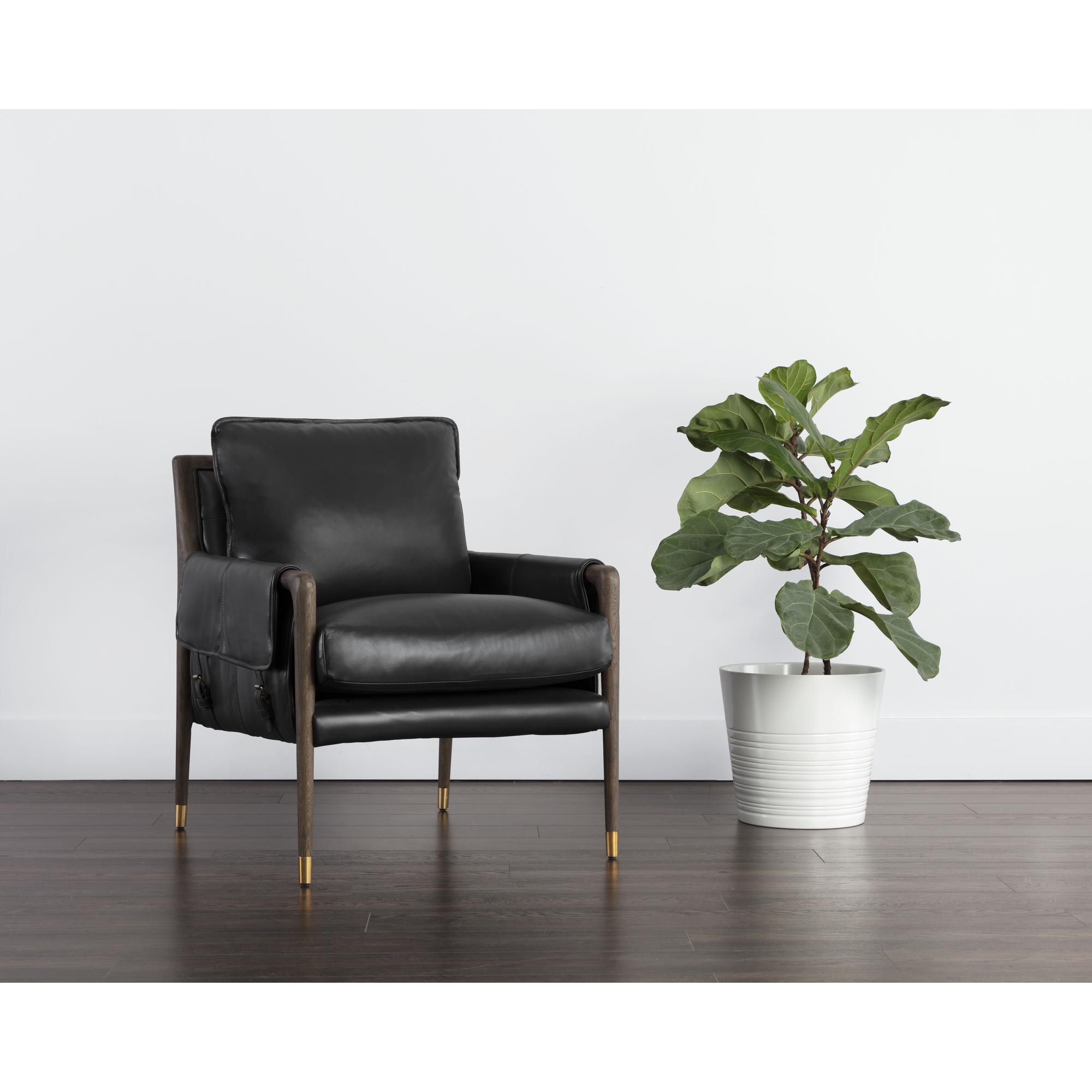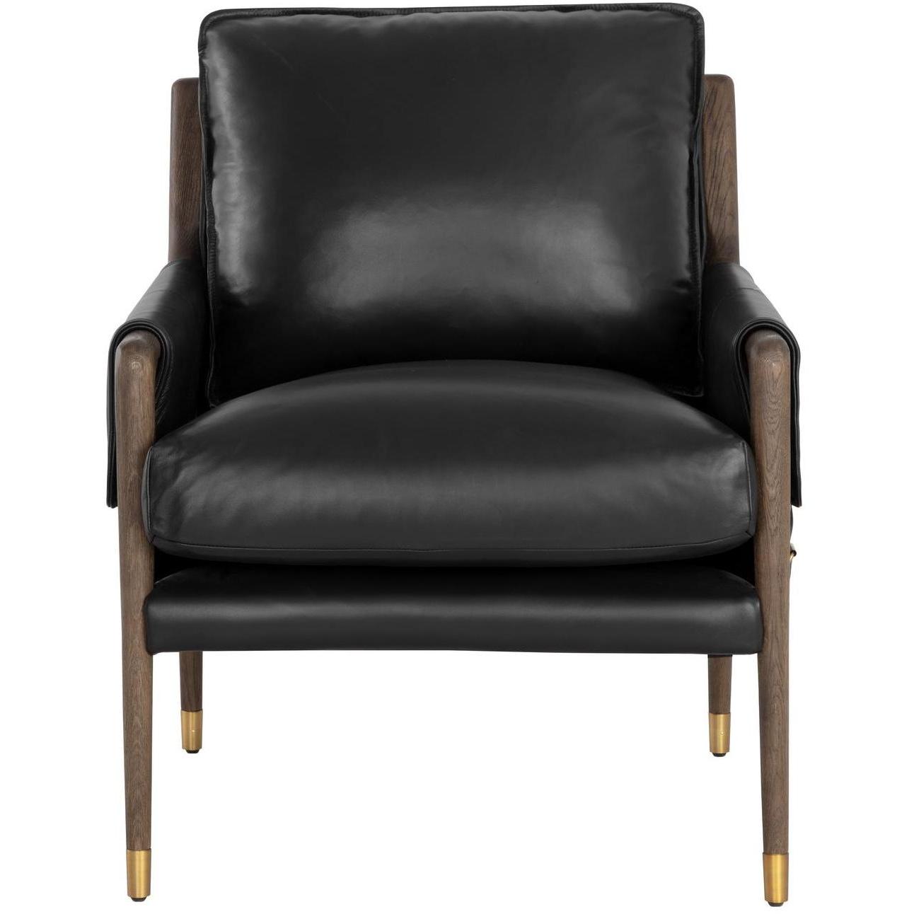 With influence from vintage design, this lounge chair evokes a charming and rustic mid-century appeal. Upholstered in cortina black leather with dual buckle flap detailing on the armrests. Completed with a distressed brown solid oak wood frame with gold finished metal foot caps. Handle with Care: This design has been crafted with 100% top grain leather. Leather is a natural material; as such, colour variations, markings, wrinkles, grooves and light scratches are acceptable and appreciated characteristics. No two pieces are alike. Visit our Product Care page for more information on how to ensure the lasting beauty of this piece. As wood is an organic, porous material, these pieces will contain natural variation of texture and may also exhibit fine indentations and cracks. Wood pieces will also display a disparity of colour and grain, and visible knots and burls that add to the character of each piece.