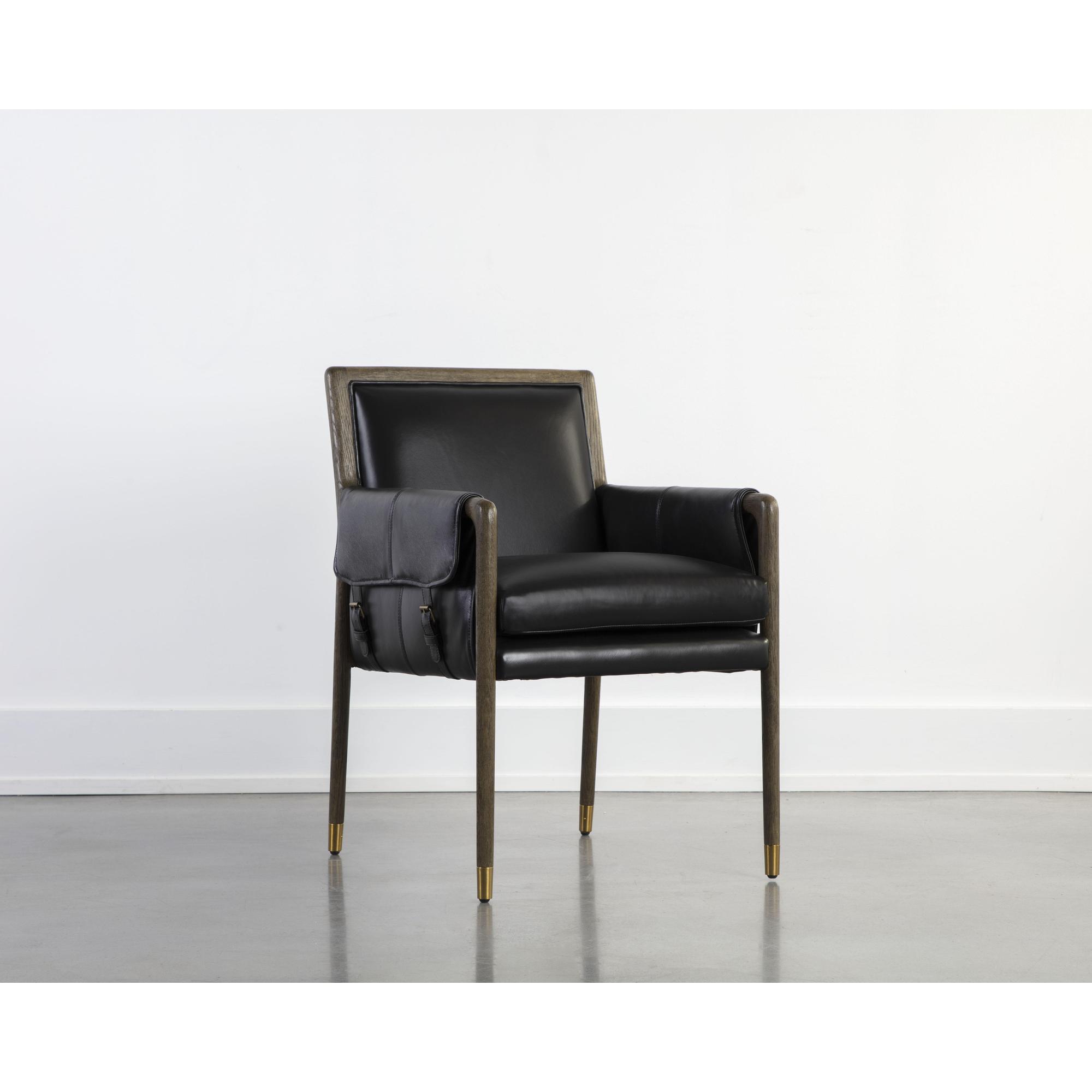 With influence from vintage design, the Mauti Dining Armchair evokes a charming and rustic mid-century appeal. Upholstered in cortina black leather with dual buckle flap detailing on the armrests. Completed with a distressed brown solid oak wood frame with brushed gold metal foot caps. Handle with Care: This design has been crafted with 100% top grain leather. Leather is a natural material; as such, colour variations, markings, wrinkles, grooves and light scratches are acceptable and appreciated characteristics. No two pieces are alike. Visit our Product Care page for more information on how to ensure the lasting beauty of this piece. As wood is an organic, porous material, these pieces will contain natural variation of texture and may also exhibit fine indentations and cracks. Wood pieces will also display a disparity of colour and grain, and visible knots and burls that add to the character of each piece.