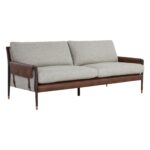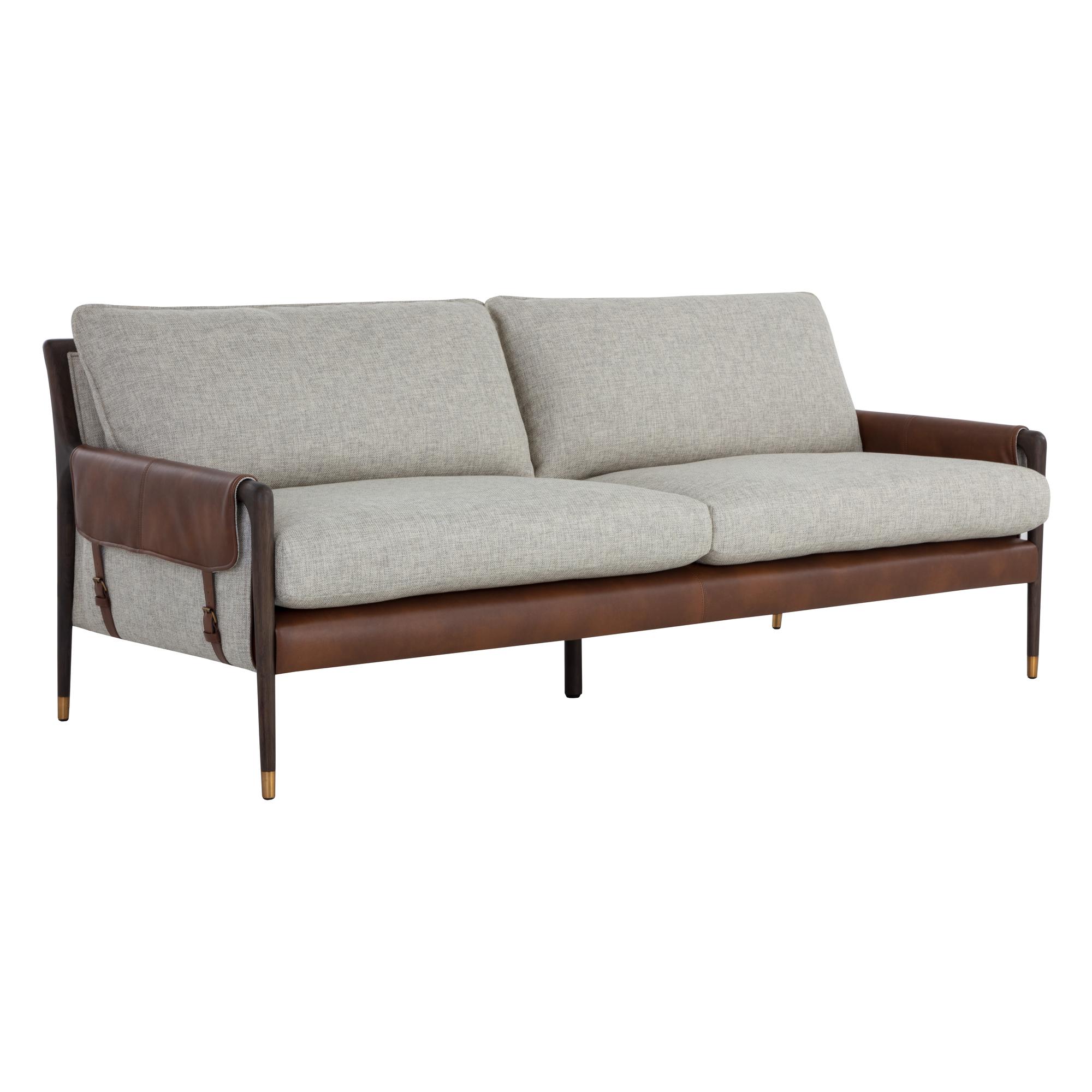 With influence from vintage design, this sofa evokes a charming and rustic mid-century appeal. Upholstered in vault fog performance fabric with accenting bravo cognac faux leather. Features dual buckle flap detailing on the armrests and completed with a brown solid oak wood frame with gold finished metal foot caps. Performance fabric is moisture repellent, durable and easy to clean. Handle With Care: This design has been crafted with faux leather. Faux leather is manufactured to reflect the natural characteristics of leather; as such, colour variations, markings wrinkles, grooves, and light scratches are appreciated characteristics. No two pieces will be alike. Visit our Product Care page for more information on how to ensure the lasting beauty of this piece.