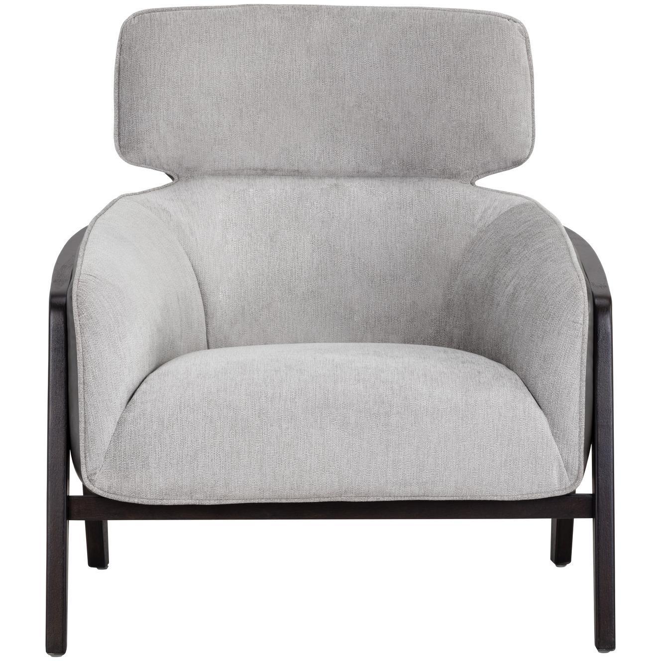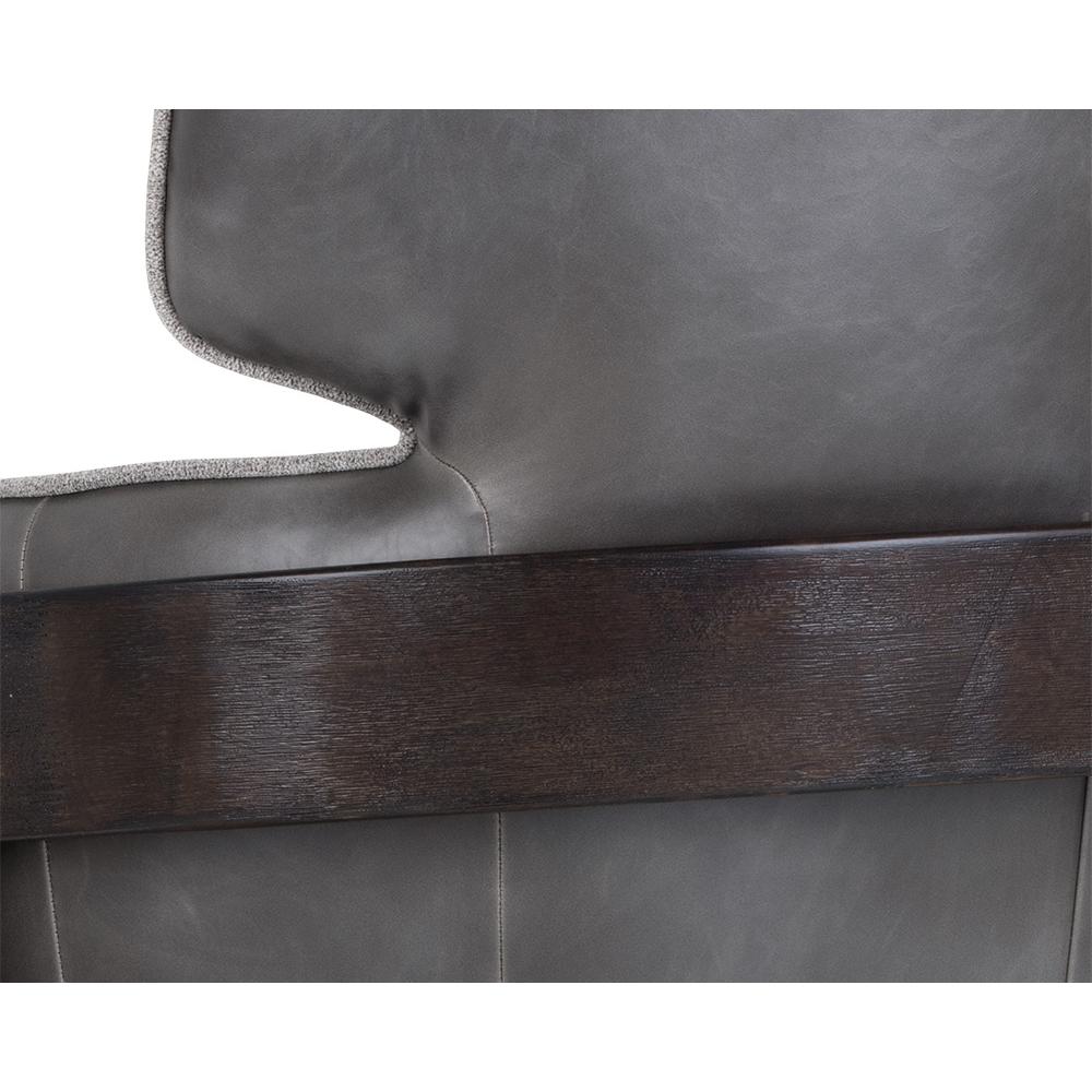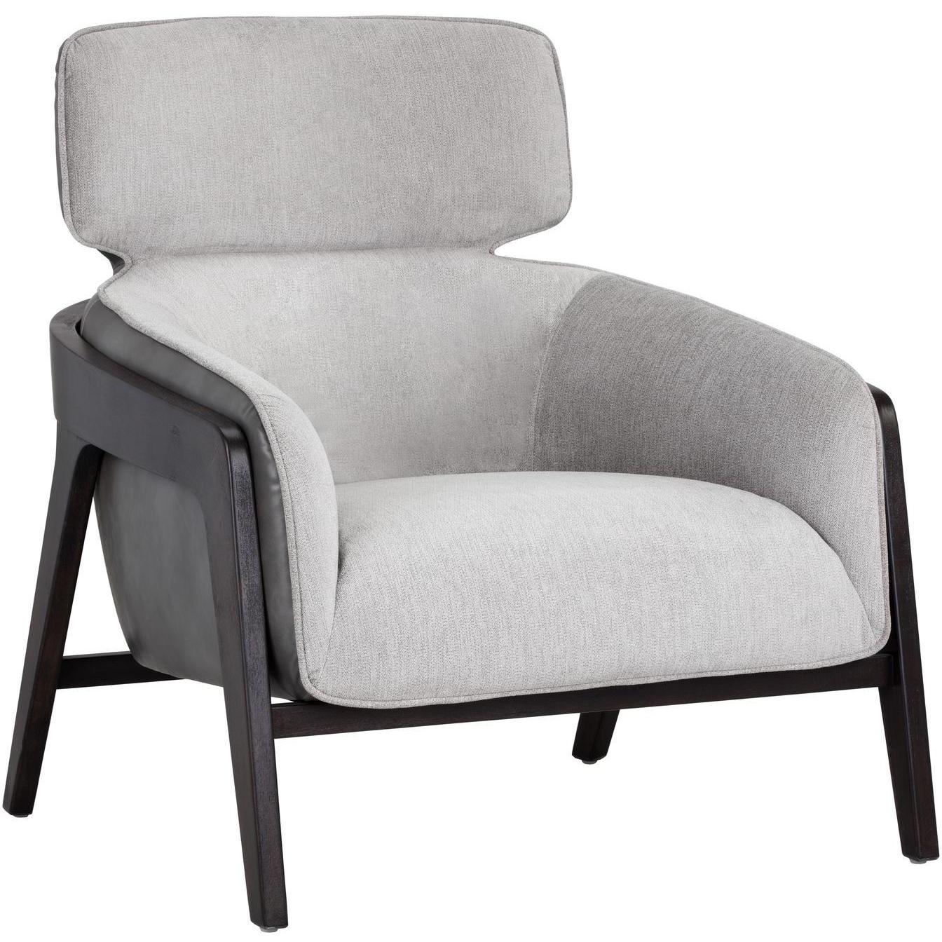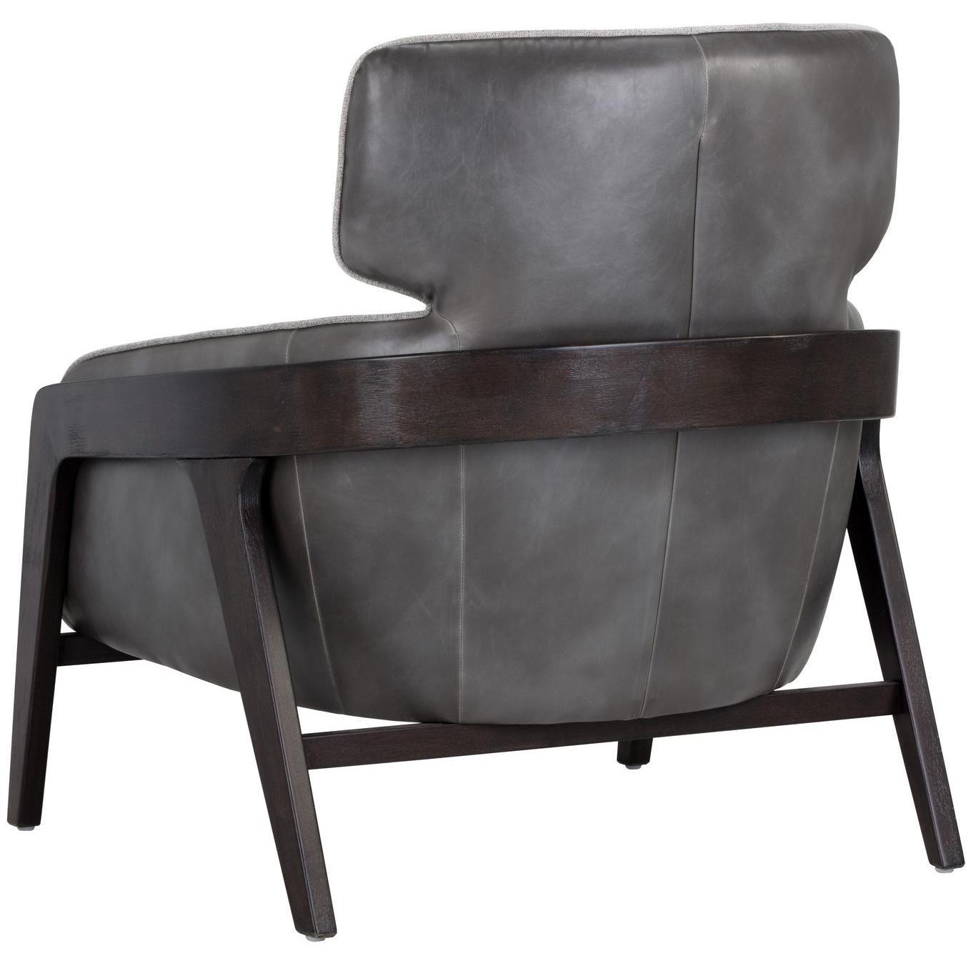 A masculine lounge chair that combines modern design elements with contemporary finishes. Stocked in contrasting polo club stone performance fabric and overcast grey faux leather. A sculpted exposed brown wood frame completes the look. Performance fabric is moisture repellent, durable and easy to clean. Handle With Care: This design has been crafted with faux leather. Faux leather is manufactured to reflect the natural characteristics of leather; as such, colour variations, markings, wrinkles, grooves, and light scratches are appreciated characteristics. No two pieces will be alike.