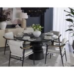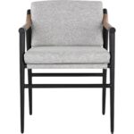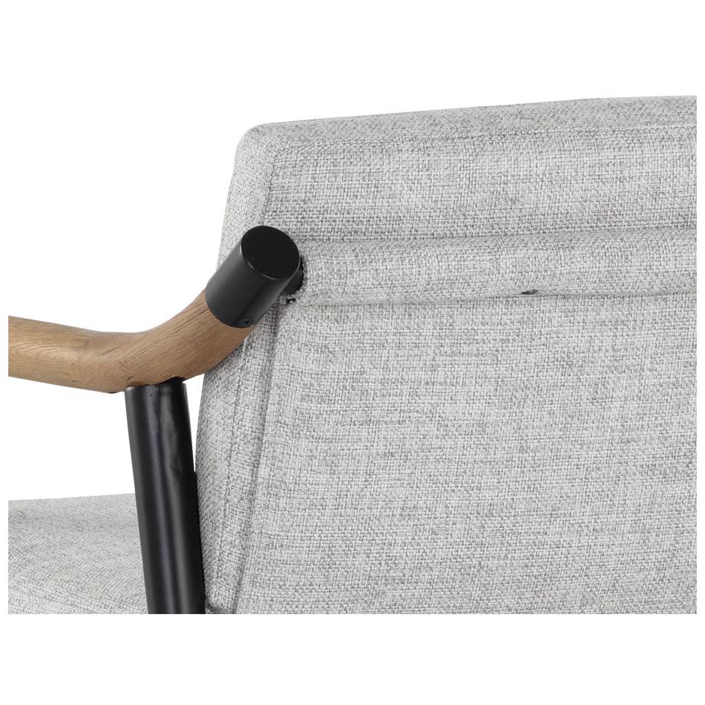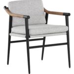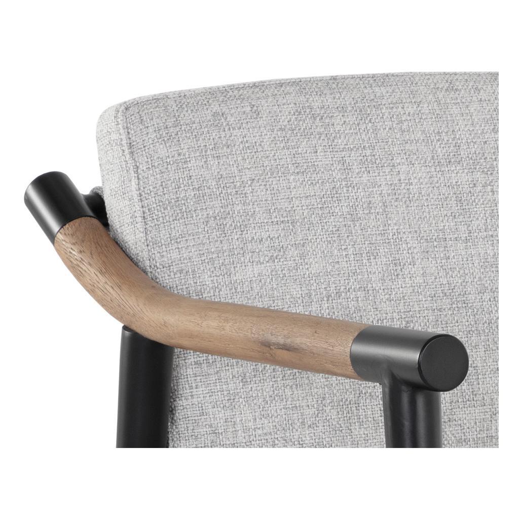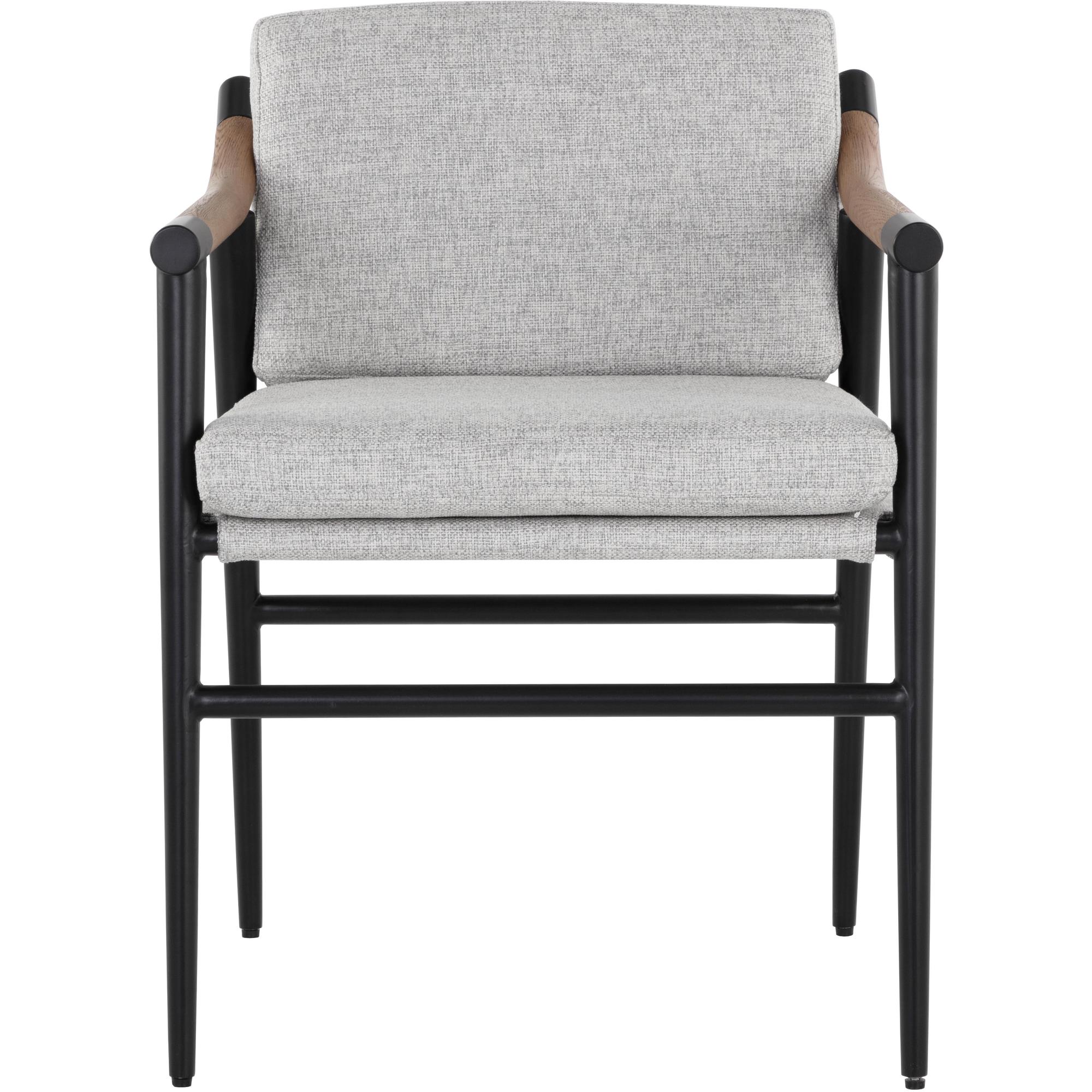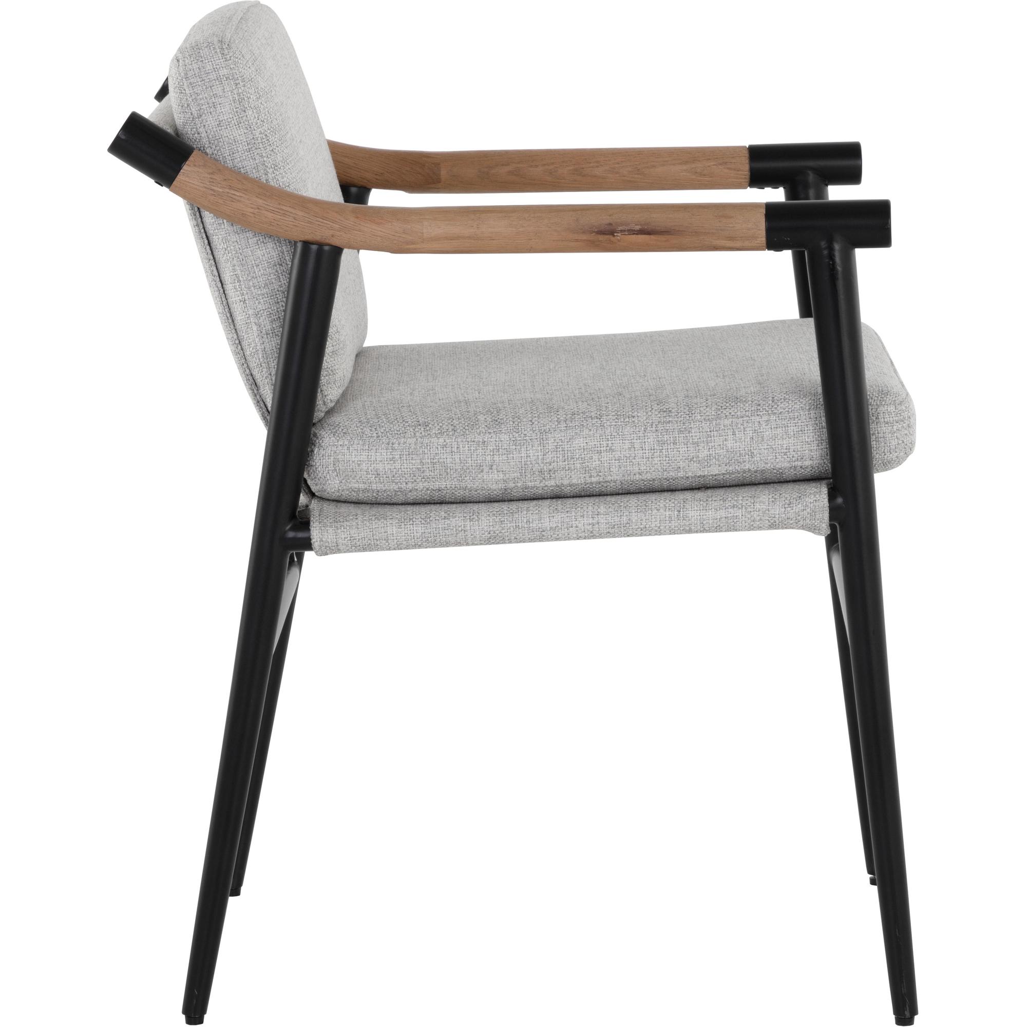 Functional with a timeless design, the Meadow Dining Armchair offers a clean silhouette that will suit any space. Stocked in vault fog performance fabric with solid oak wood armrests. Completed with a black iron frame. Performance fabric is moisture repellant, stain resistant and easy to clean. As wood is an organic, porous material, these pieces will contain natural variations of texture and may also exhibit fine indentations and cracks. Wood pieces will also display a disparity of colour and grain, and visible knots and burls that add to the character of each piece.