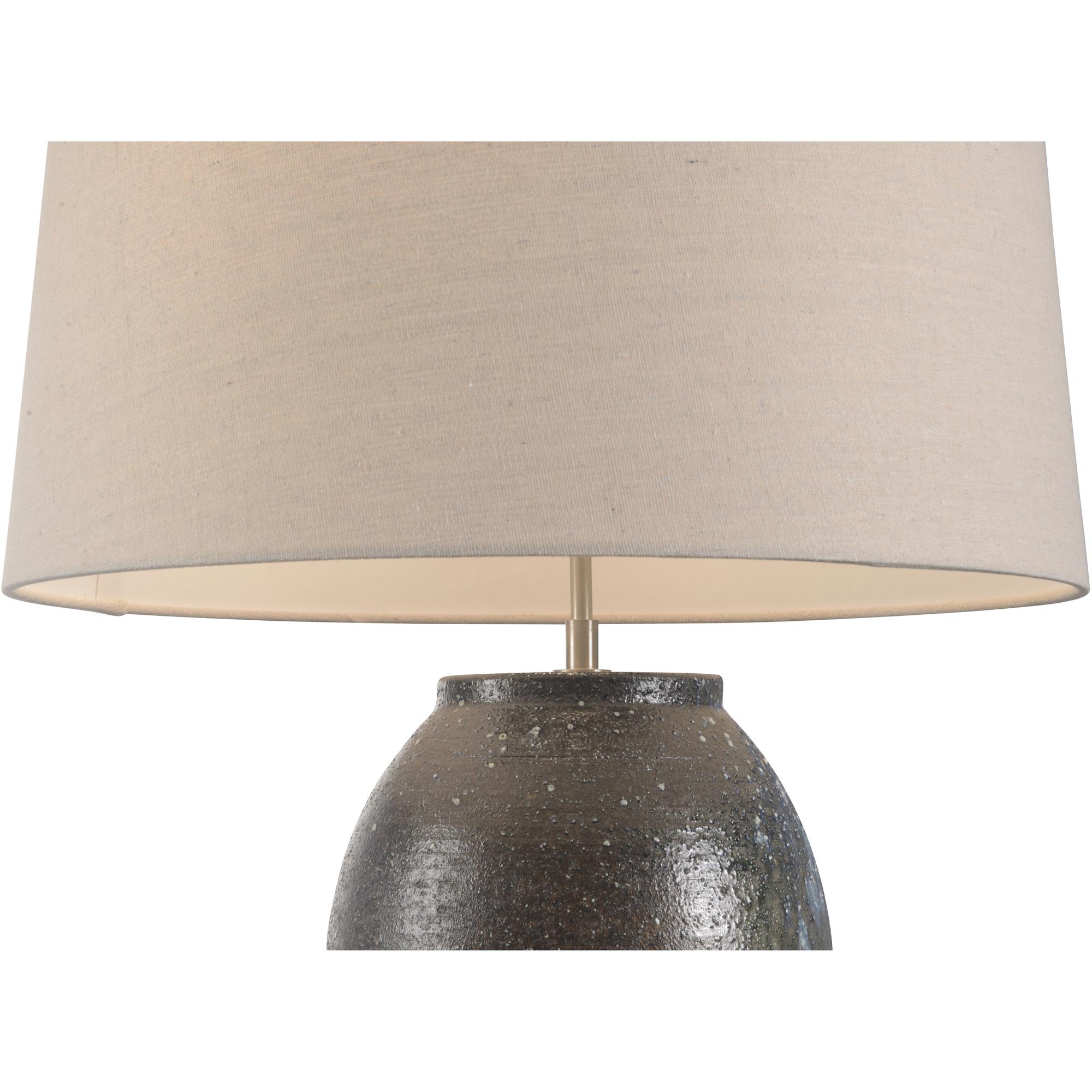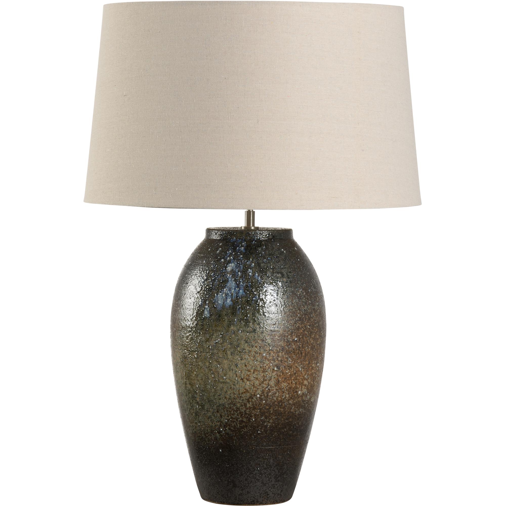 The Megumi Table Lamp, part of the Shiga collection, is hand turned and finished in one of six ancient kilns in Japan. The elements from the soil of Shiga create this earthy toned ombre finish on a classic jar shape lamp completed with cloth wiring and topped with a refined rolled-edge linen shade. Made in Japan.