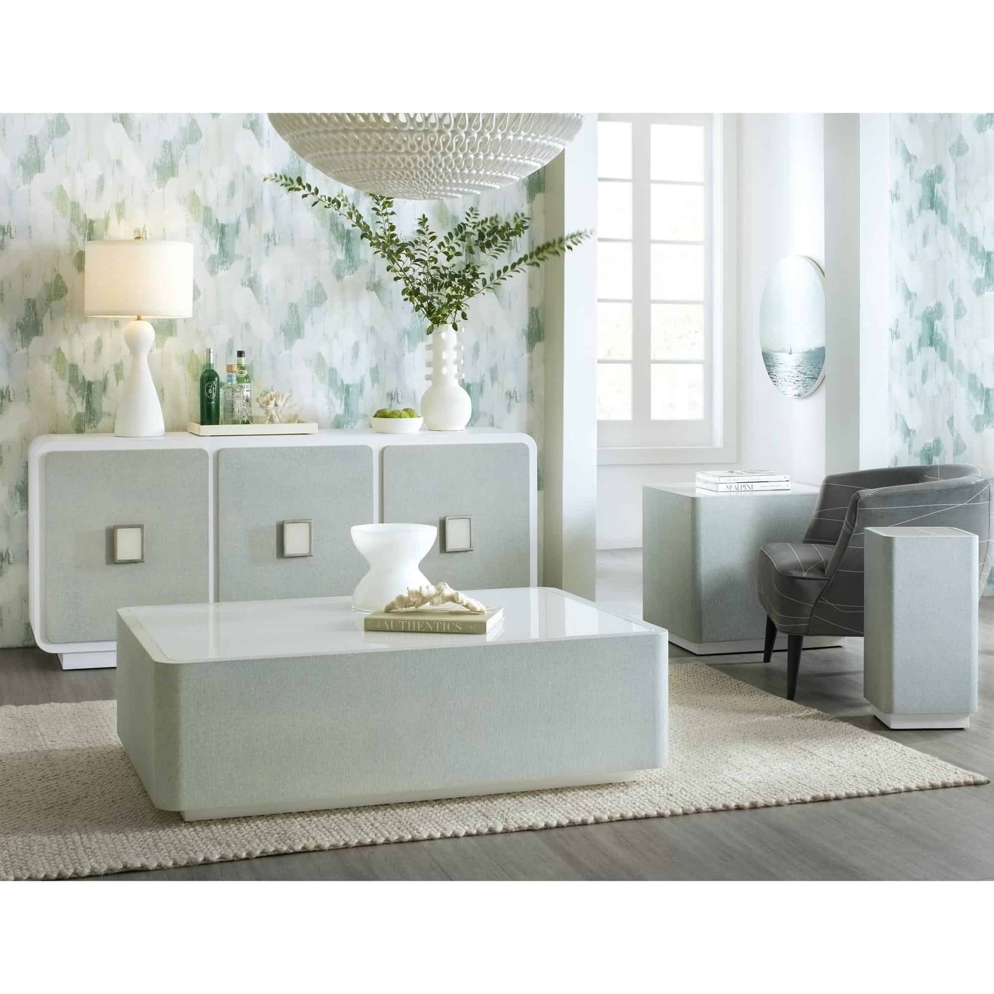 - Finish: Creamy white painted glass top with gray raffia wrapped exterior with hints of blue