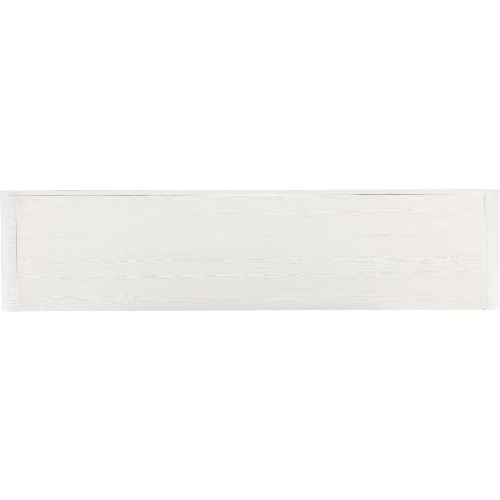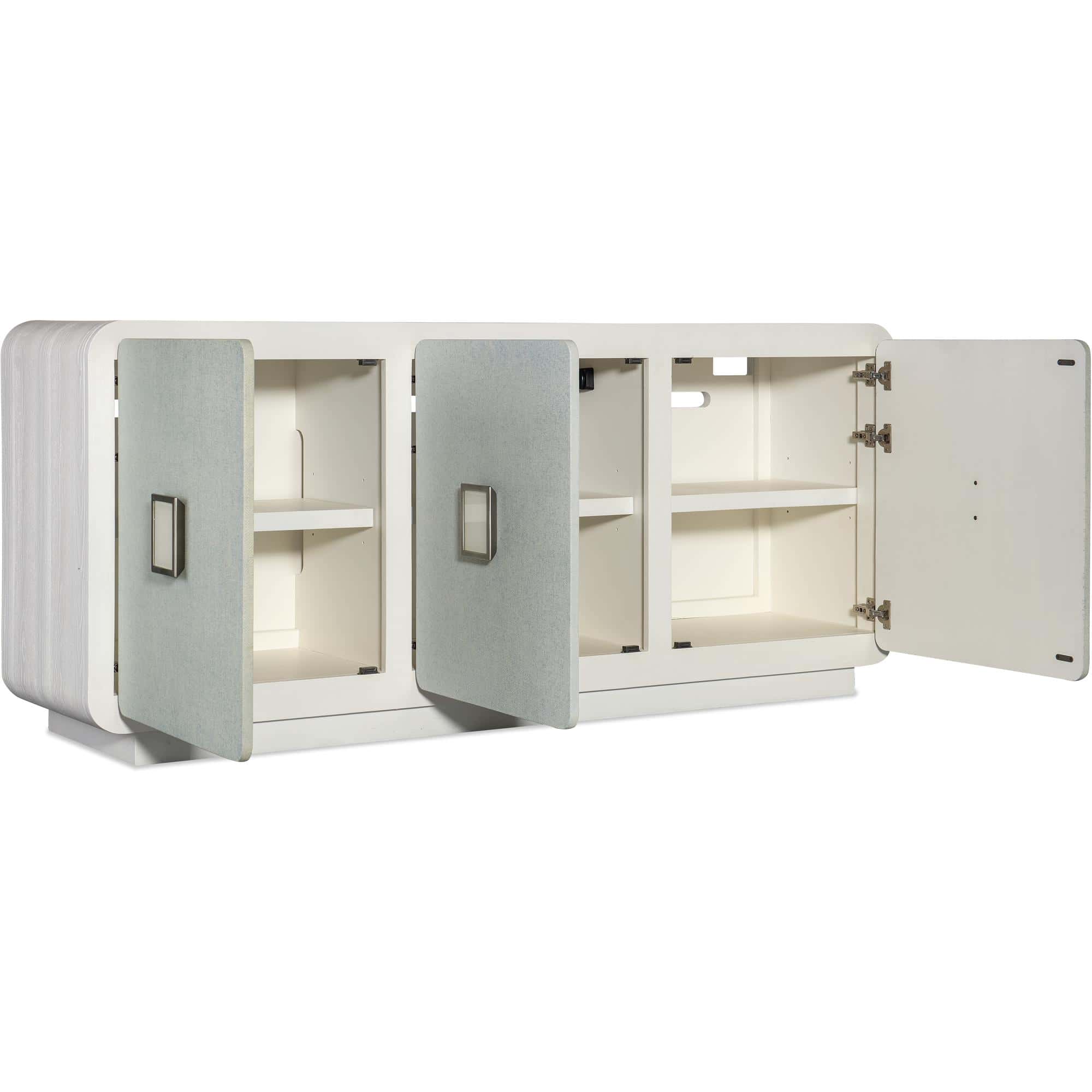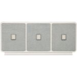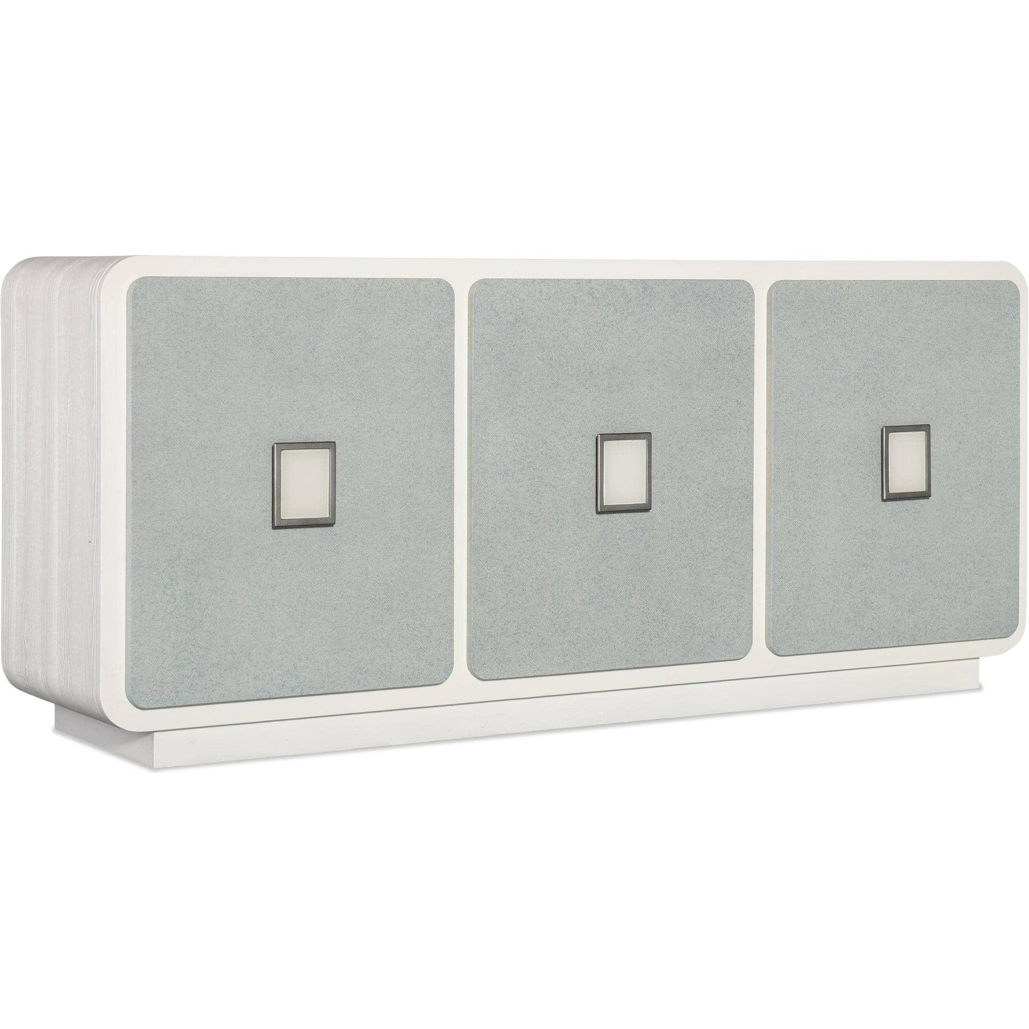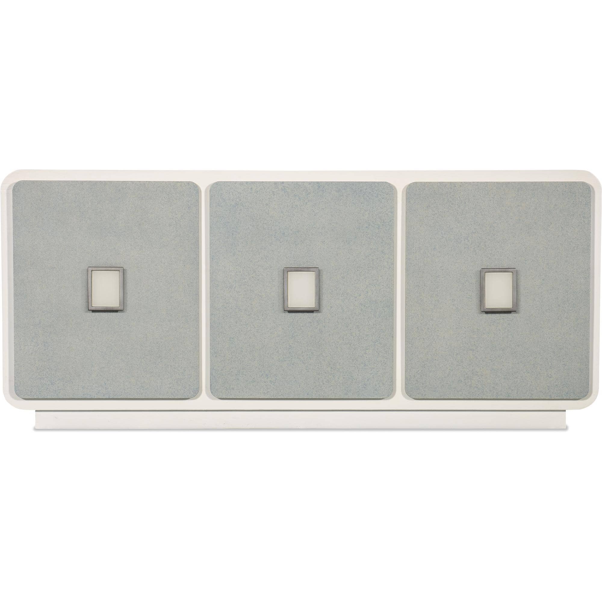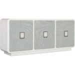 Finish: Creamy white finish with gray raffia wrapped doors with hints of blue. Large square shaped hardware is silver colored metal with white painted glass