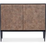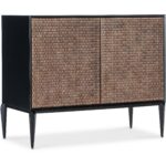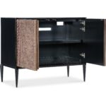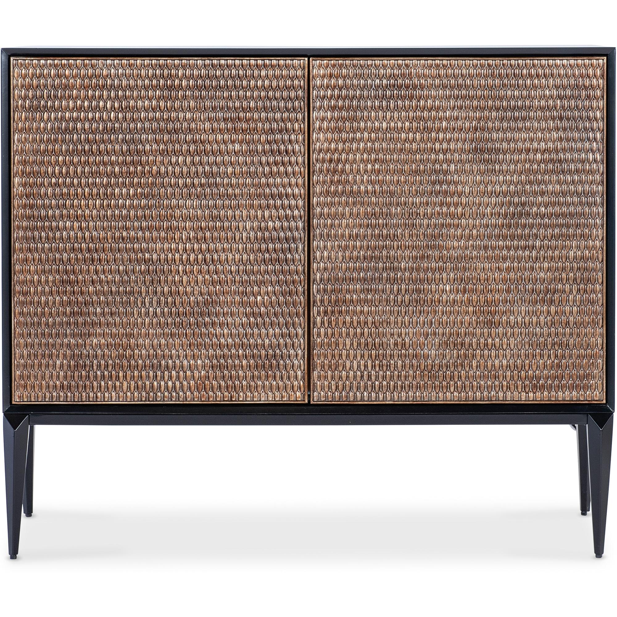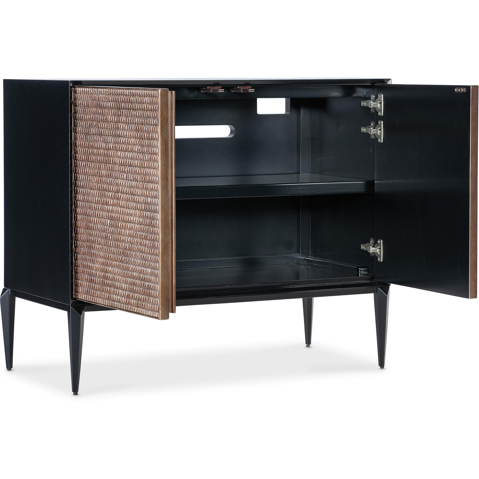Features: Two touch latch doors with soft close hinges One adjustable wood shelf Ventilated back panel with wire management Carved resin door fronts Sleek, tapered legs