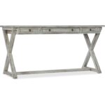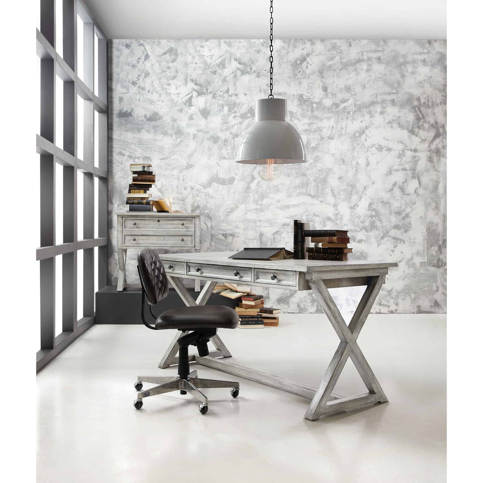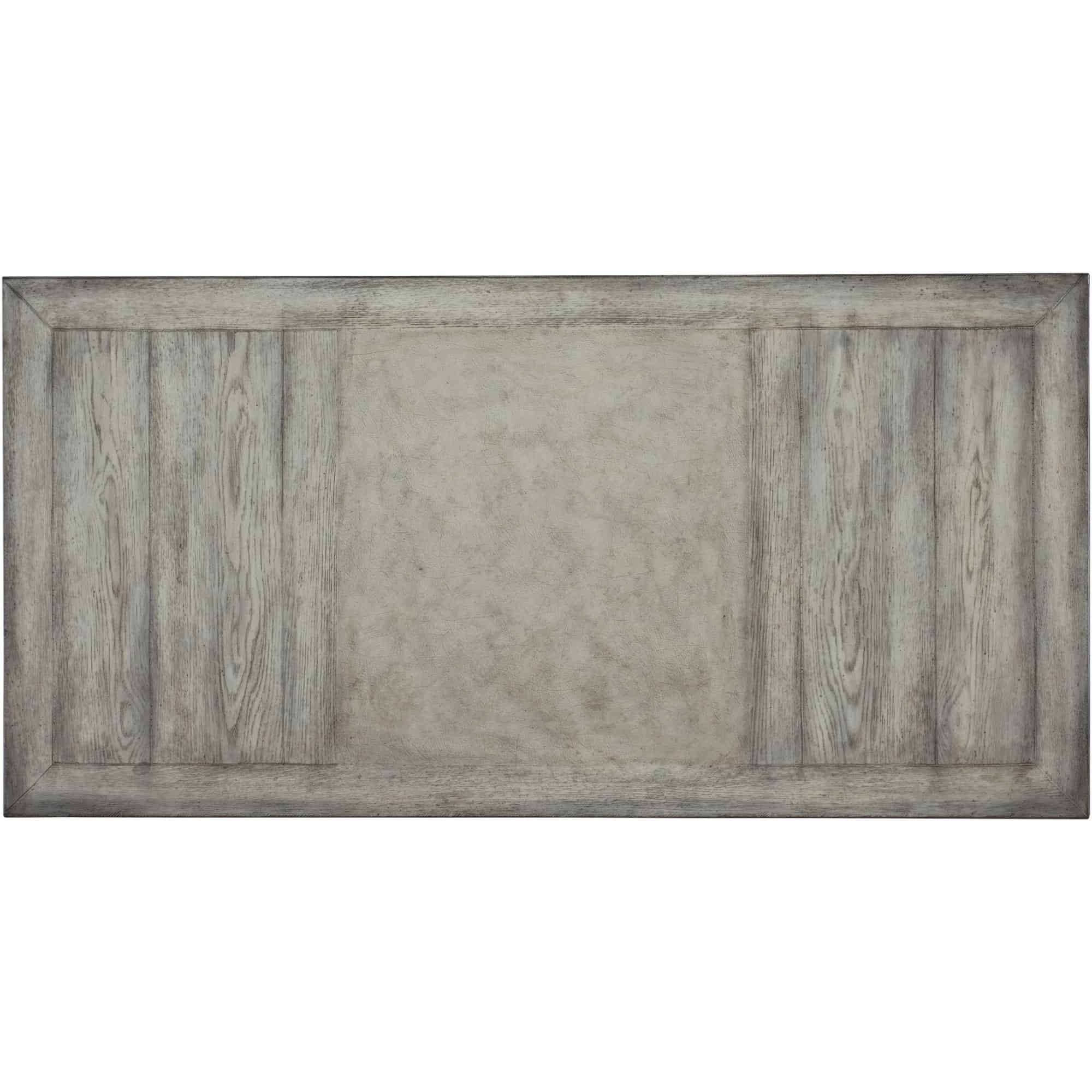 Finish: Light gray finish with distressing. Distressing includes rasping and gouging. Dark gray round pull.