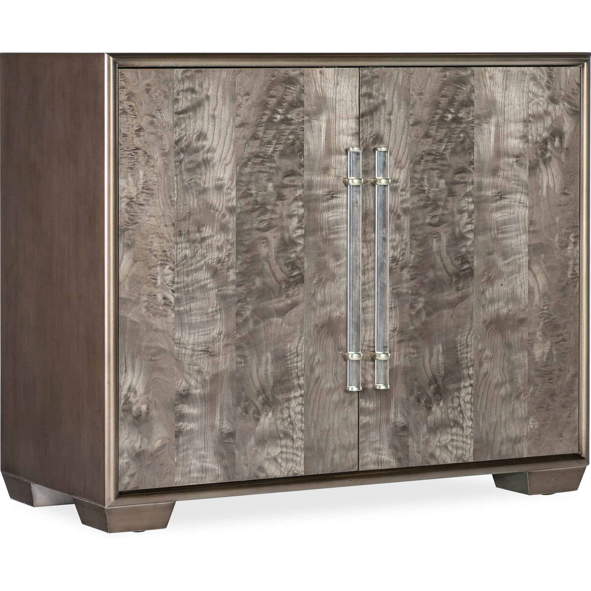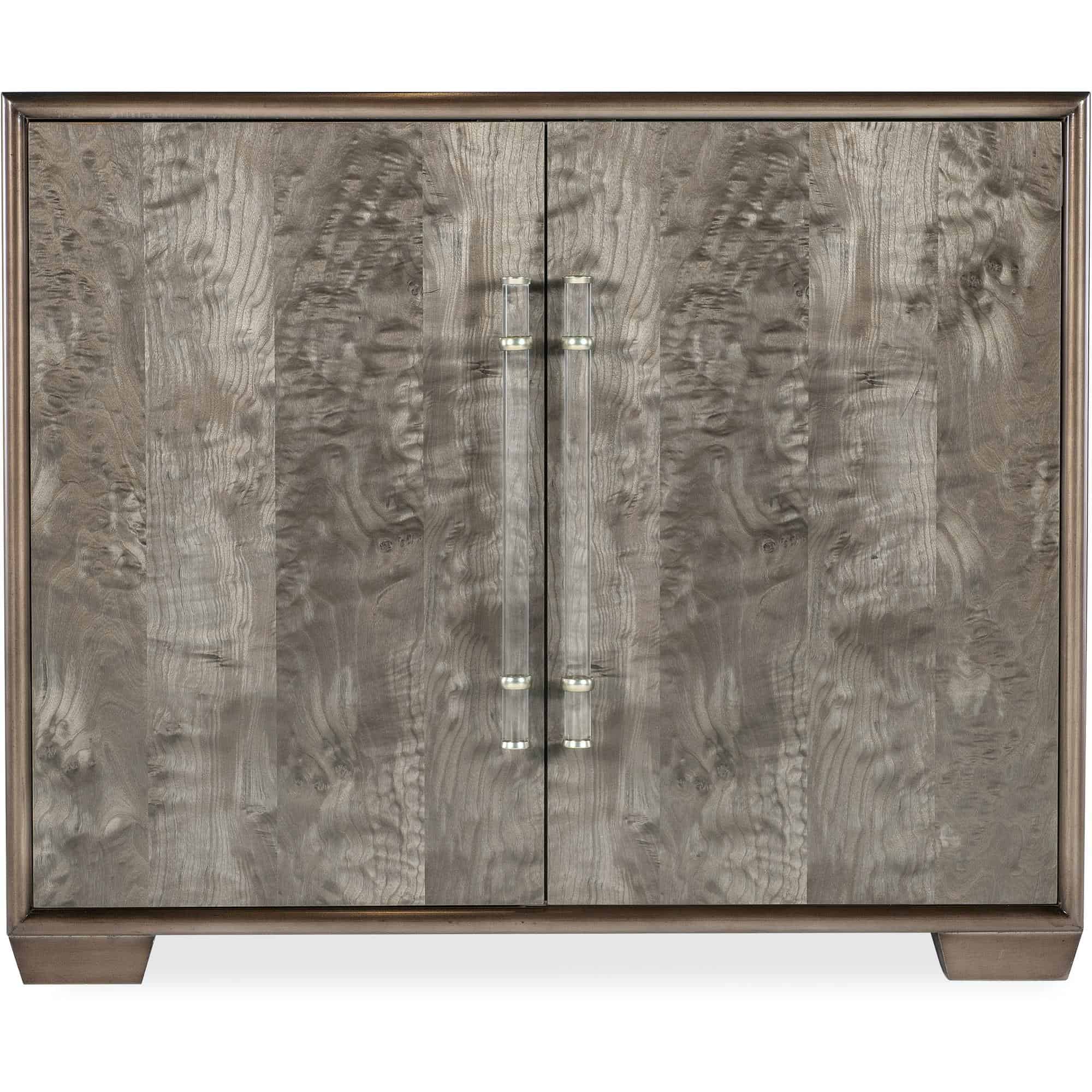 - Finish: Shimmery wood finish on exterior with dyed brown burl veneer door fronts. Clear acrylic bar pulls with silver metal.