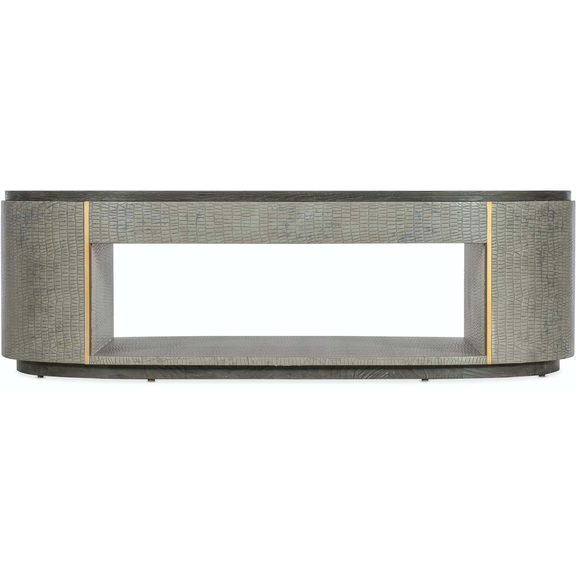 - Finish: Gray crocodile exterior with gold metal accents and dark wood top and base