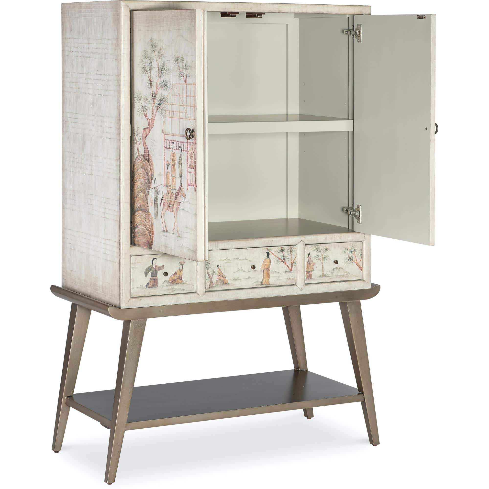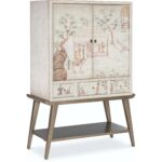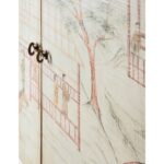 - Finish: Soft white and beige linen crackle canvas color with gold base, legs and shelf. Asian painted motif using red, brown and green colors.