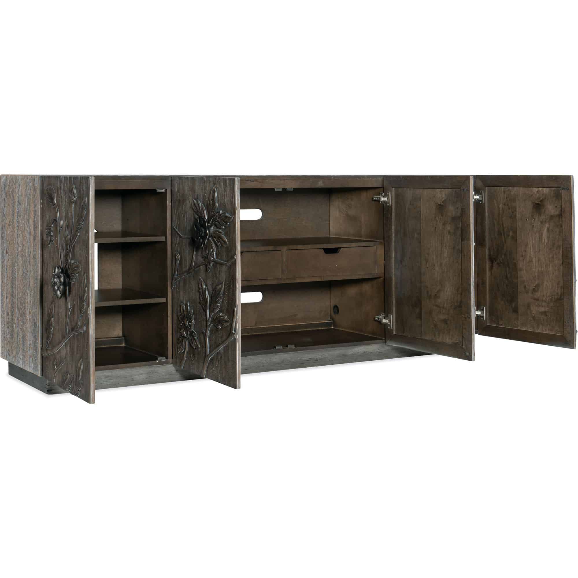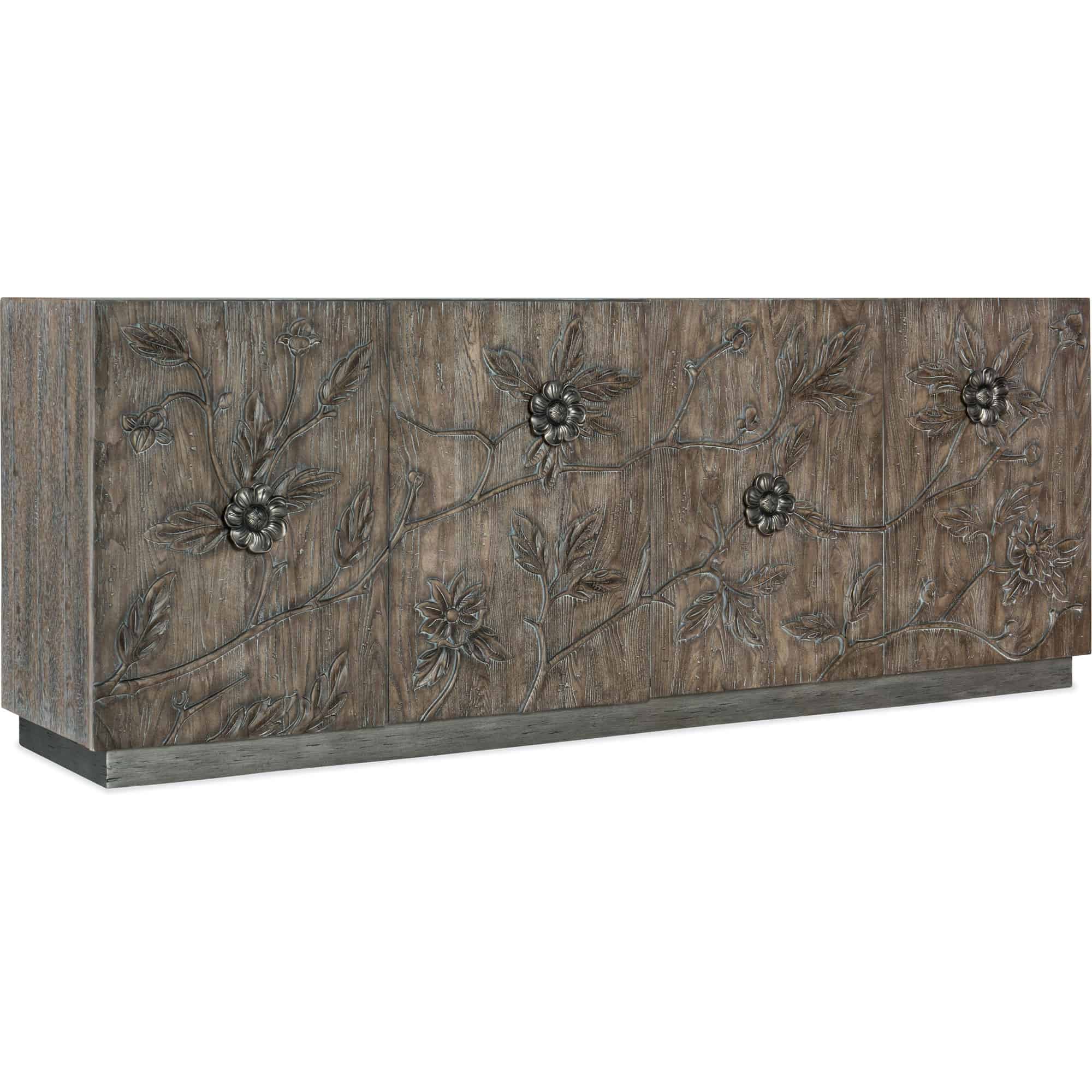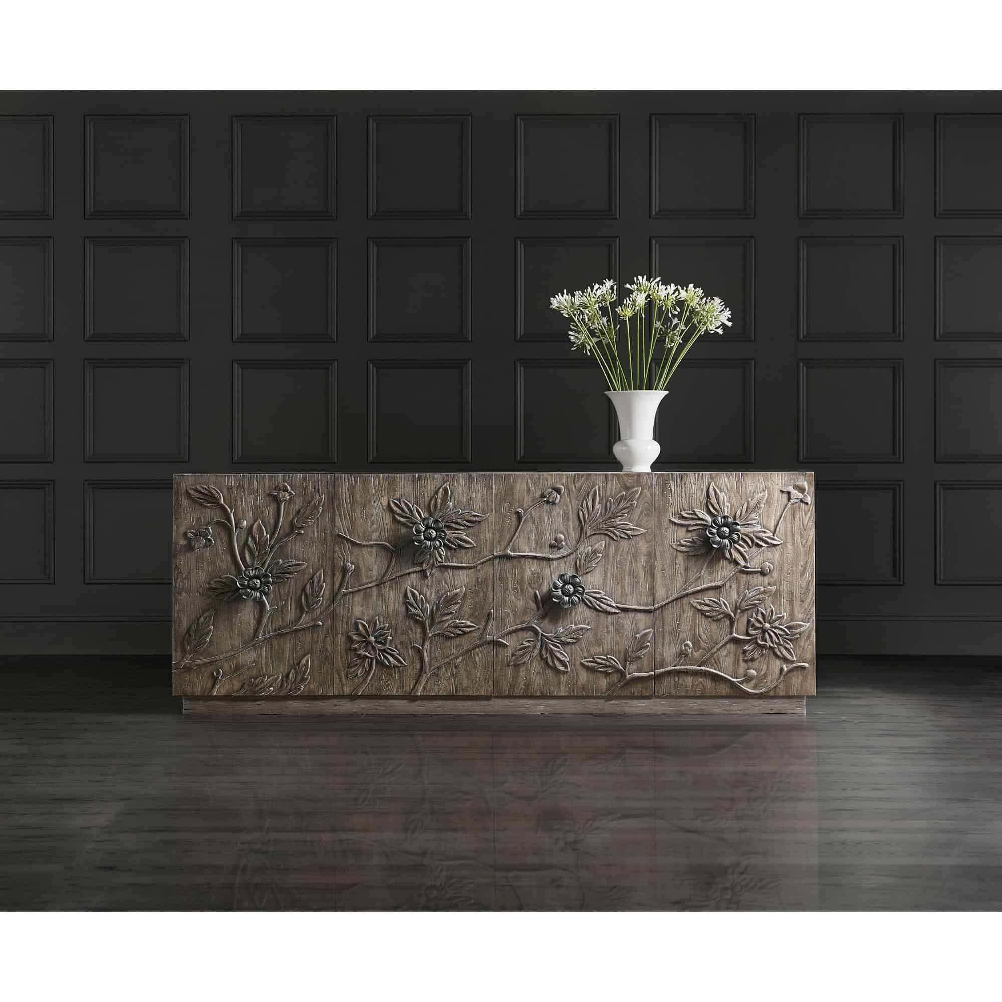 Finish: Medium wood finish with flower motif on door fronts and large floral silver hardware