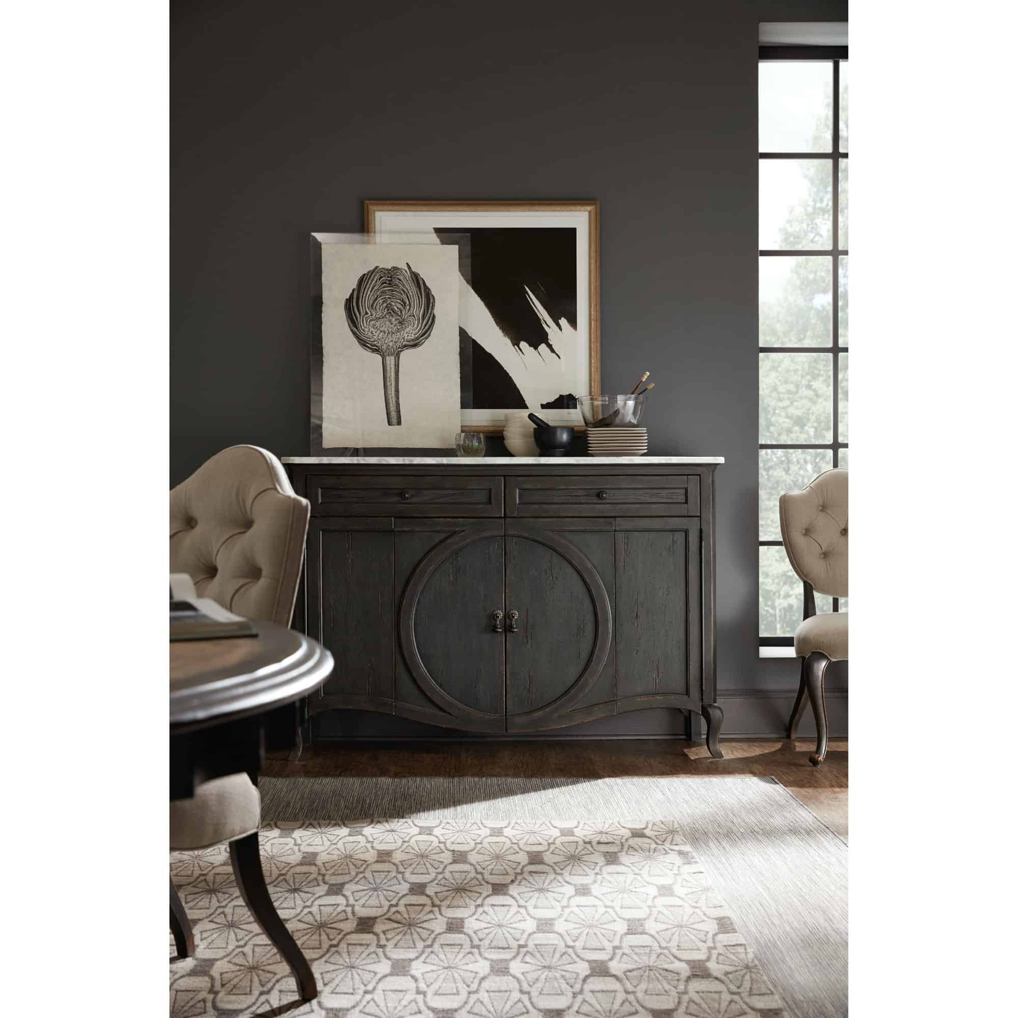 Finish: Heavily painted charcoal finish. Distressing includes rasping and worm holes.