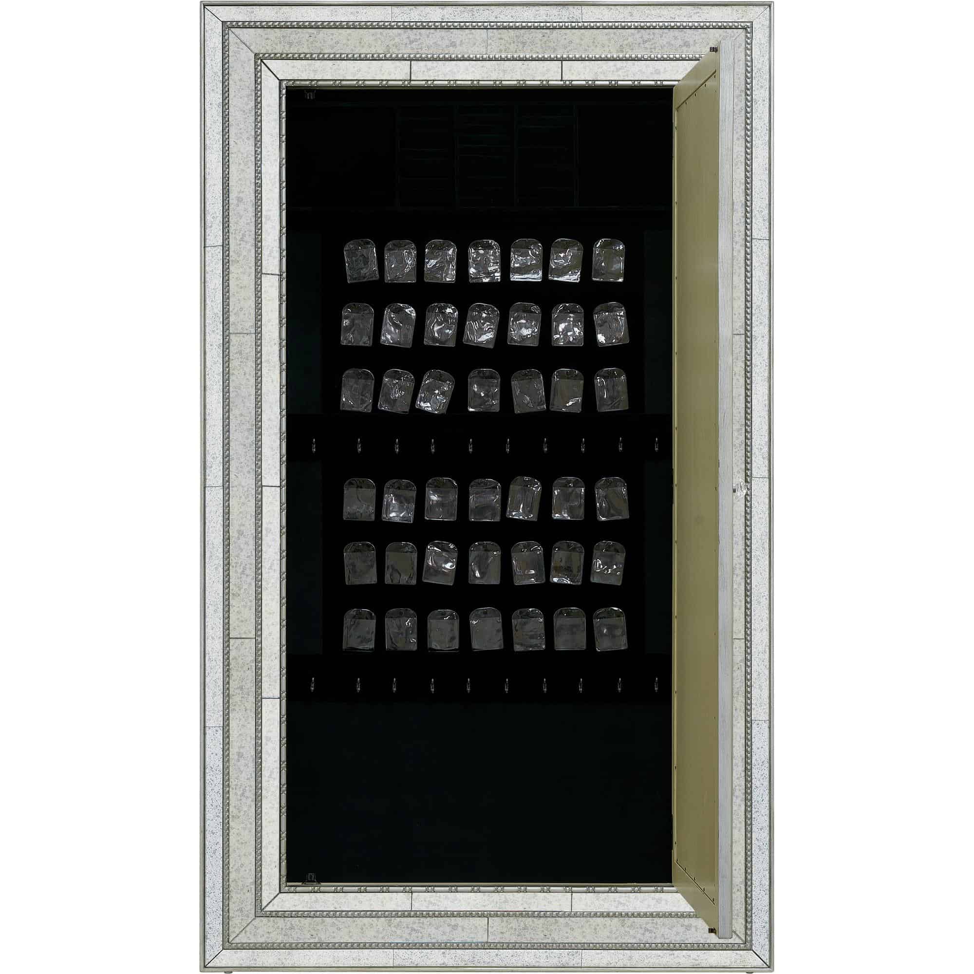 Mirror door opens to reveal a felt-lined interior.