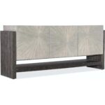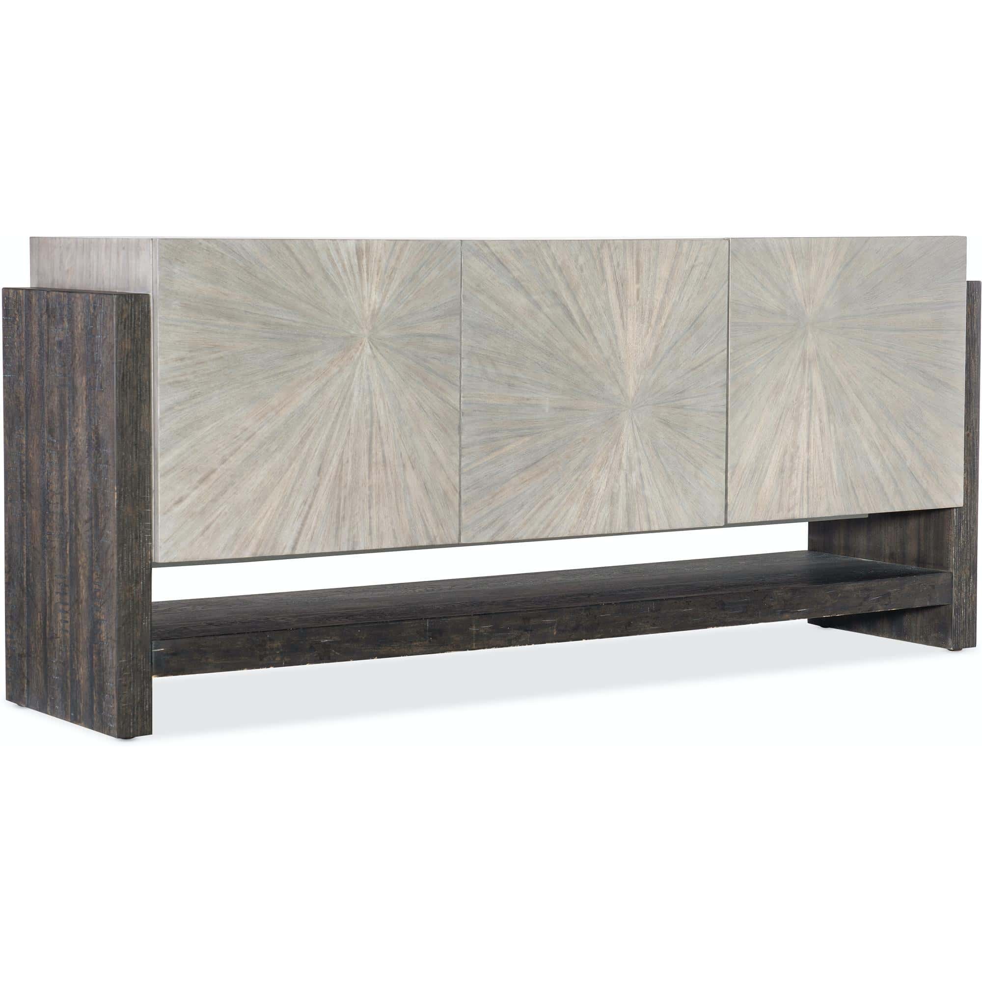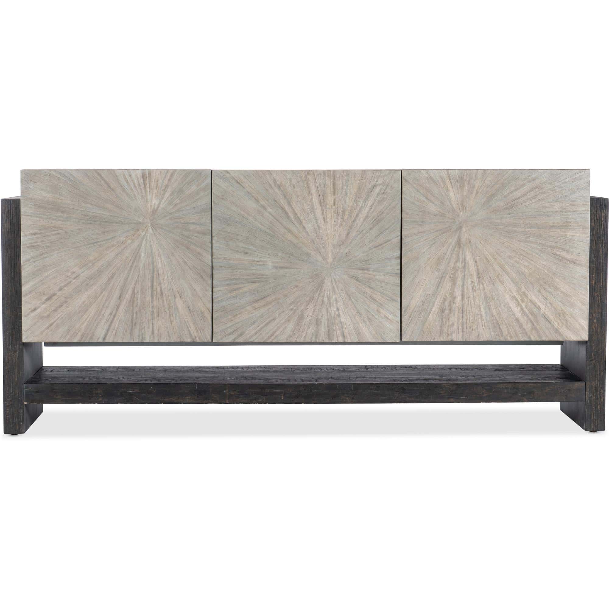 Features: Three doors with soft-close hinges and magnetic door catches Starburst veneer pattern on door fronts One adjustable shelf behind each door One fixed shelf Ventilated back panel FC705 Three plug electrical outlet behind center door Levelers