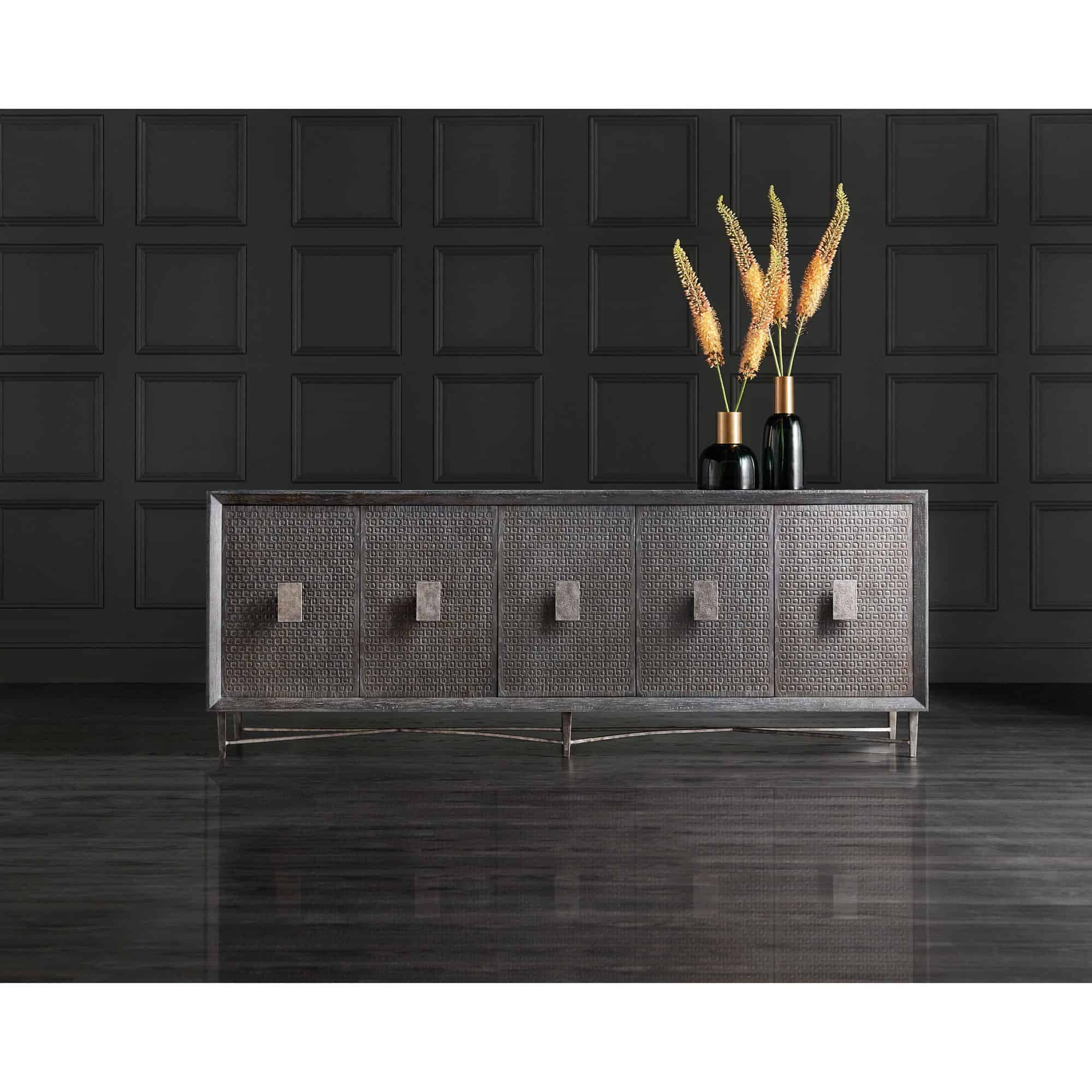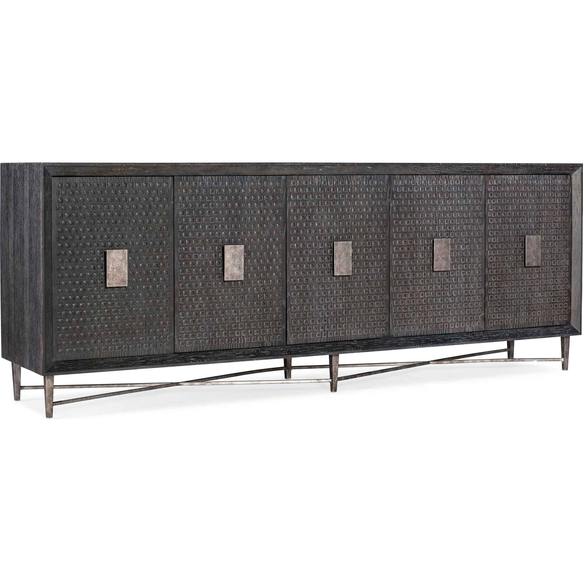 Features: Five doors One drawer behind pair of left doors creates one shelf One drawer behind pair of right doors creates one shelf Two adjustable shelves behind center door Ventilated back panel Wire management holes in back panel Levelers Metal base