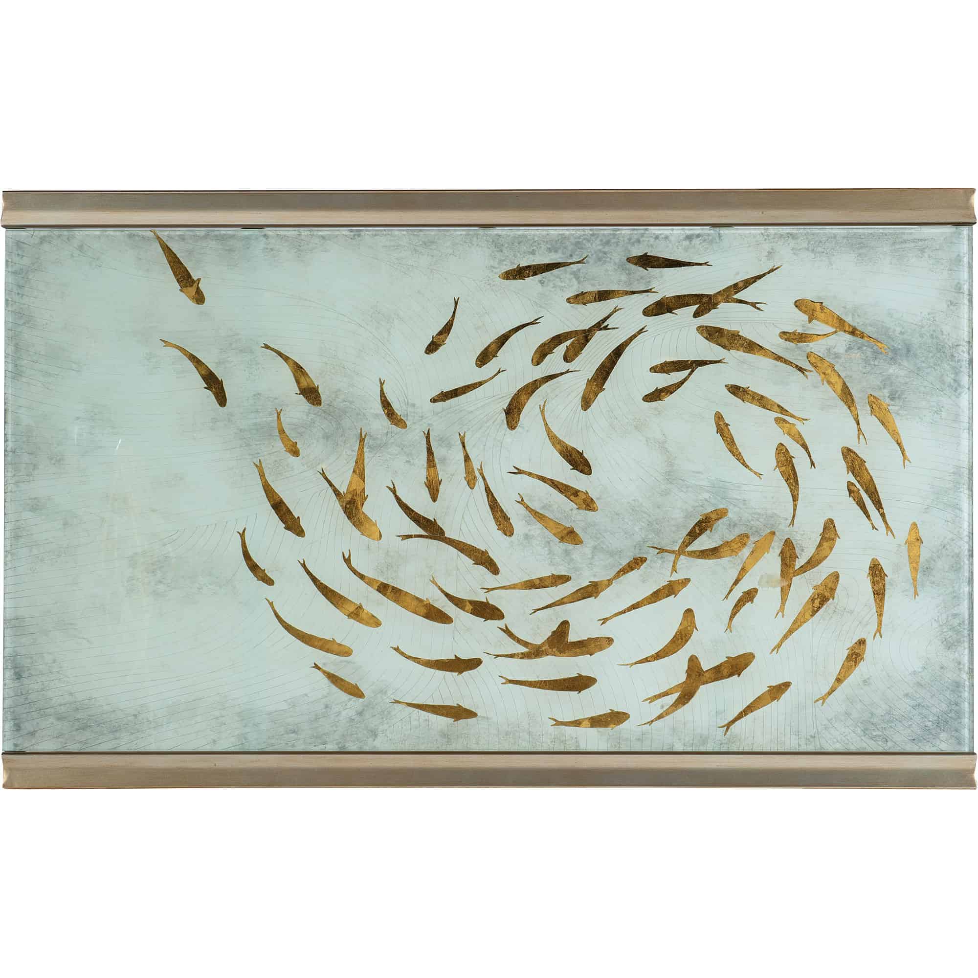 - Finish: Reverse painted tempered glass with handpainted gold colored Koi fish with a champagne gold metal frame