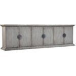 Finish: Light natural gray wood finish with large round hardware. Distressing includes rasping and gouging.