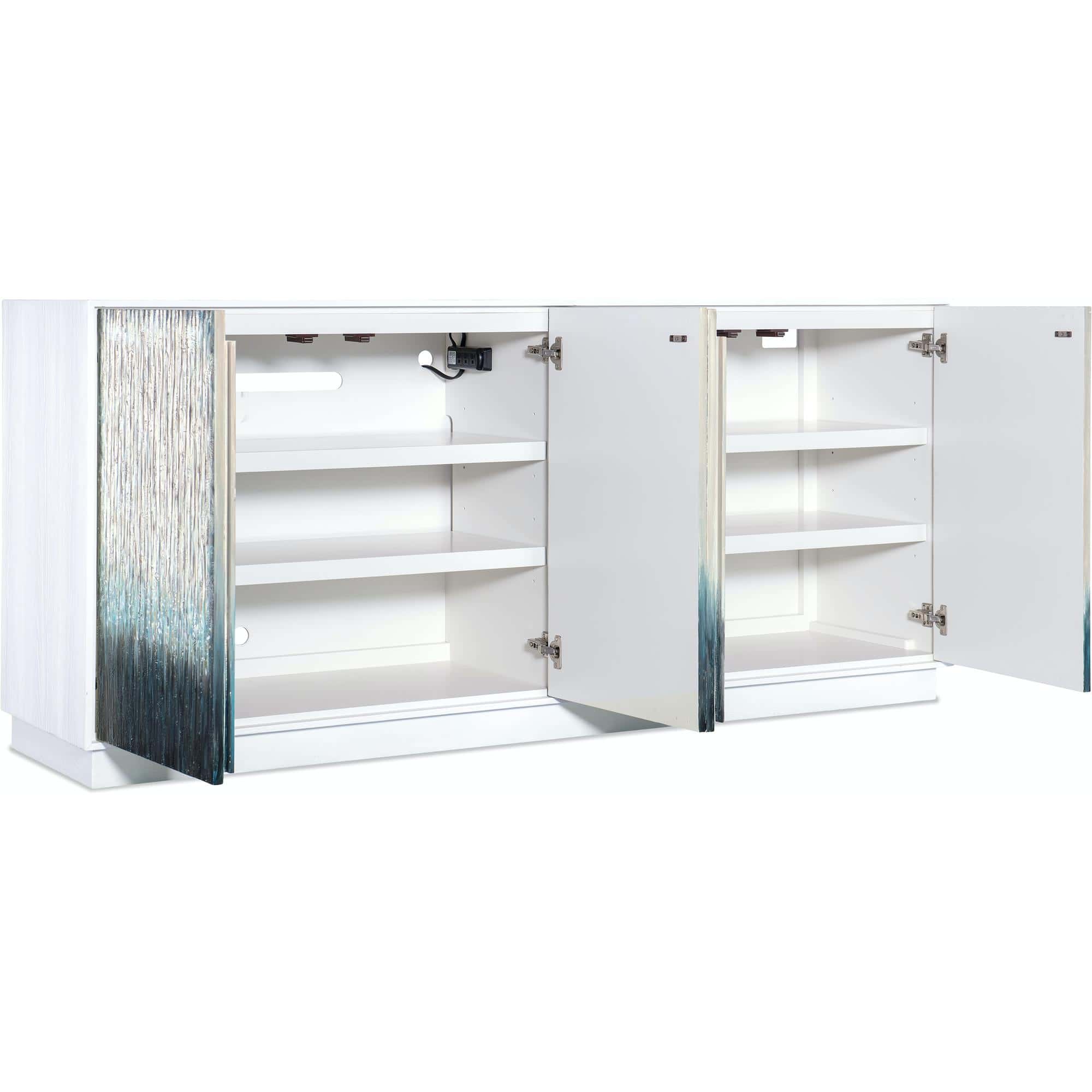 Features: Four textured doors with touch latches Two adjustable shelves behind each pair of doors FC705 Three plug outlet behind left pair of doors in upper right corner Levelers