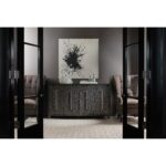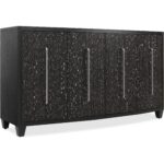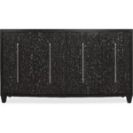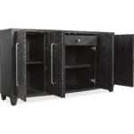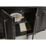 Features: Four doors with soft-close hinges and magnetic catches Black and white engineered veneer door fronts Long vertical bar hardware centered on each door Behind center doors is one self-close drawer and one adjustable wood shelf Left and right doors have one adjustable wood shelf Tapered block feet