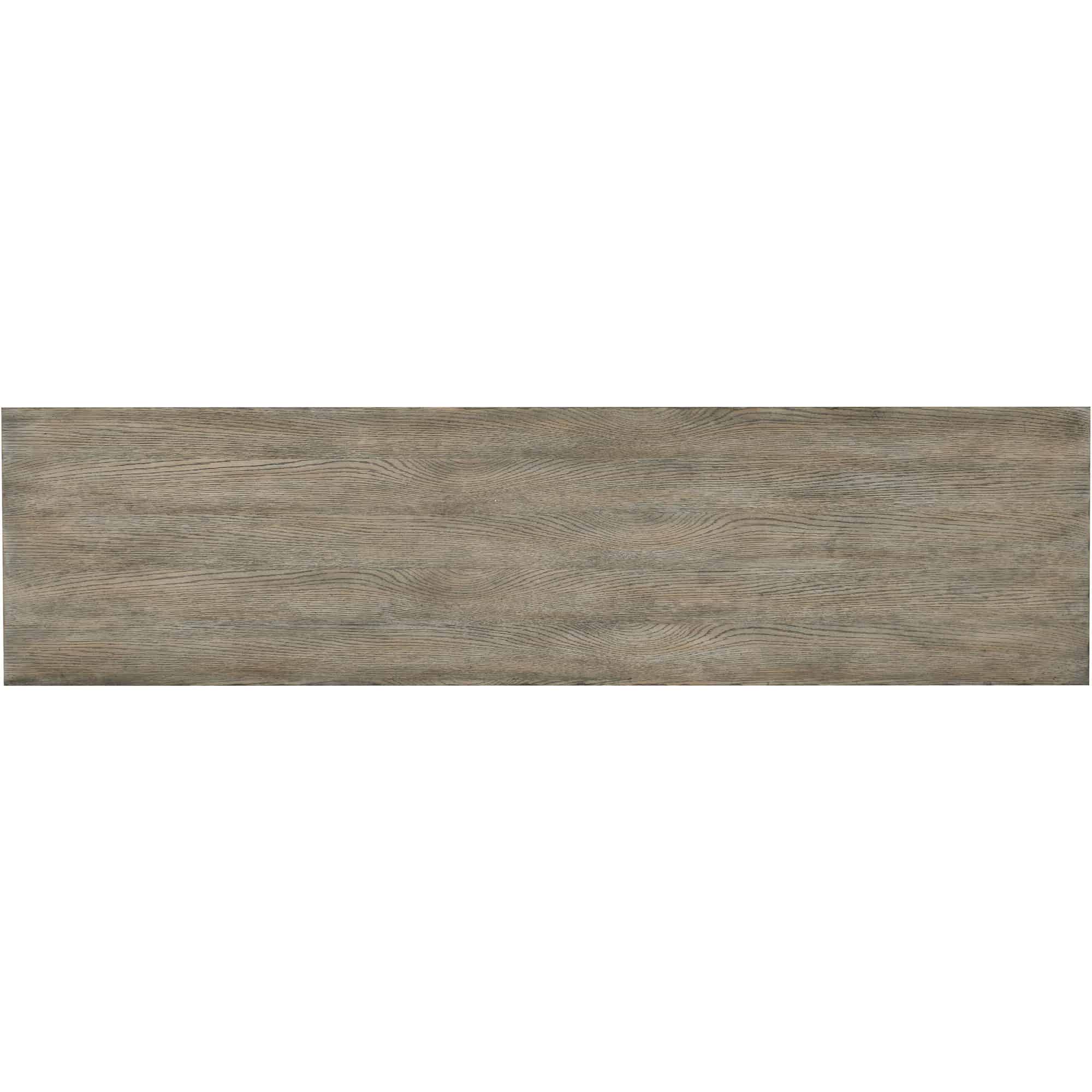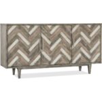 Finish: Medium wood finish with varied tones in the chevron pattern on the front, shiny pewter colored bar pulls. Distressing includes rasping and worm holes.