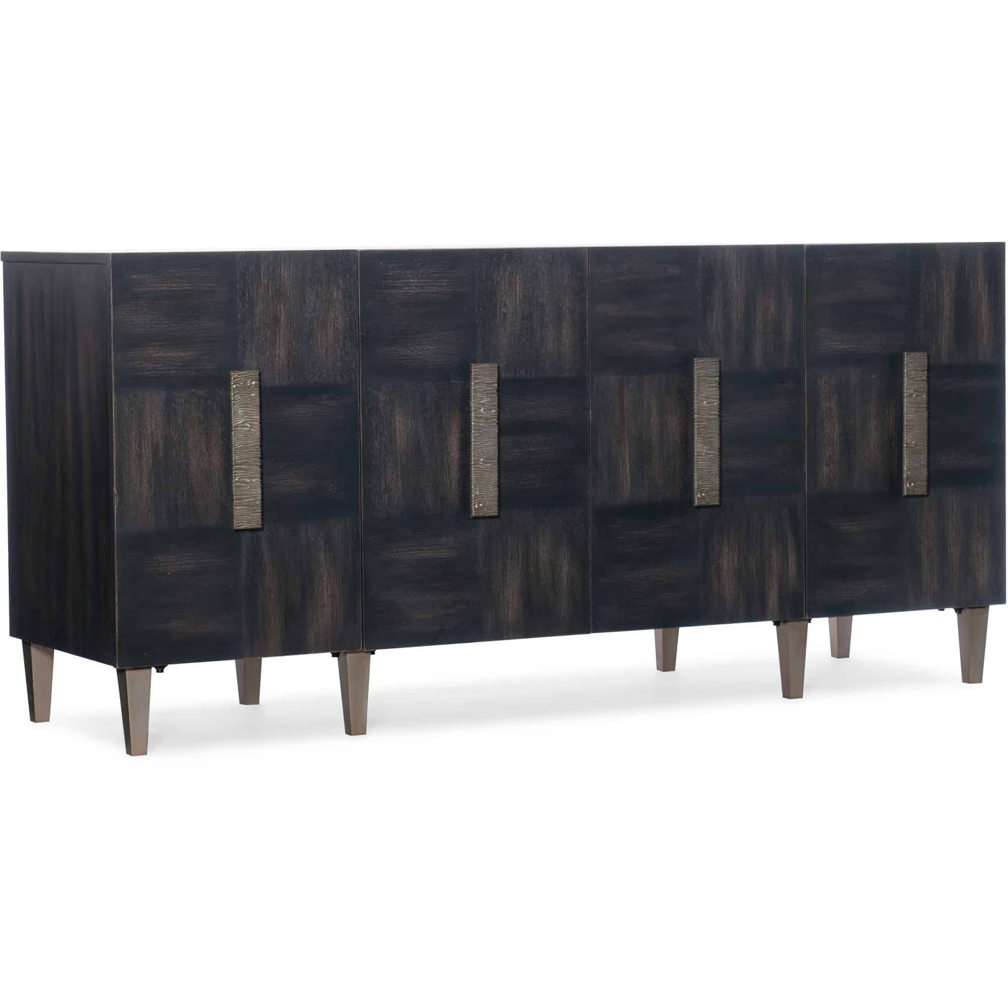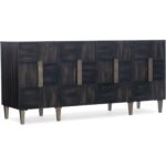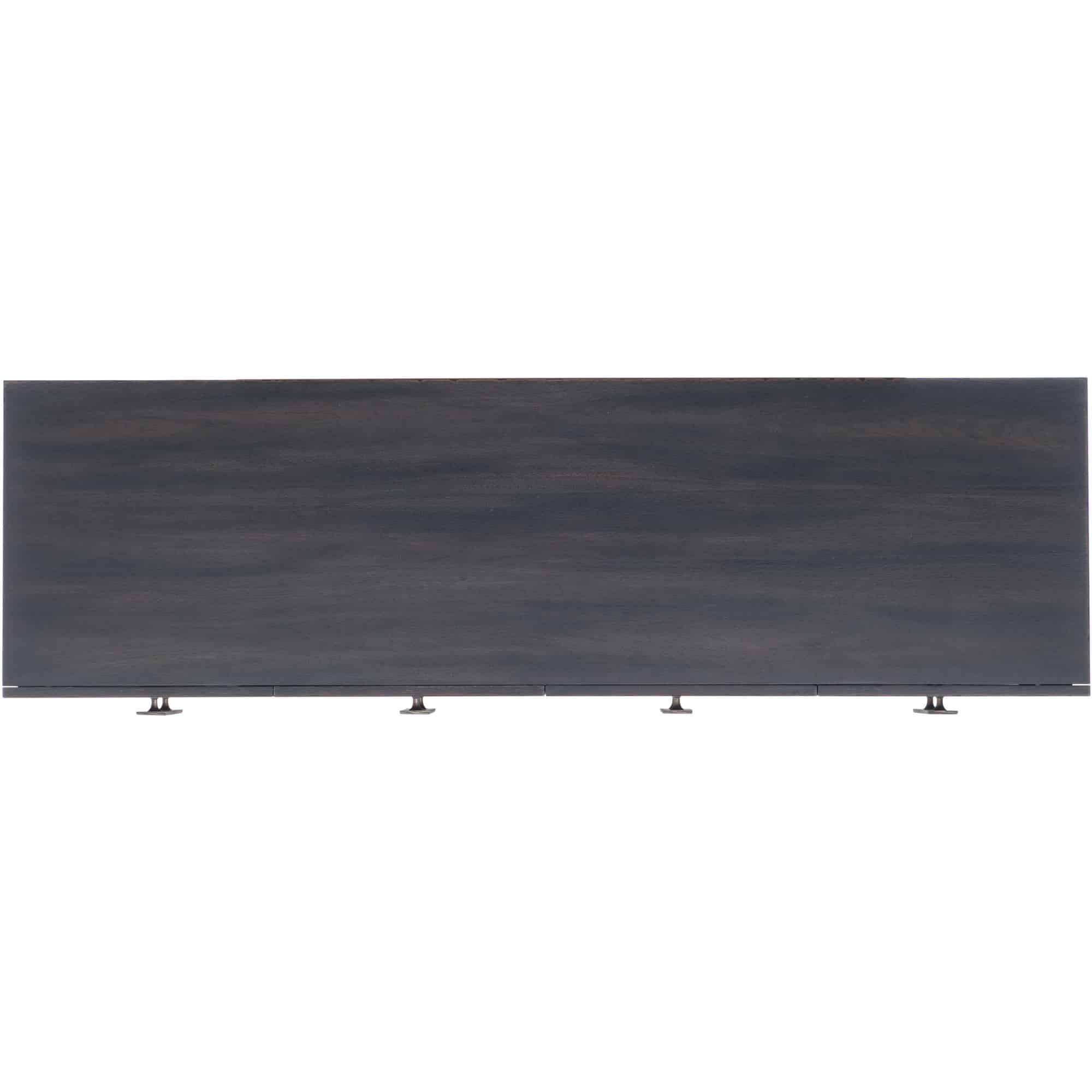 Finish: Dark walnut finish with textured pewter metal hardware. Distressing includes rasping, chopping and worm holes.