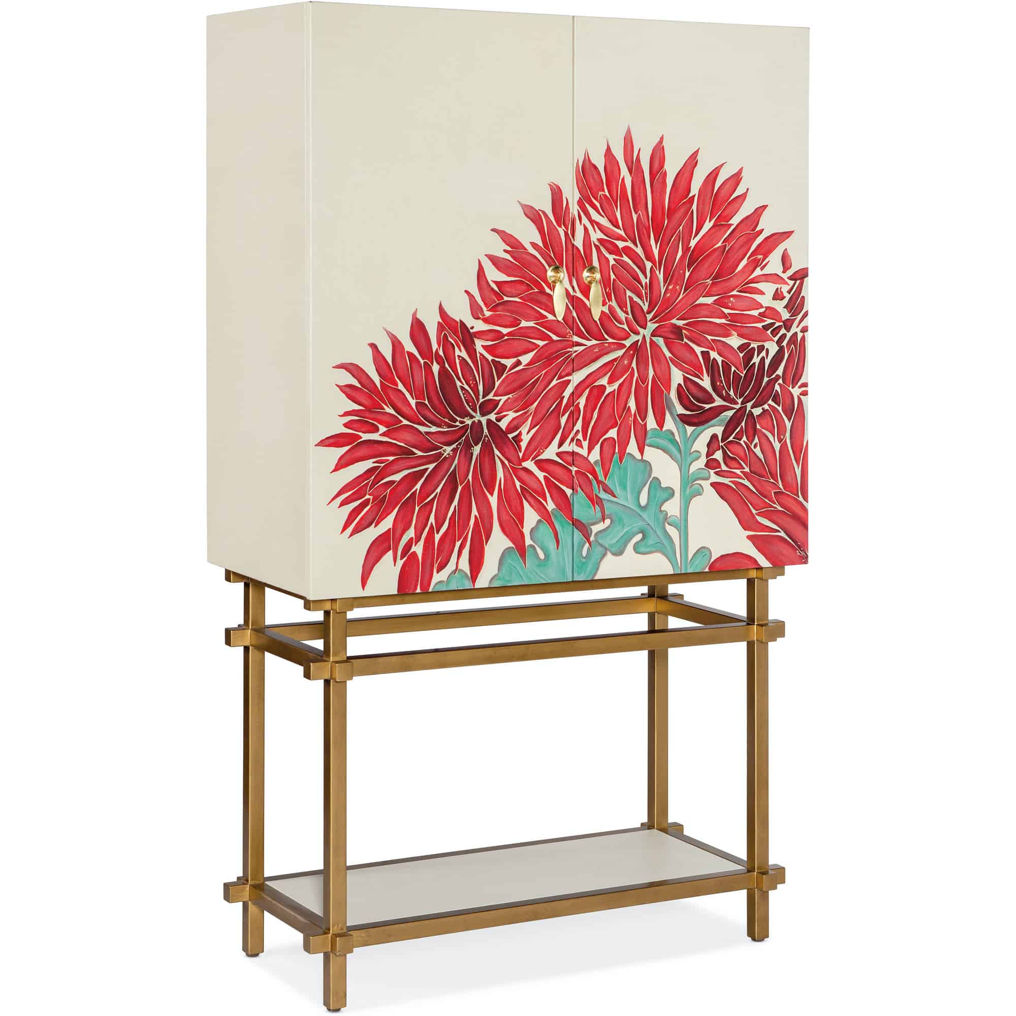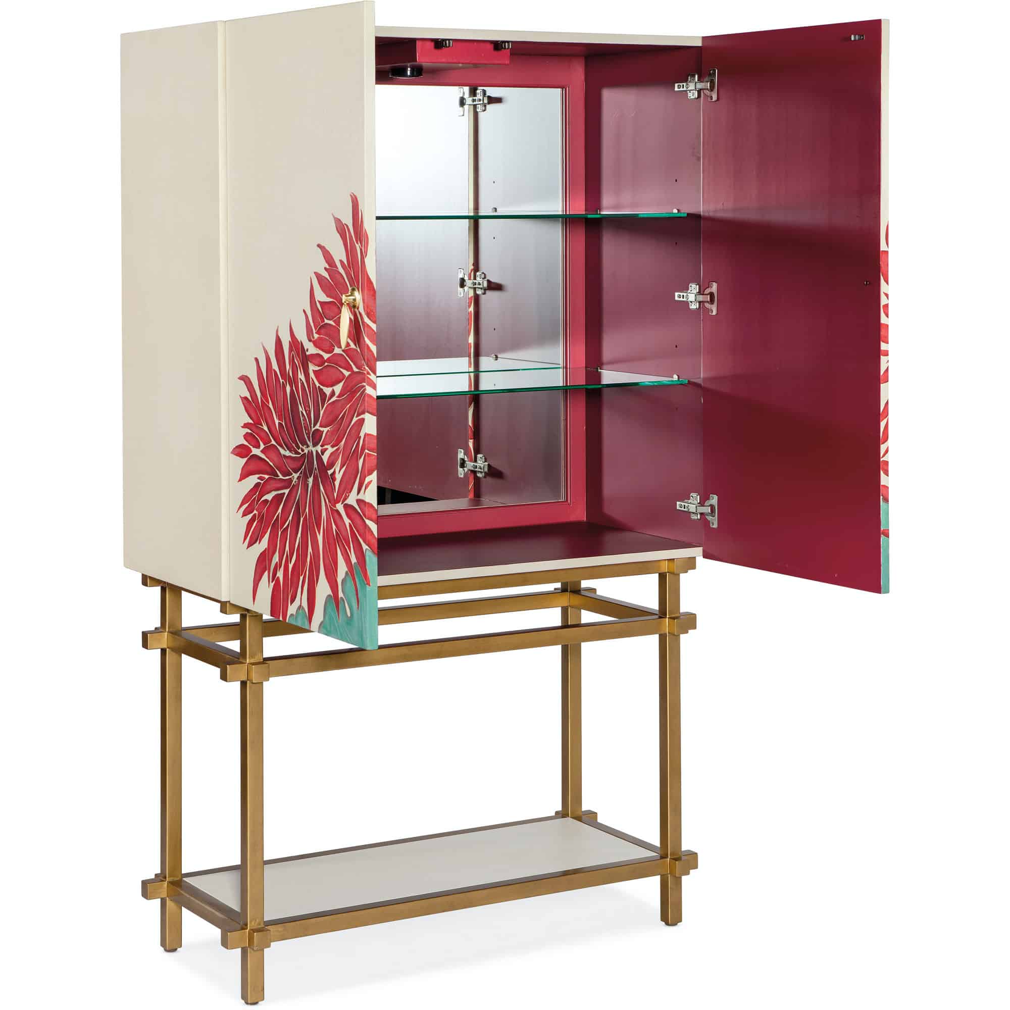- Finish: Neutral linen wrap with red and gree handpainting. Red interior with gold metal base. Gold pendant pulls.