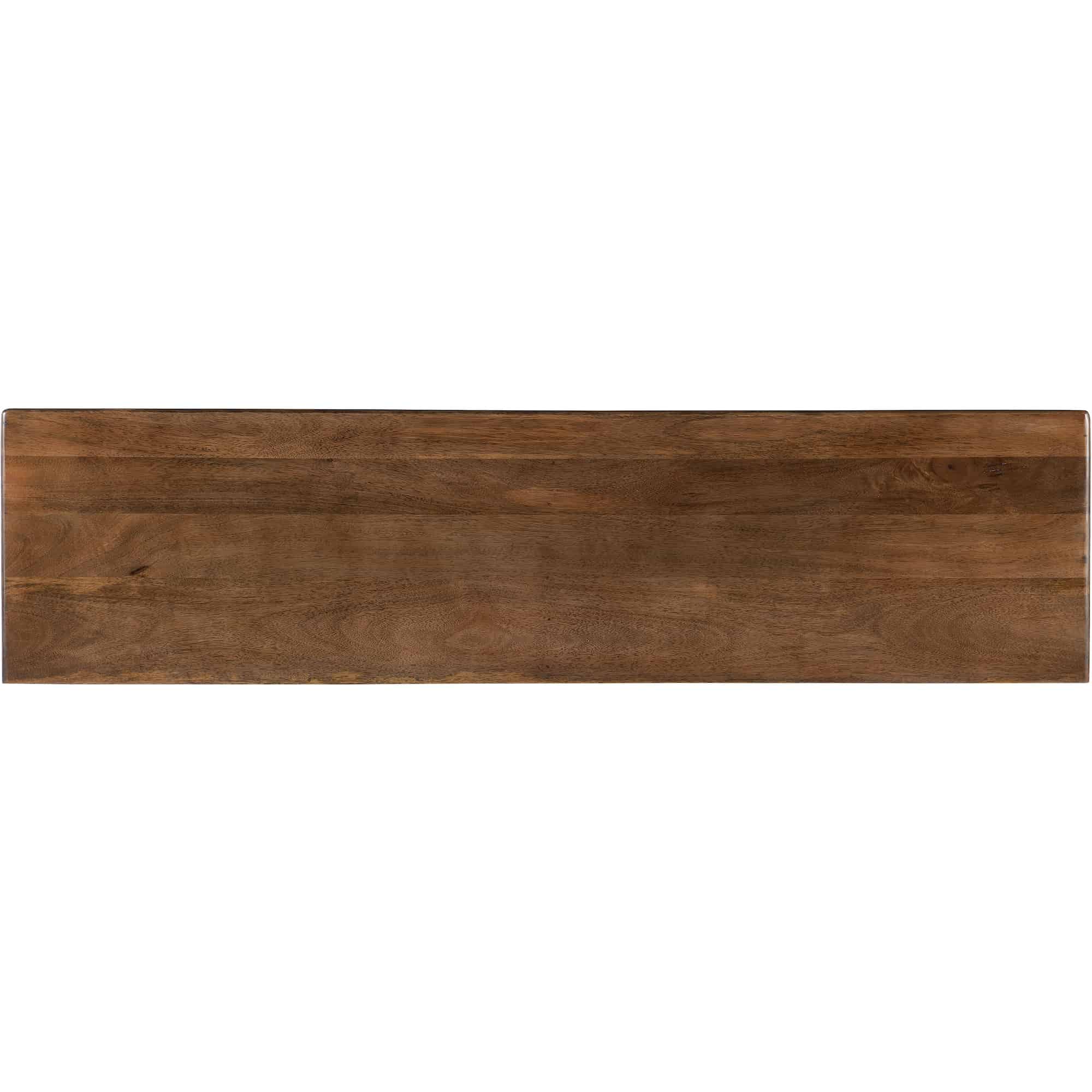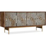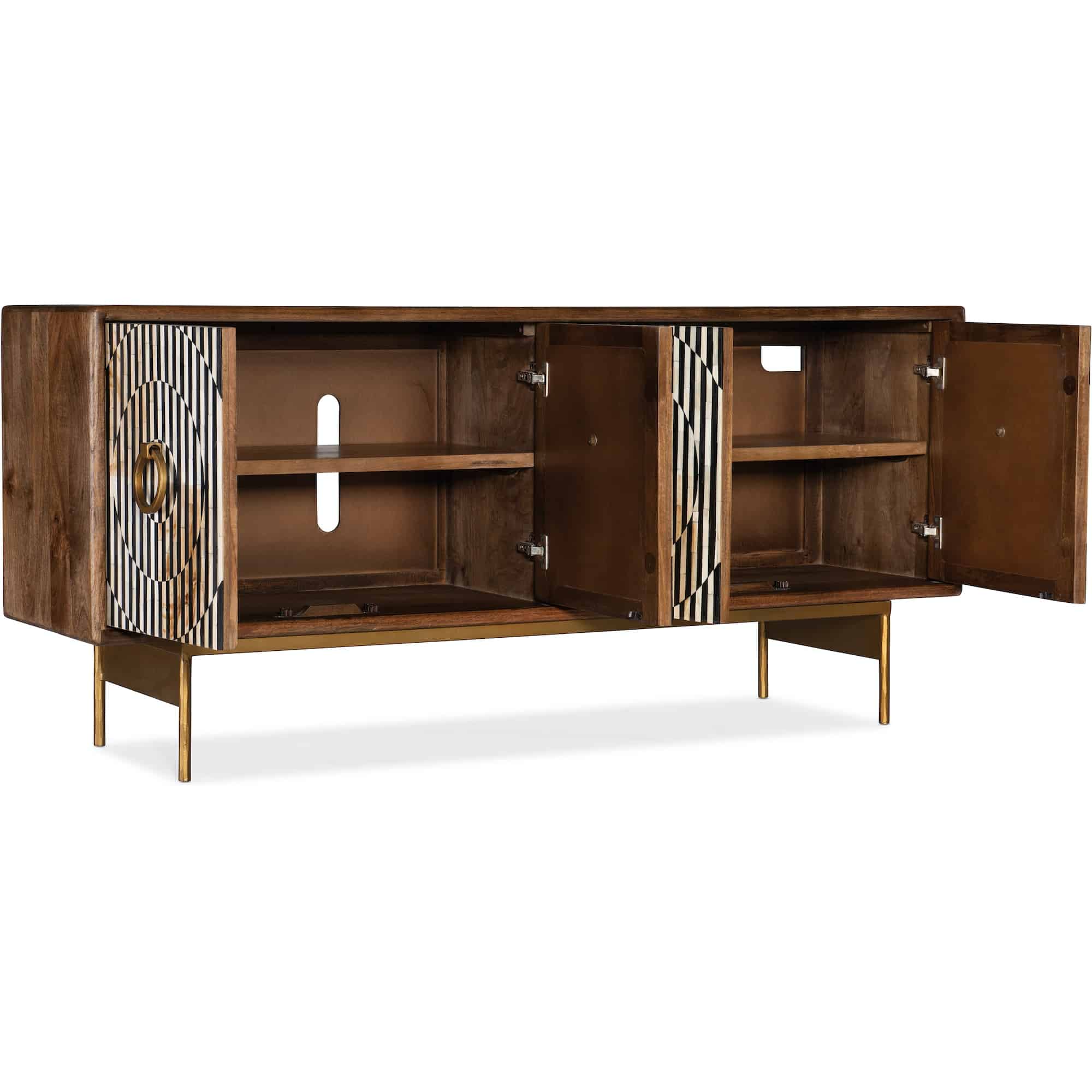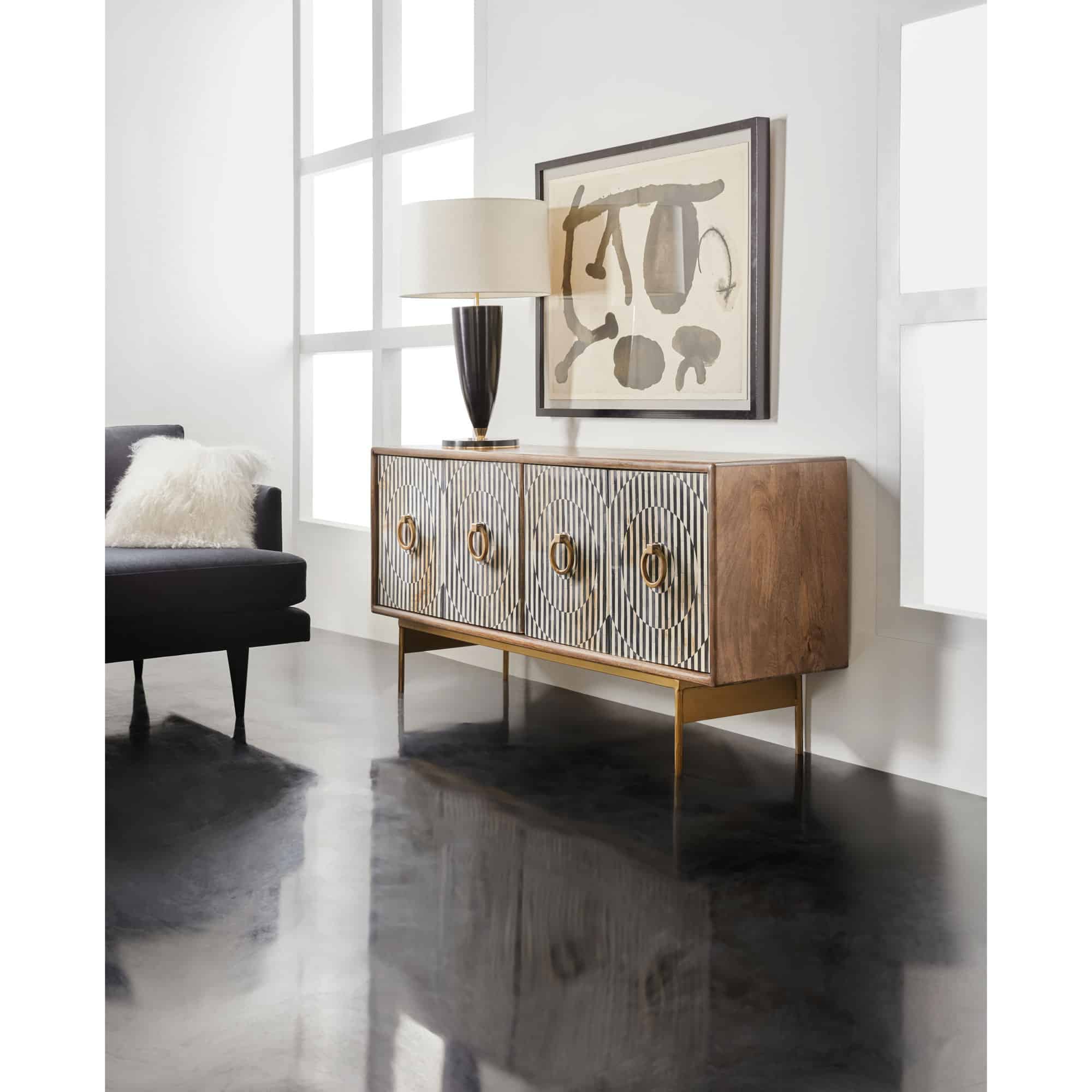 Finish: Medium wood finish on body of case with black and white bone inlay on door fronts with brushed gold metal ring pulls and gold metal base