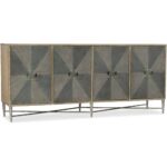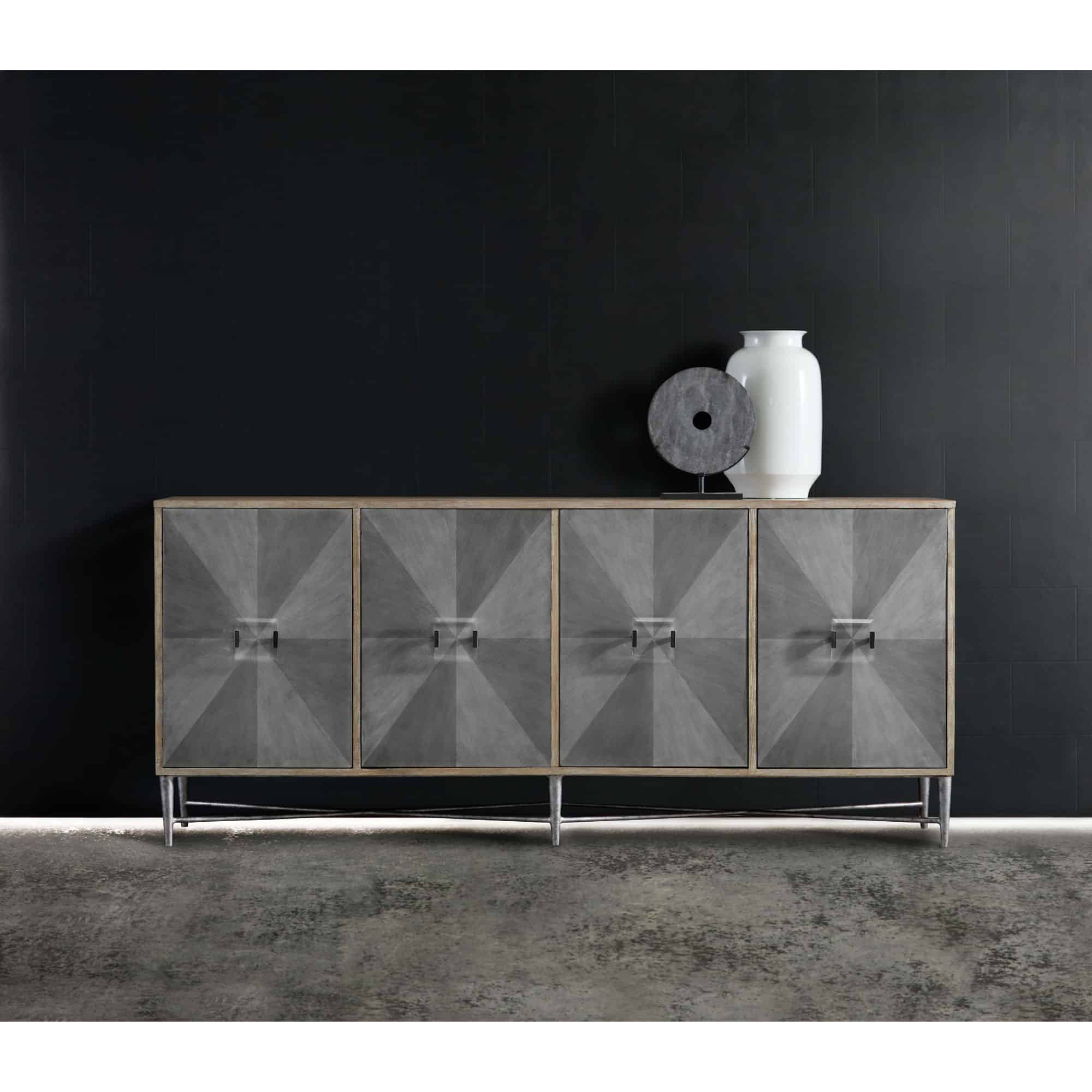 Finish: Natural finish on case with contrasting gray finish on door fronts. Distressing includes rasping.