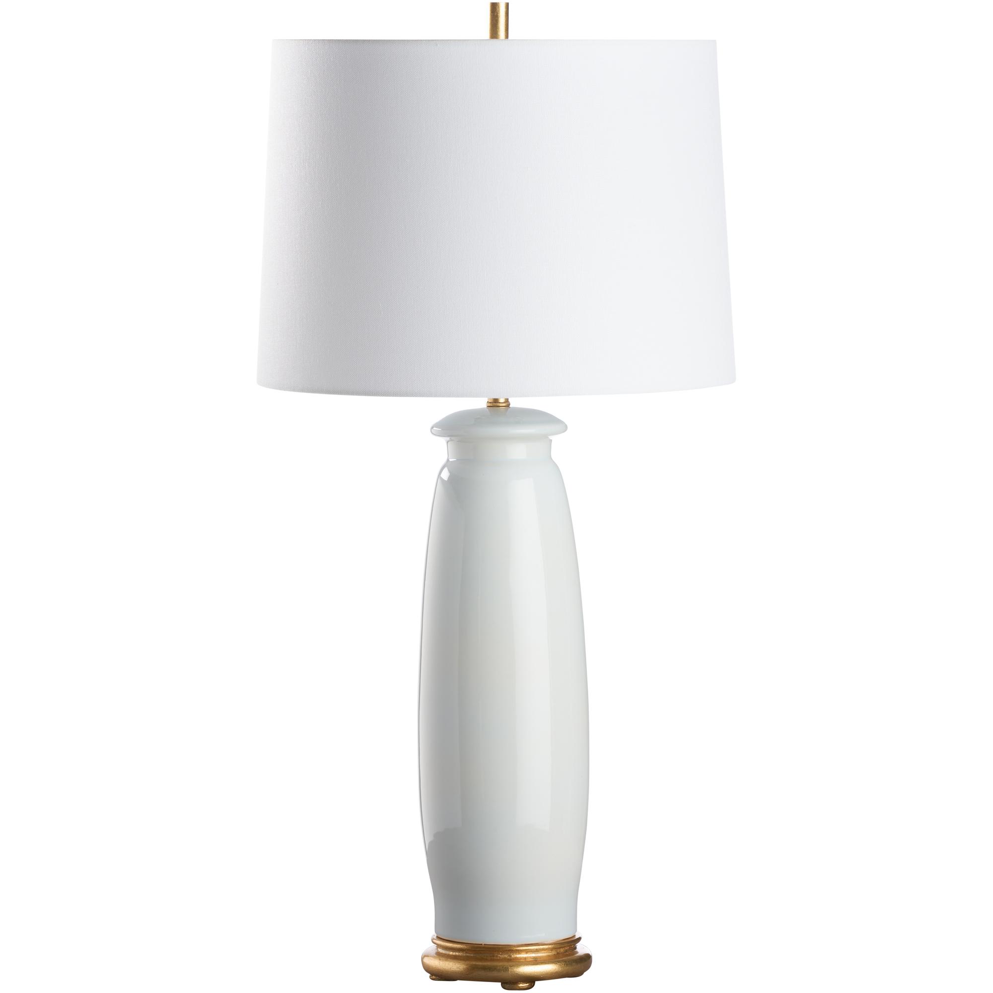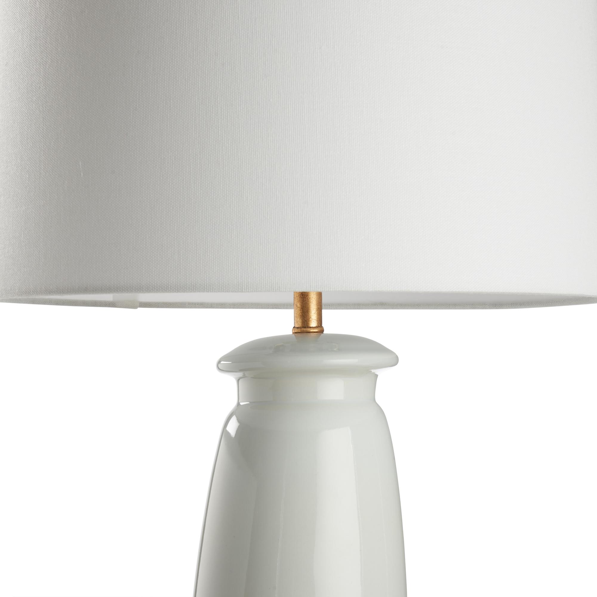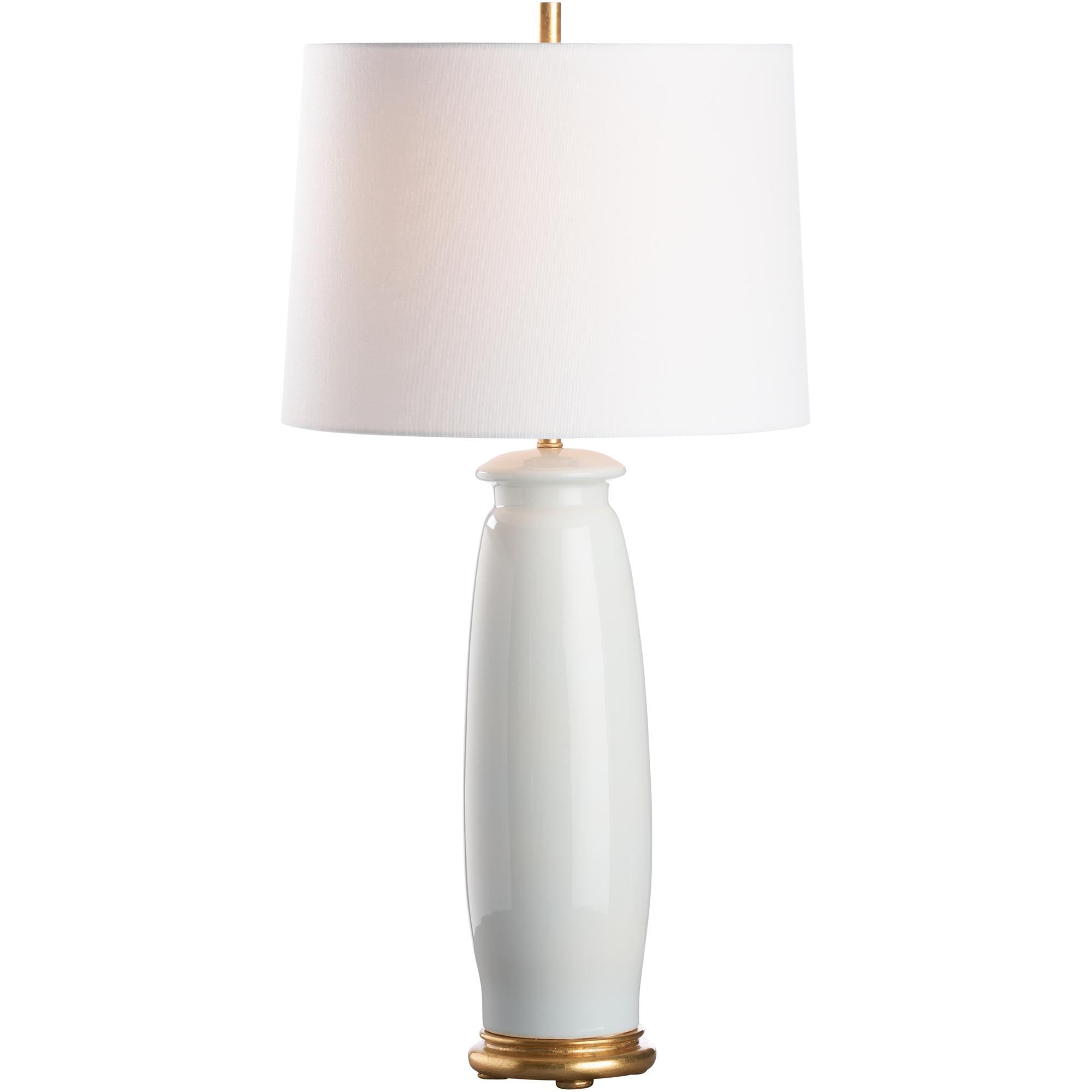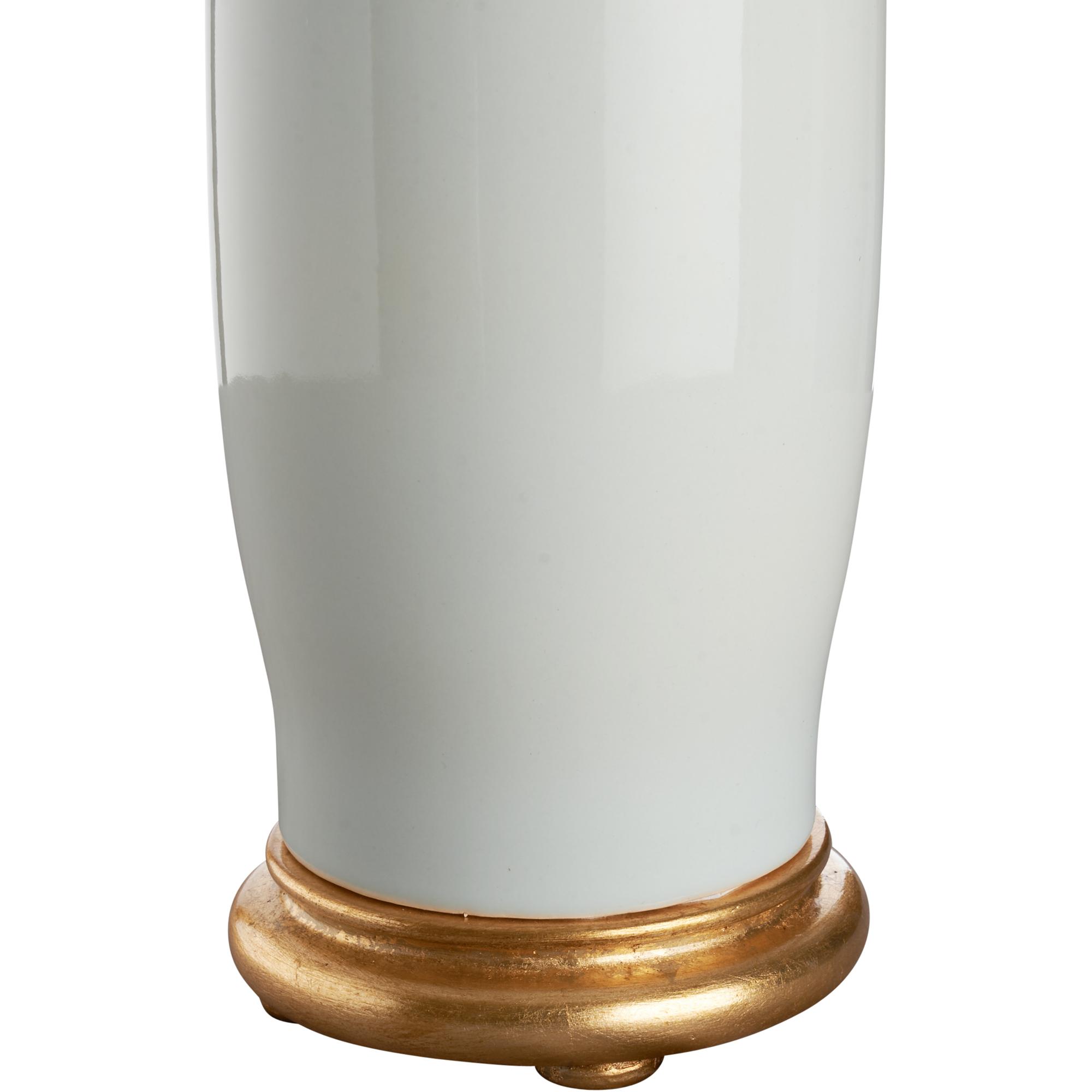 This soft white ceramic lamp exudes sleek sophistication with its smooth, minimalist silhouette. Its elegant gold base adds a touch of luxury, making it a perfect blend of modern style and timeless charm.Designed by Jamie Merida.