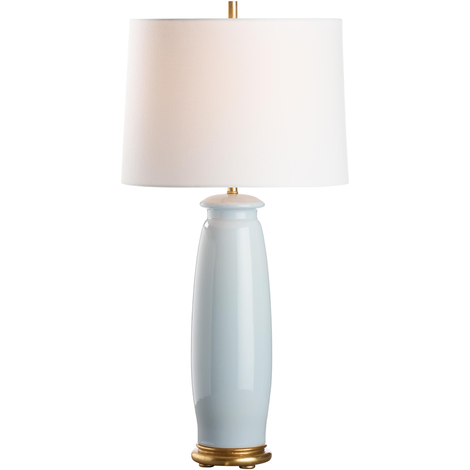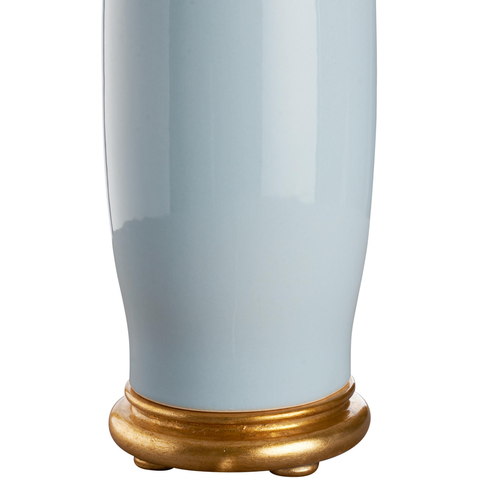 This soft blue ceramic lamp exudes sleek sophistication with its smooth, minimalist silhouette. Its elegant gold base adds a touch of luxury, making it a perfect blend of modern style and timeless charm. Designed by Jamie Merida.