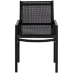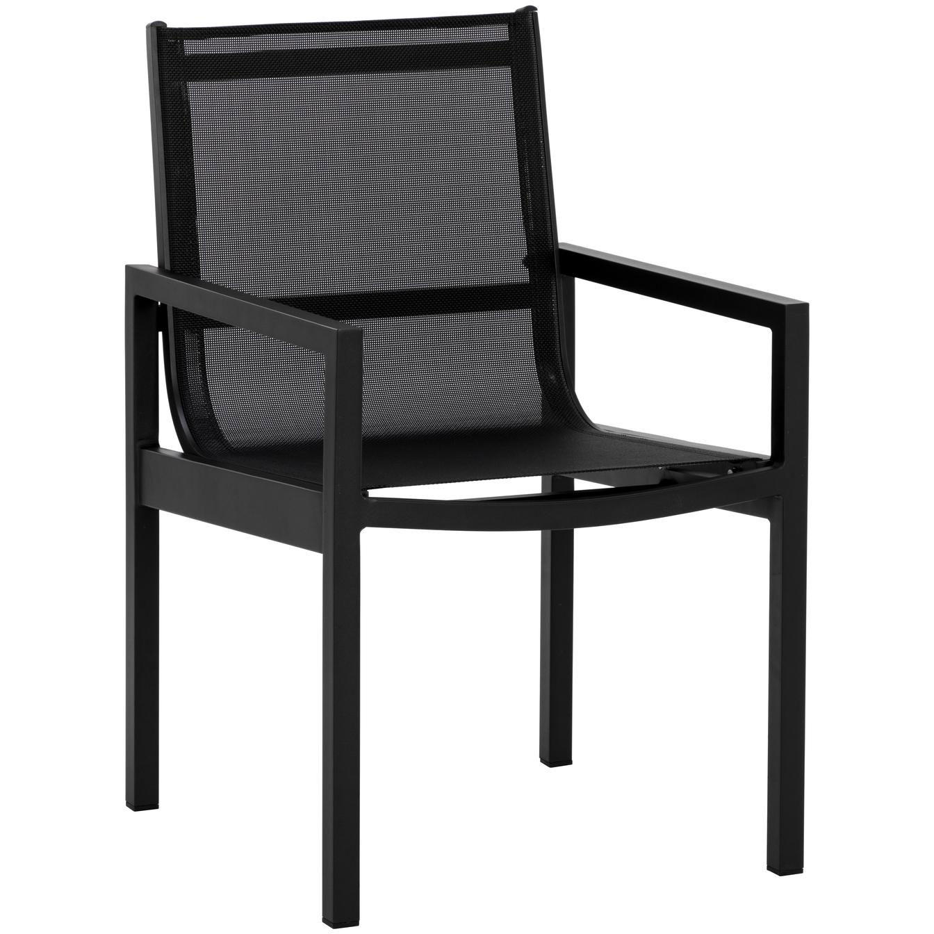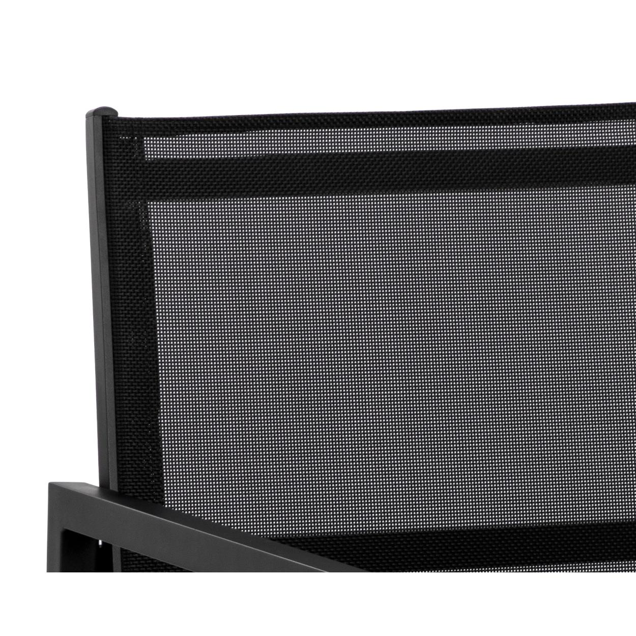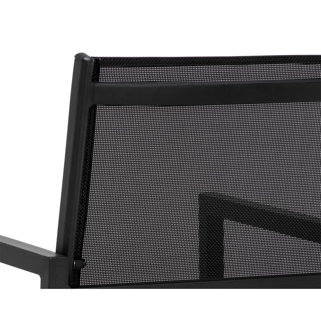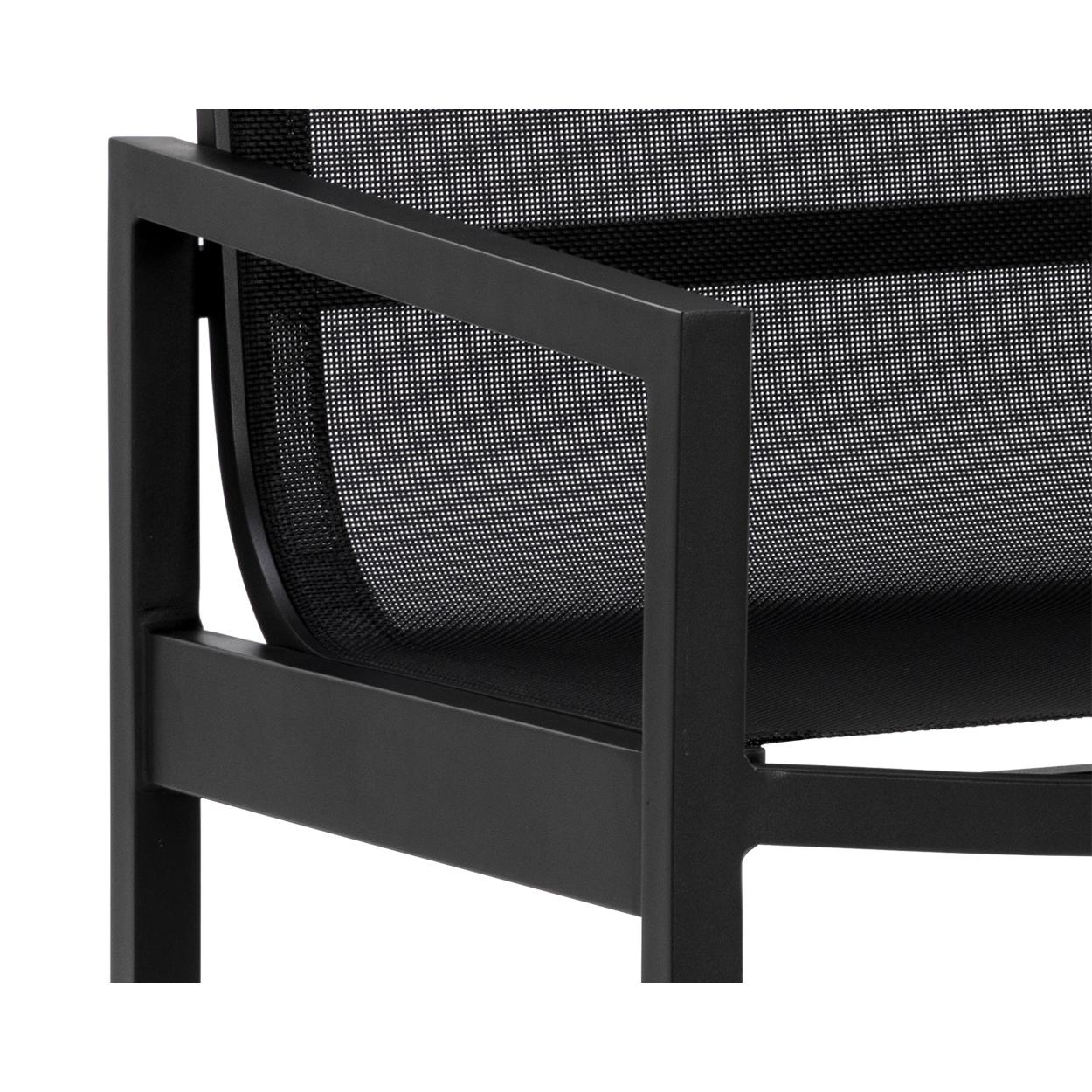 The Merano Dining Armchair is a modern take on classic design. The black powder-coated aluminum frame beautifully complemments the breathable mesh seatback for a comfortable dining experience.