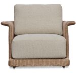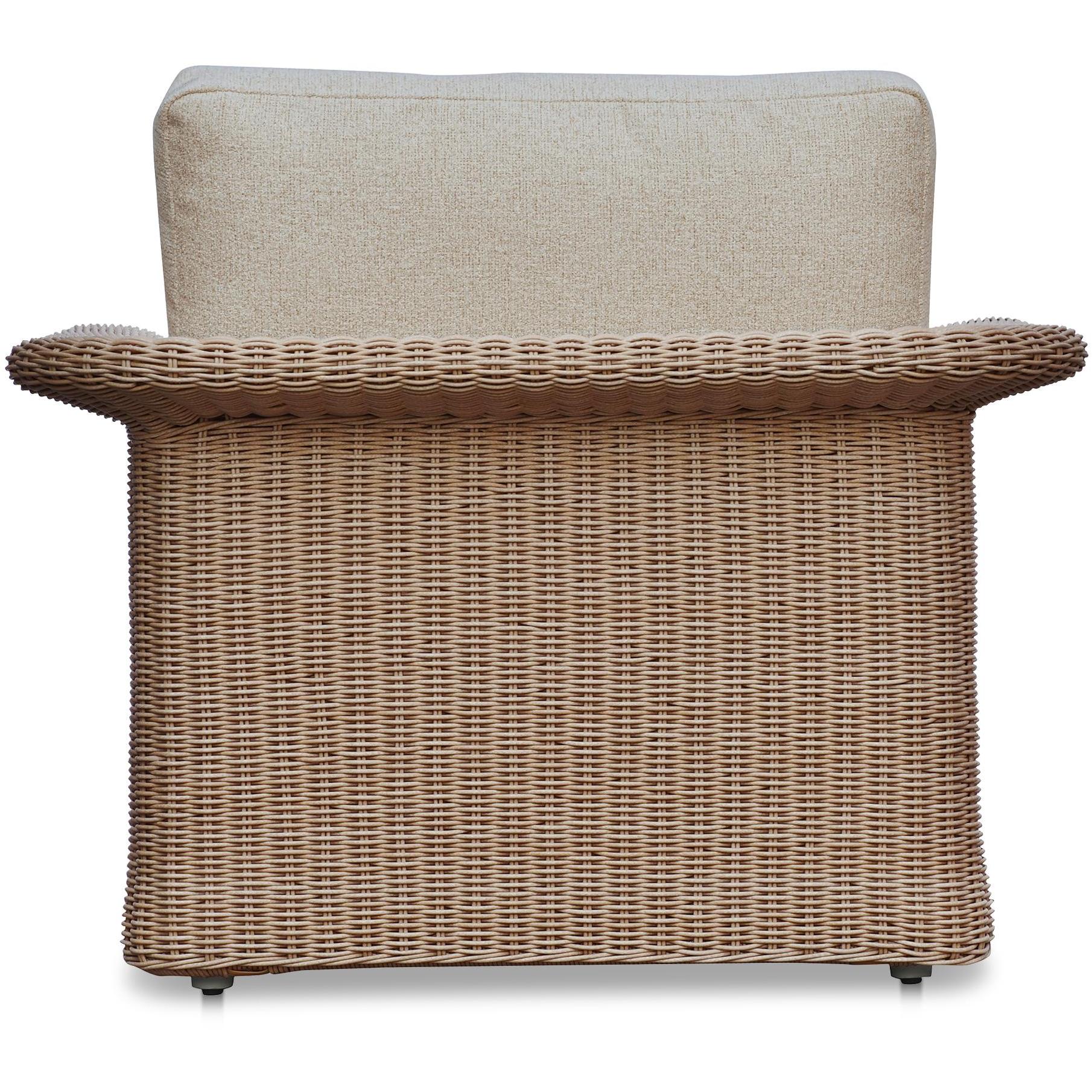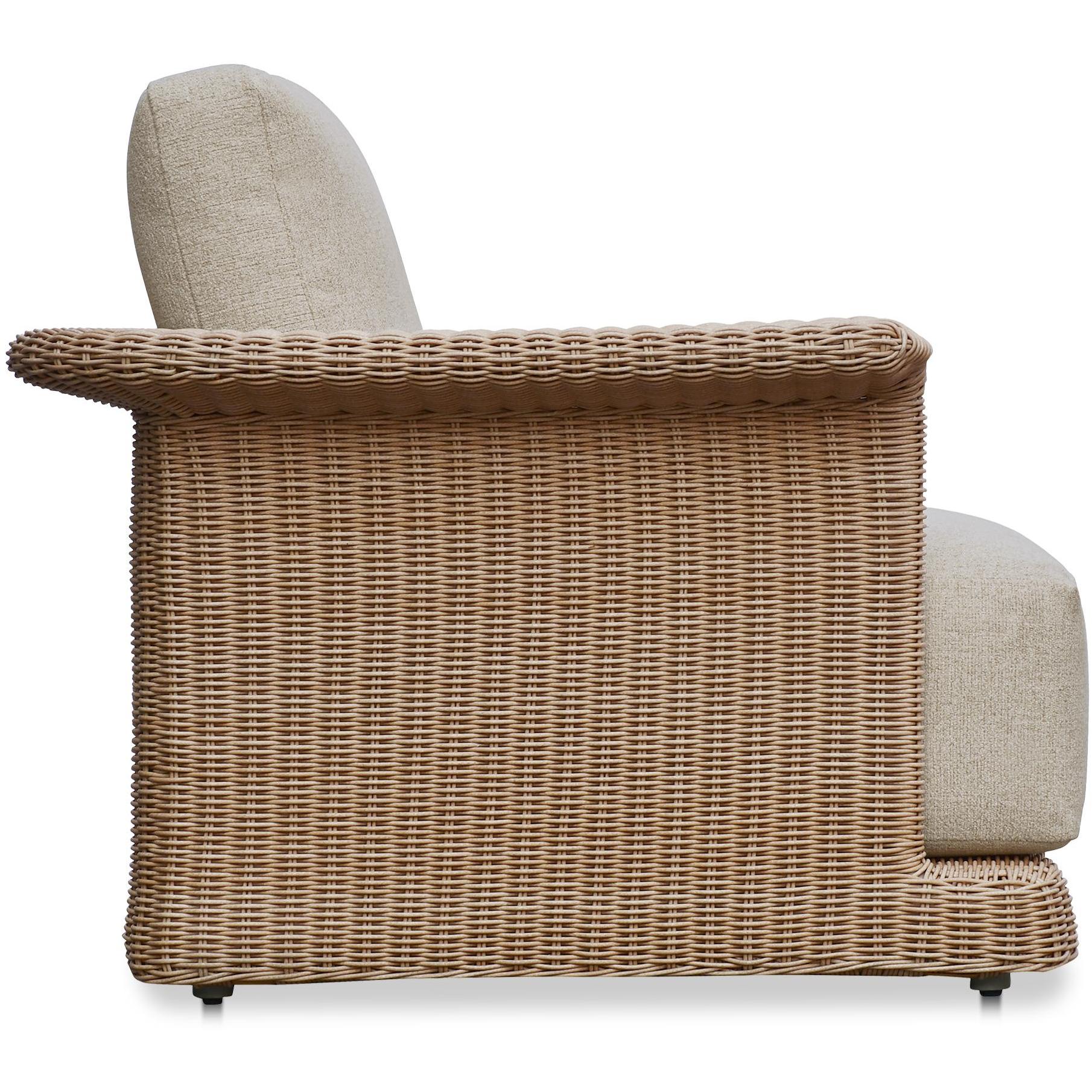 The Meredith accent chair’s graceful tulip silhouette and curved armrests create visual interest, while generous cushioning offers indulgent comfort. Artfully woven synthetic wicker over an aluminum frame marries durability with aesthetic appeal. Quick-dry foam and Dacron fiber ensure lasting resilience, while the sophisticated hue complements various exterior designs.