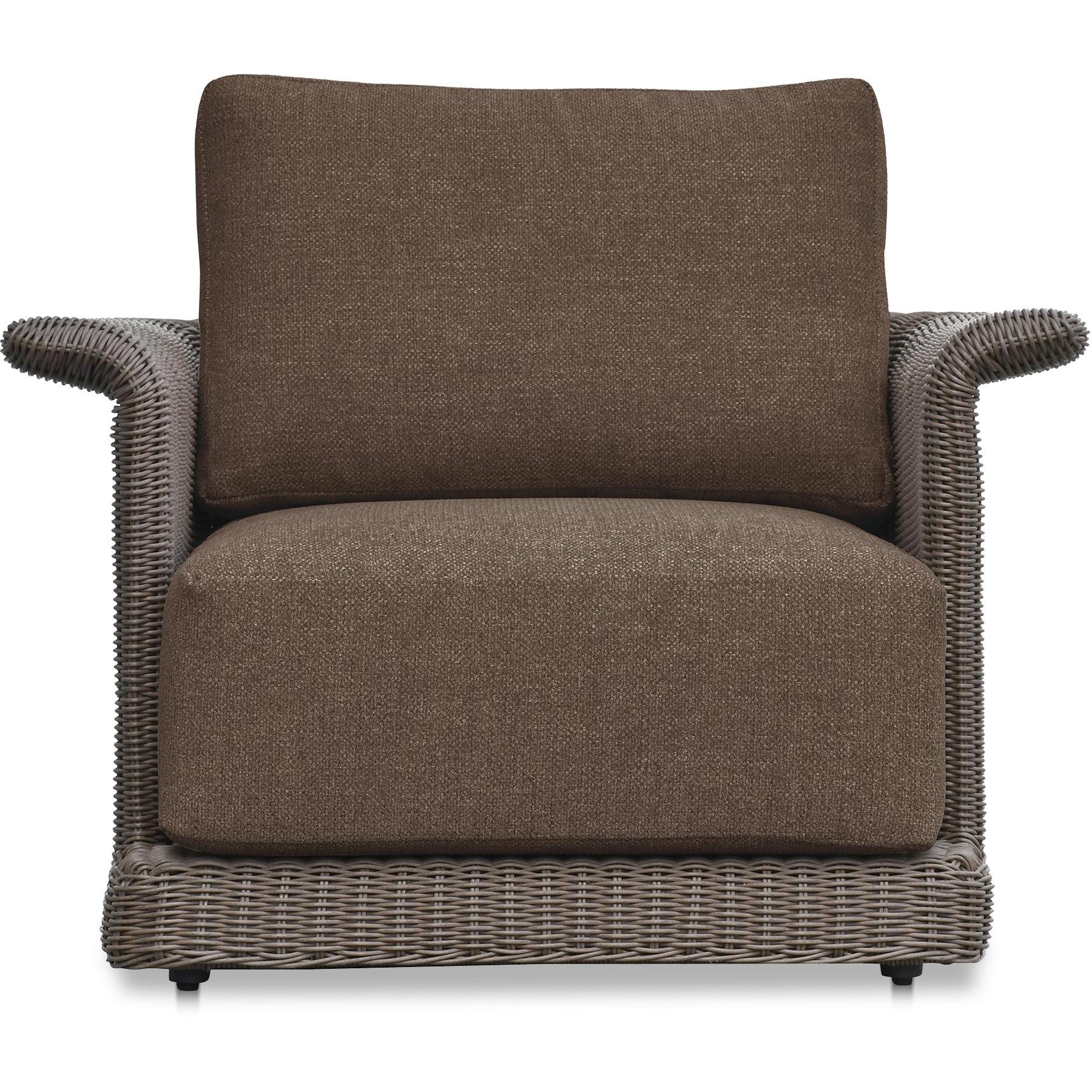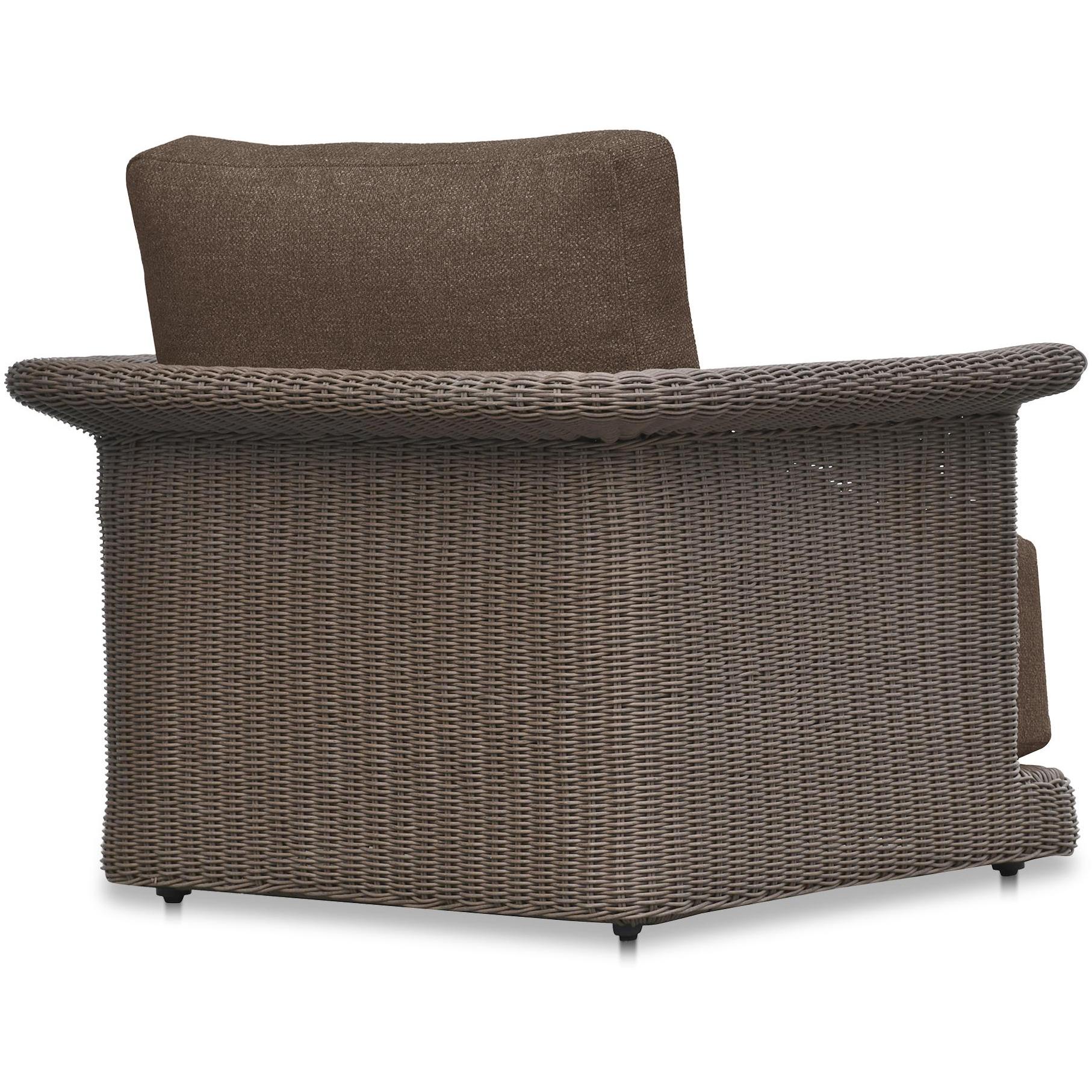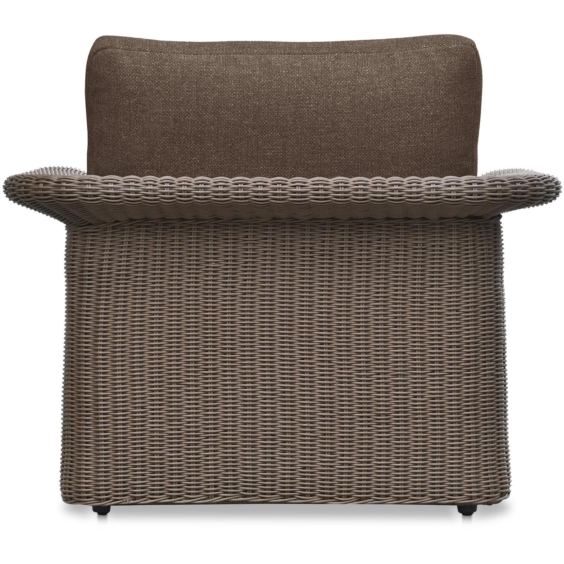The Meredith accent chair’s graceful tulip silhouette and curved armrests create visual interest, while generous cushioning offers indulgent comfort. Artfully woven synthetic wicker over an aluminum frame marries durability with aesthetic appeal. Quick-dry foam and Dacron fiber ensure lasting resilience, while the sophisticated hue complements various exterior designs.