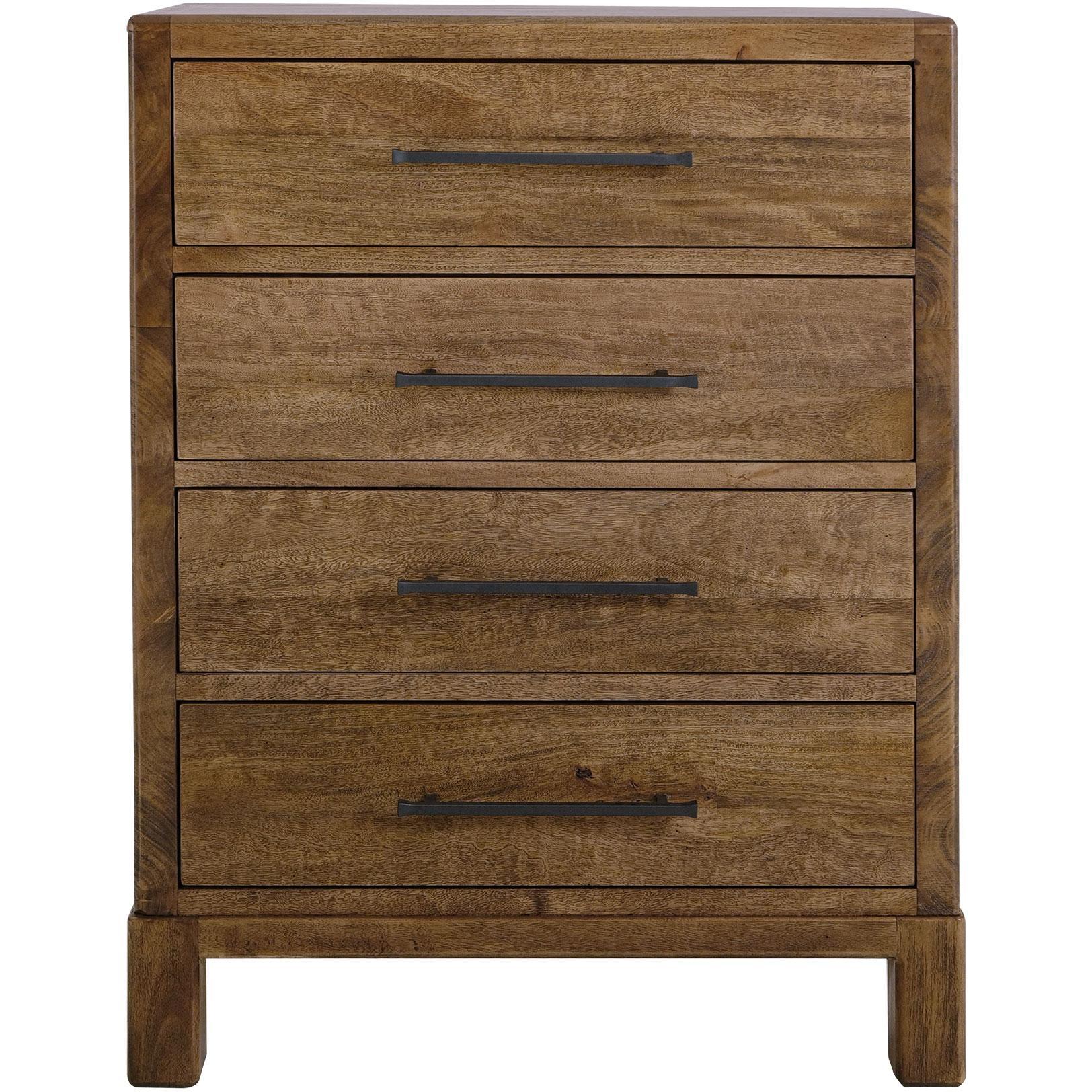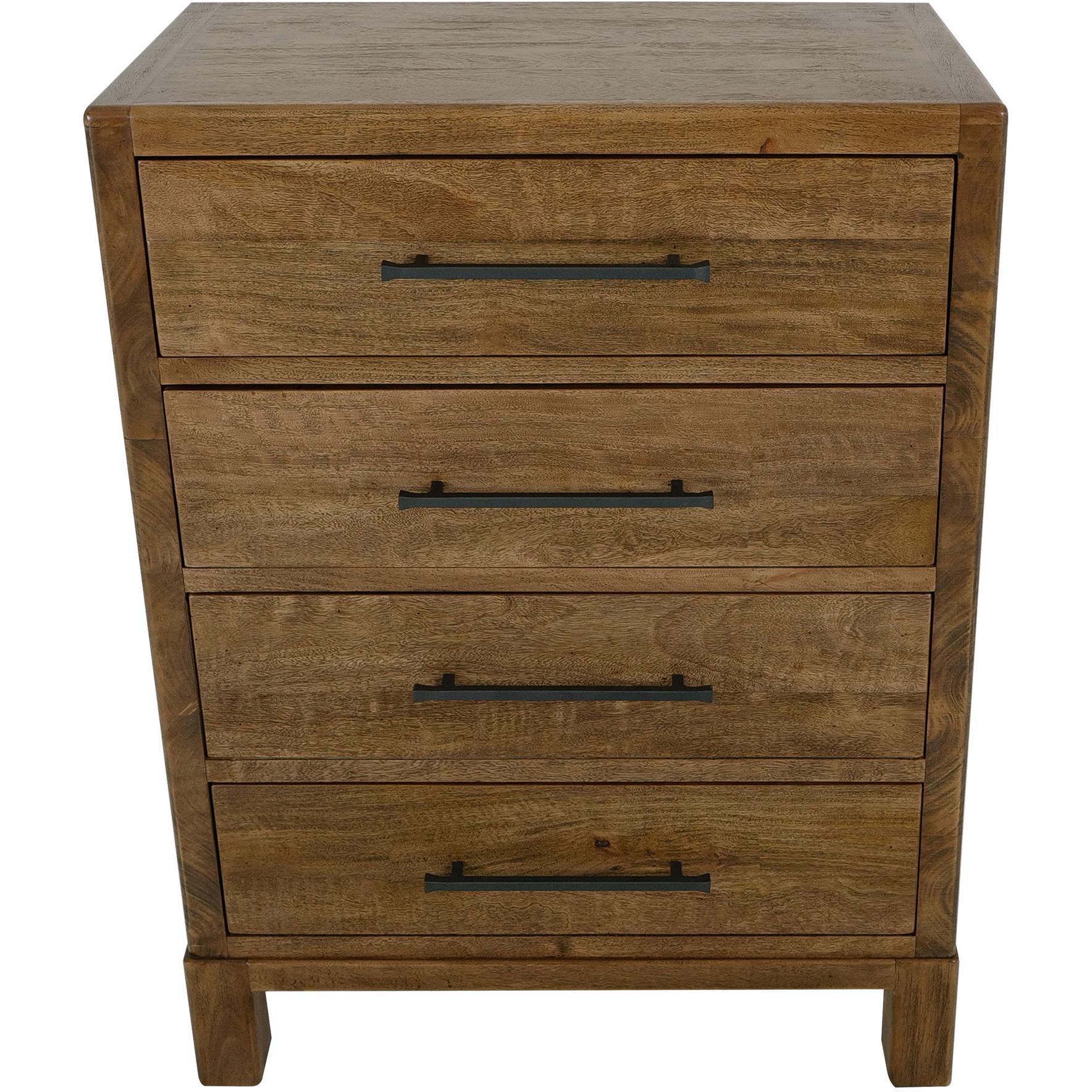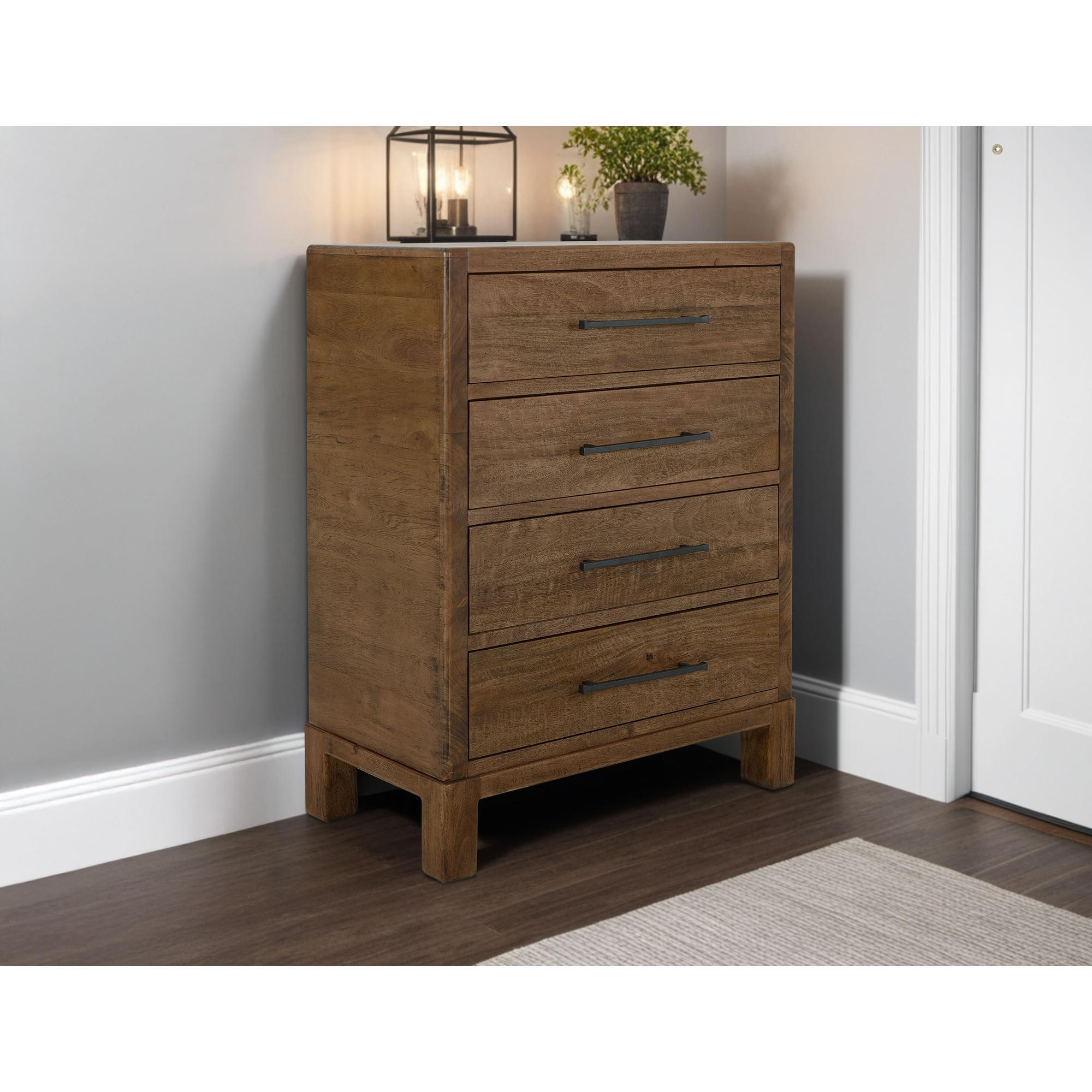 The Merida Collection features an exquisite bedroom set that perfectly fuses sustainability and design, embodying eclectic modern style. Made from environmentally friendly mango and melina wood, it combines beauty and functionality to enhance your space. The brown finish highlights the natural elegance of the wood, creating a serene and inviting atmosphere. The chest features a minimalist design characterized by clean lines and a rectangular shape; it not only offers practical storage solutions but also enhances the aesthetic appeal of your bedroom with its timeless charm. The chest stands on four sturdy legs, ensuring stability and durability. The Merida chest is a versatile addition that complements any bedroom decor.