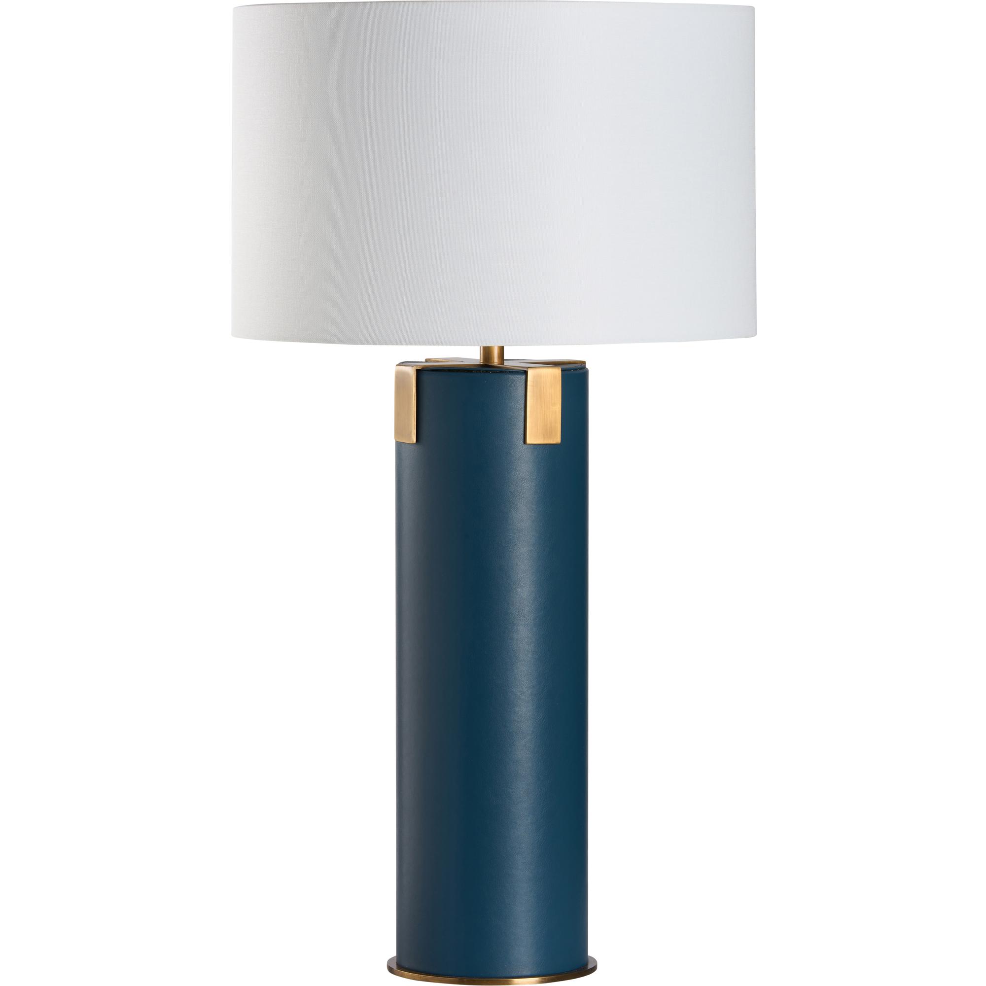 The Meridian Lamp features a sleek cylindrical base wrapped in rich blue leather, accented with antique brass detailing. Sophisticated and tailored, it brings a refined pop of color to any room.