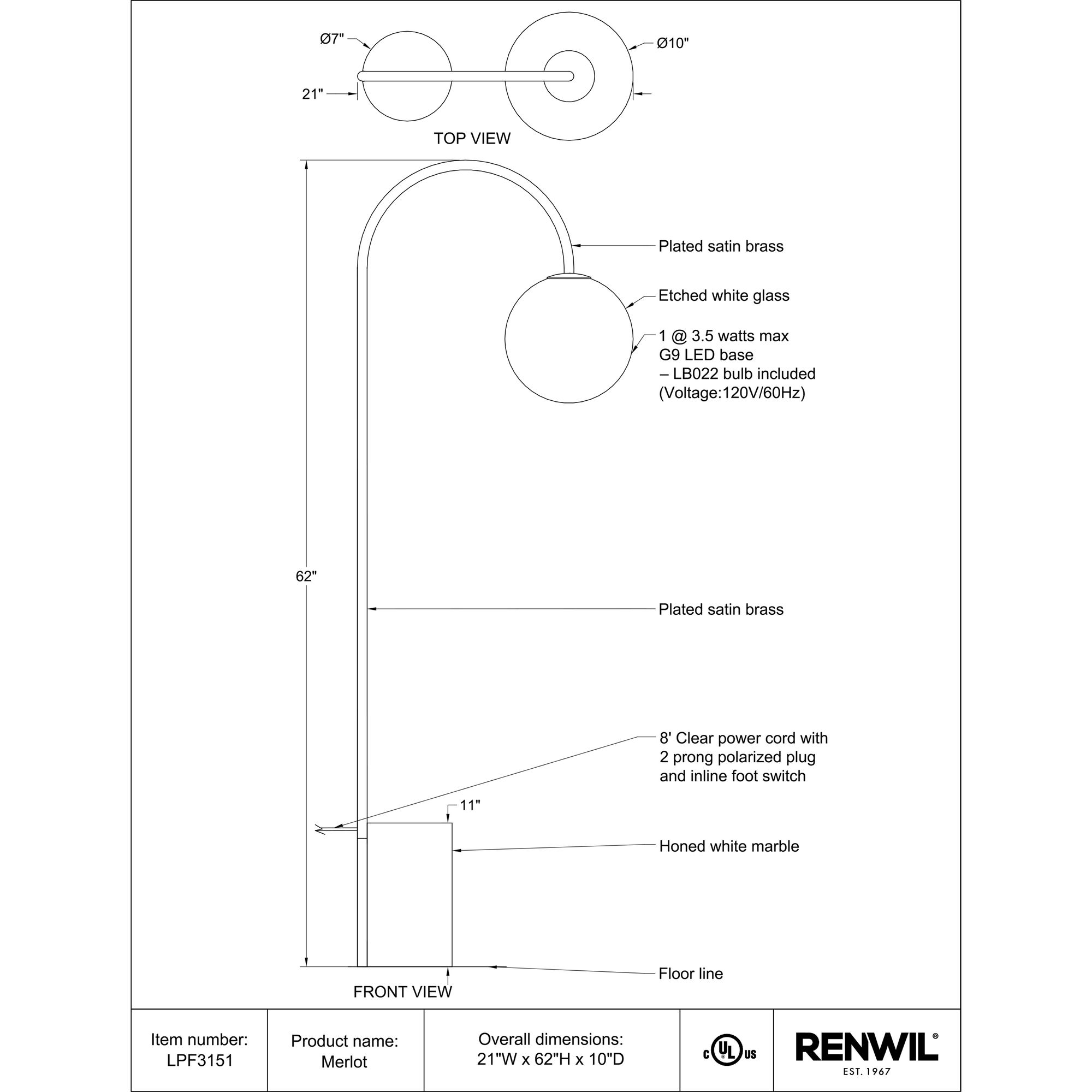 Enhance your home’s aesthetic appeal with the Merlot 62″ Tall Satin Brass Floor Lamp. Its sleek and elegant design, coupled with the stunning white globe glass shade, ensures an alluring visual impact that adds style and class to your space. This lamp connects seamlessly with standard E26 sockets, allowing you to easily replace bulbs with a maximum wattage of 60W, offering endless lighting possibilities. Control the light effortlessly with the foot switch, providing unparalleled convenience and unparalleled ease of use. With this lamp, you’ll enjoy a harmonious blend of sophistication, quality construction, and functionality.