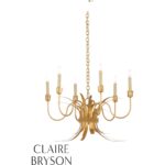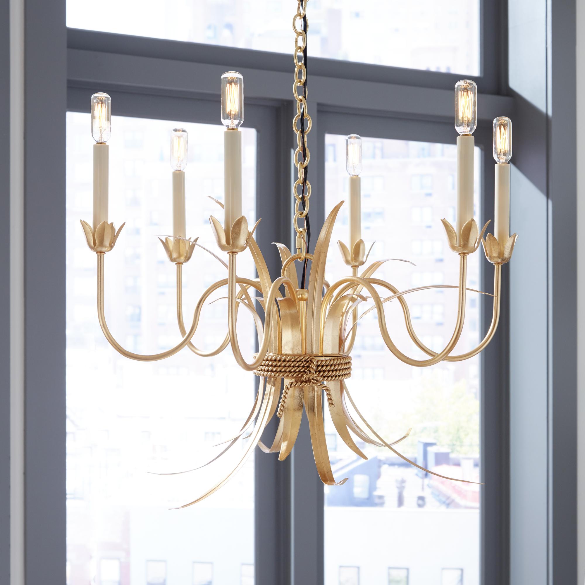Mignon Chandelier features leaves wrapped with a rope in gold leaf over iron. The six electrified candles will provide a soft, warm glow in any space.
