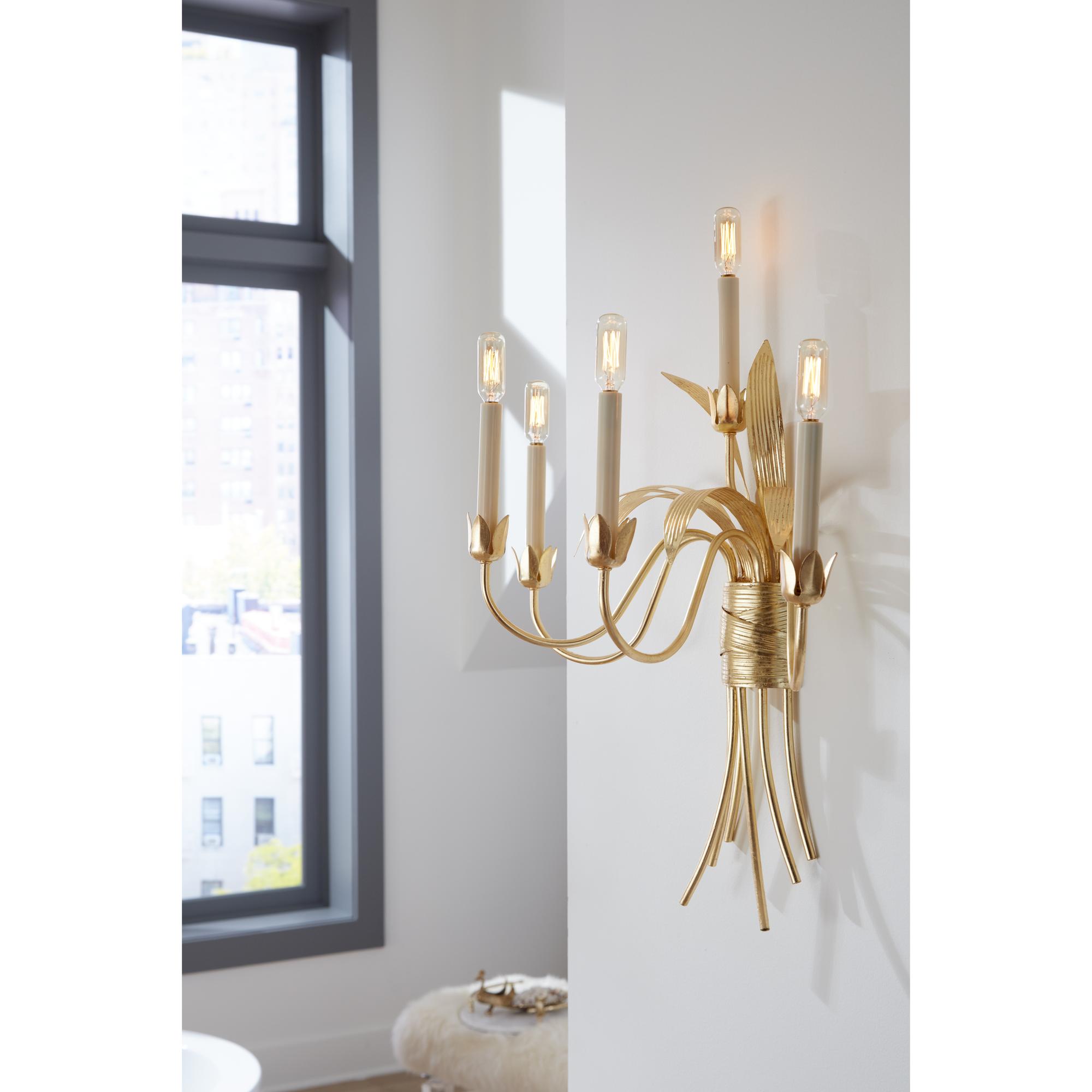 Gold leaf over iron with wrapped metal accents and electrified candles.