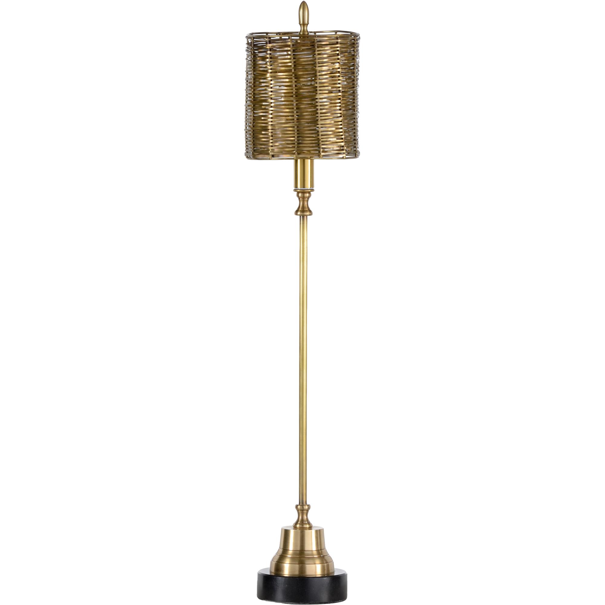 Enhance the modern aura in your home with Milo Lamp. Perfect for a small space, this brass lamp features a minimalist design with an intricate shade. The simple brass column is supported by a natural black marble base and is topped with a woven tarnished brass finished metal shade (Shade: 5″d x 5.5h)