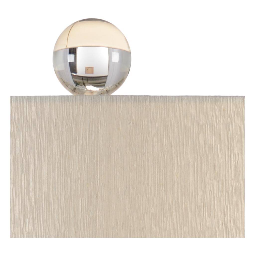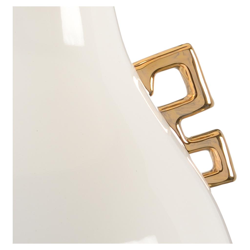 The Ming Lamp features a large, pear-shaped ceramic body with a white glazed finish, perched on a square gold leaf base. Elegant geometric handles and a classic drum shade complete this timeless design, blending sculptural form with modern sophistication.