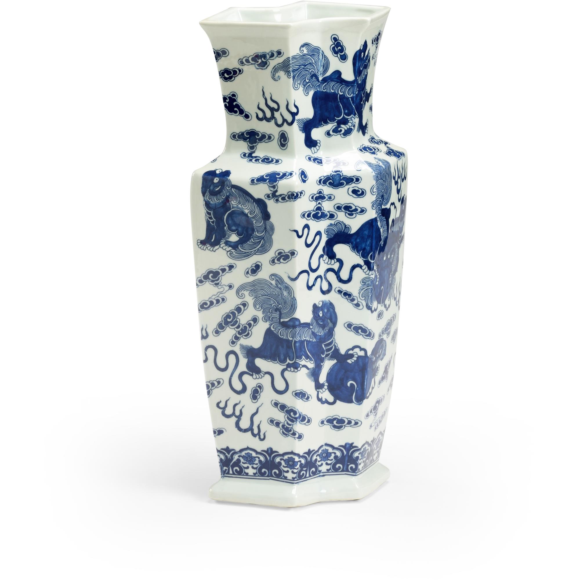 White glazed ceramic with hand-painted blue foo dog designs.