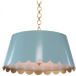Designed for Wildwood by Meg Braff Designs, this sleek pendant features a playful scalloped detailing suspended from a white chain. (Inside shade is gold). Mirasol pendant has three lights that will brighten a kitchen, sunroom or foyer. Comes with a 5″ canopy and 6′ of chain.