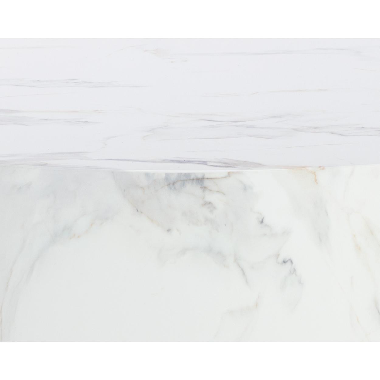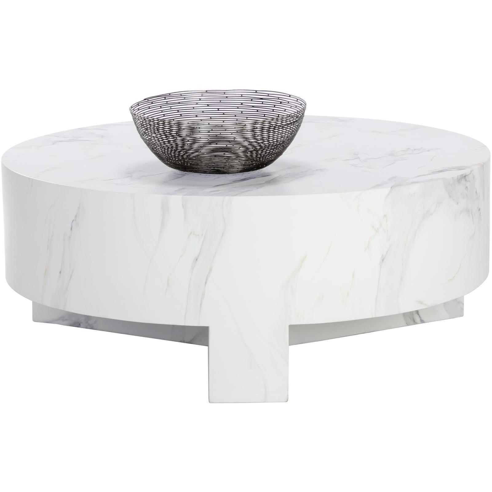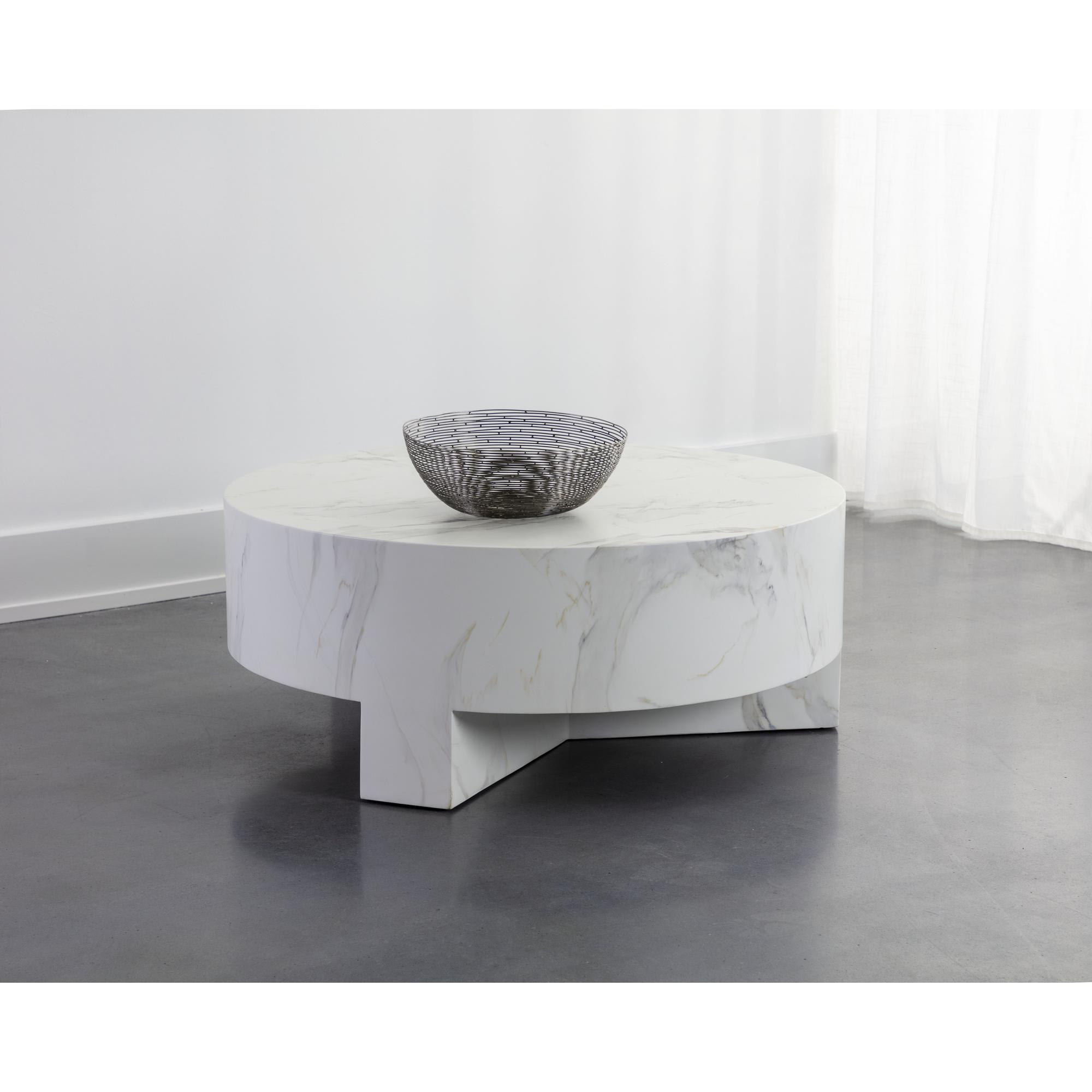 Infuse modern simplicity into any space with this alluring coffee table. Features a circular tabletop with a cutout base. Crafted from sealed concrete with a white Calacatta marble finish and its signature warm veining. This marble finish can have unique veining, pitting, fissures, micro-cracks and colour variations that add to the uniqueness and beauty of each piece.
